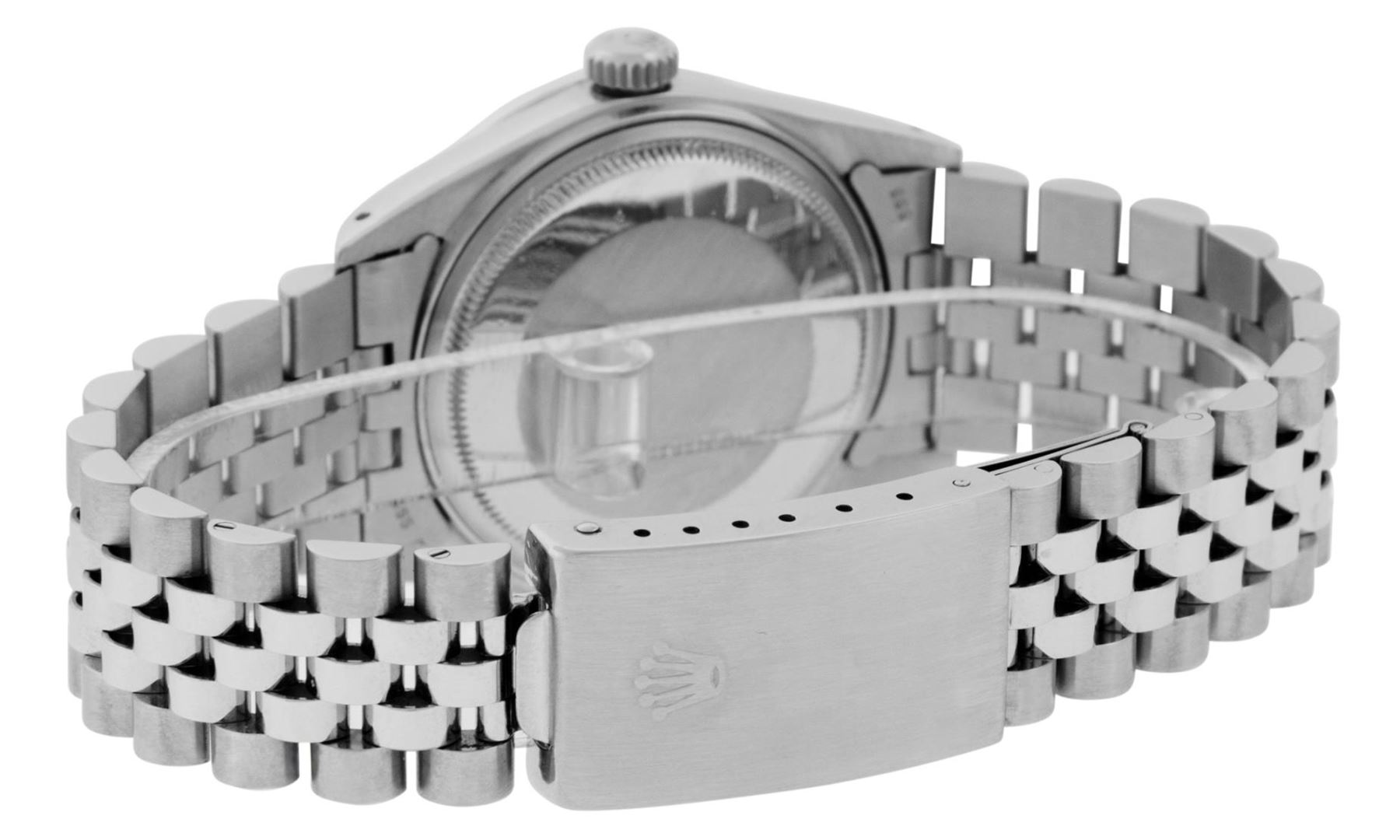 One Mens Pre Owned Rolex Datejust Polished Bright with Satin Finish, Serviced And Electronically Tested, Stainless Steel Case: 36mm, Custom Diamond Lugs: 28 Added Diamonds On Lugs. Stainless Steel Crown, Custom Bezel: 18K White Gold Diamond + Sapphire Beadset, Diamond Count: 36 Diamonds + 4 Sapphires. Custom Crystal: New Sapphire With Magnified Date Window. Custom Hands: New Luminescent Hands. Rolex Movement: Automatic Winding Movement 3035. Custom Dial: Custom Blue Dial With Added String Diamonds, Stone Count: 43 Diamonds On Dial. Date Window: 3 O'Clock Position Date Display, Quickset, Model: Quickset Datejust Condition: G-6 Extra Fine. Rolex Bracelet: Stainless Steel Jubilee Band. Bright Polish & Satin Finish. 7.0 Inch Length, Adjustable. Standard Clasp, With Rolex Logo. This Watch Has Been Serviced And Polished And Its Free Of All Dents And Scratches.