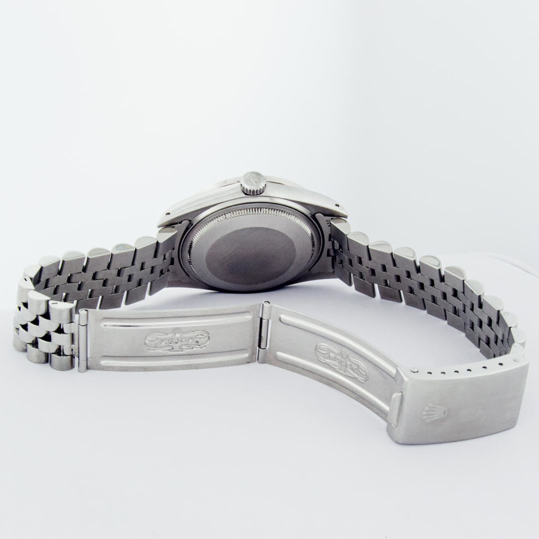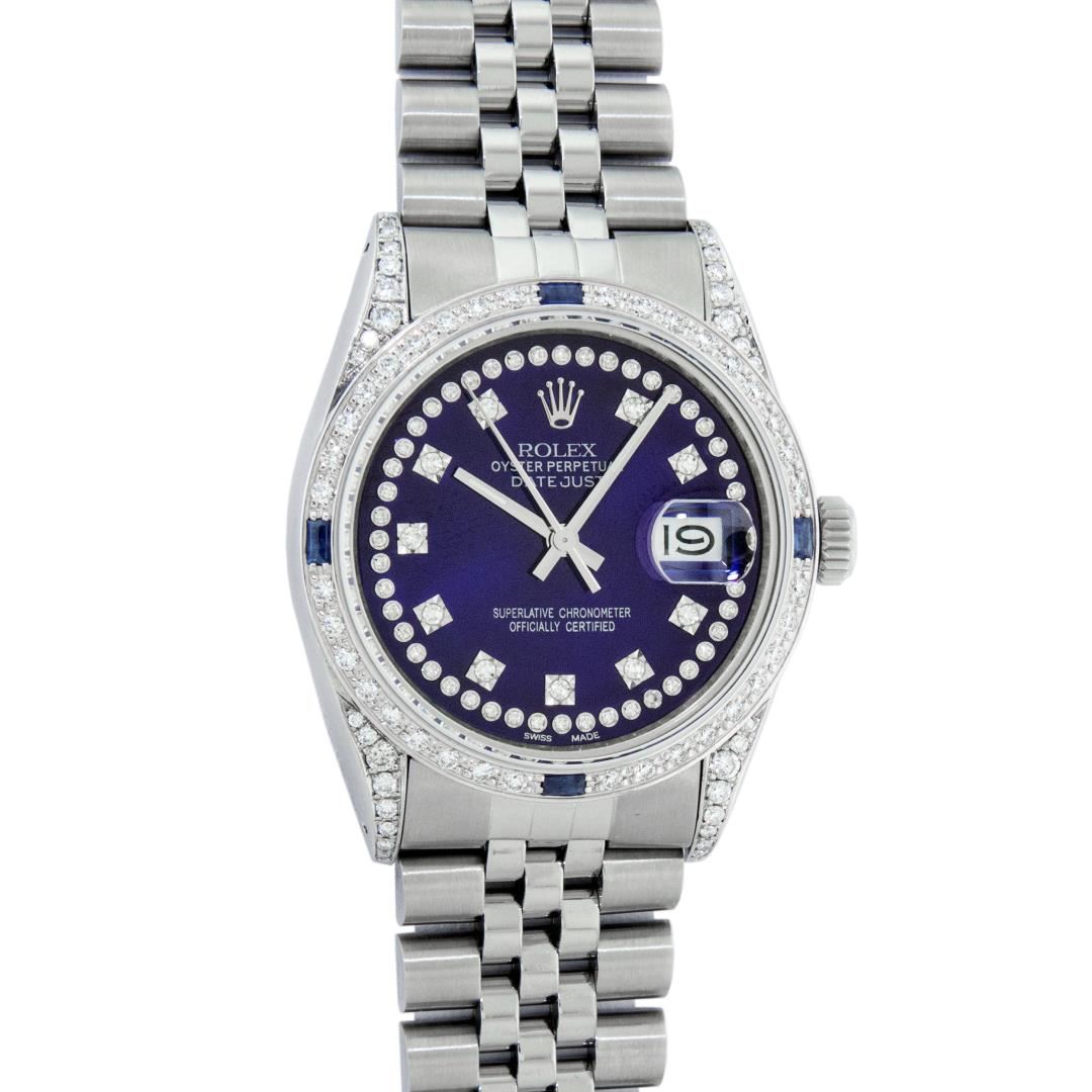 One Mens Pre Owned Rolex Datejust Polished Bright with Satin Finish, Serviced And Electronically Tested, Stainless Steel Case: 36mm, Custom Diamond Lugs: 28 Added Diamonds On Lugs. Stainless Steel Crown, Custom Bezel: 18K White Gold Diamond + Sapphire Beadset, Diamond Count: 36 Diamonds + 4 Sapphires. Custom Crystal: New Sapphire With Magnified Date Window. Custom Hands: New Luminescent Hands. Rolex Movement: Automatic Winding Movement 3035. Custom Dial: Custom Blue Dial With Added String Diamonds, Stone Count: 43 Diamonds On Dial. Date Window: 3 O'Clock Position Date Display, Quickset, Model: Quickset Datejust Condition: G-6 Extra Fine. Rolex Bracelet: Stainless Steel Jubilee Band. Bright Polish & Satin Finish. 7.0 Inch Length, Adjustable. Standard Clasp, With Rolex Logo. This Watch Has Been Serviced And Polished And Its Free Of All Dents And Scratches.