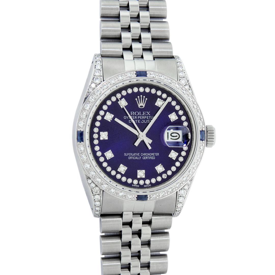 One Mens Rolex Datejust Polished Bright with Satin Finish, Serviced & Electronically Tested, Stainless Steel Case: 36mm, Custom Diamond Lugs: 28 Diamonds On Lugs, Color: G to H, Clarity: SI-VS. Stainless Steel Crown, Custom Bezel: 18K White Gold Diamond + Sapphire Beadset, Diamond Count: 36 Diamonds + 4 Sapphires, Total Weight 1.00 Carat, Clarity: SI-VS, Color: G to H. Custom Crystal: New Scratch Resistant Synthetic Sapphire Cyclops Lens. Custom Hands: New Luminescent Hands. Movement: Automatic Winding Movement. Custom Dial: Blue String Diamond Dial, Stone Count: 43 Diamonds On Dial, Diamond Color: G To H In Color, Clarity: VS. Date Window: 3 O'Clock Position Date Display, Quickset, Model: Datejust Condition: G-6 Extra Fine. Bracelet: Stainless Steel Jubilee Band. Bright Polish & Satin Finish. 7.0 Inch Length, Adjustable. Standard Clasp, With Rolex Logo. This Watch Has Been Serviced And Polished And Its Free Of All Dents And Scratches.