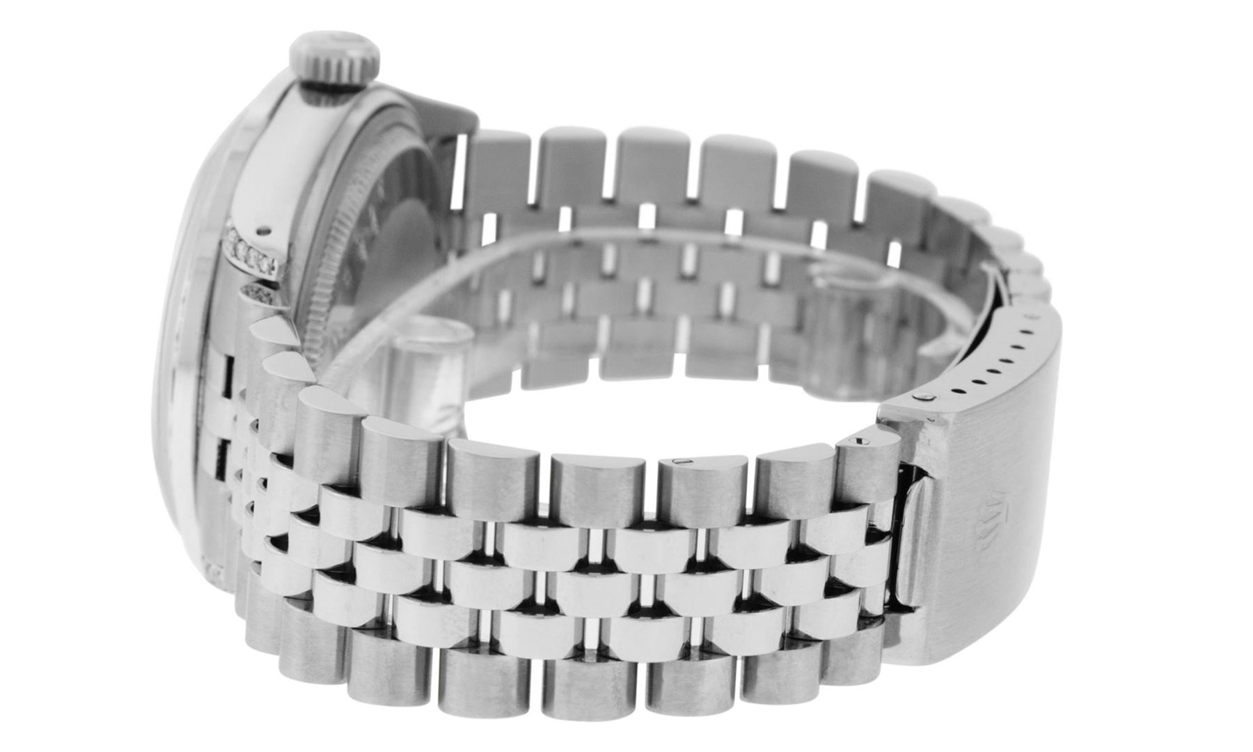 One Mens Rolex Datejust Polished Bright with Satin Finish, Serviced & Electronically Tested, Stainless Steel Case: 36mm, Custom Diamond Lugs: 28 Diamonds On Lugs, Color: G to H, Clarity: SI-VS. Stainless Steel Crown, Custom Bezel: 18K White Gold Diamond + Sapphire Beadset, Diamond Count: 36 Diamonds + 4 Sapphires, Total Weight 1.00 Carat, Clarity: SI-VS, Color: G to H. Custom Crystal: New Scratch Resistant Synthetic Sapphire Cyclops Lens. Custom Hands: New Luminescent Hands. Movement: Automatic Winding Movement. Custom Dial: Blue String Diamond Dial, Stone Count: 43 Diamonds On Dial, Diamond Color: G To H In Color, Clarity: VS. Date Window: 3 O'Clock Position Date Display, Quickset, Model: Datejust Condition: G-6 Extra Fine. Bracelet: Stainless Steel Jubilee Band. Bright Polish & Satin Finish. 7.0 Inch Length, Adjustable. Standard Clasp, With Rolex Logo. This Watch Has Been Serviced And Polished And Its Free Of All Dents And Scratches.