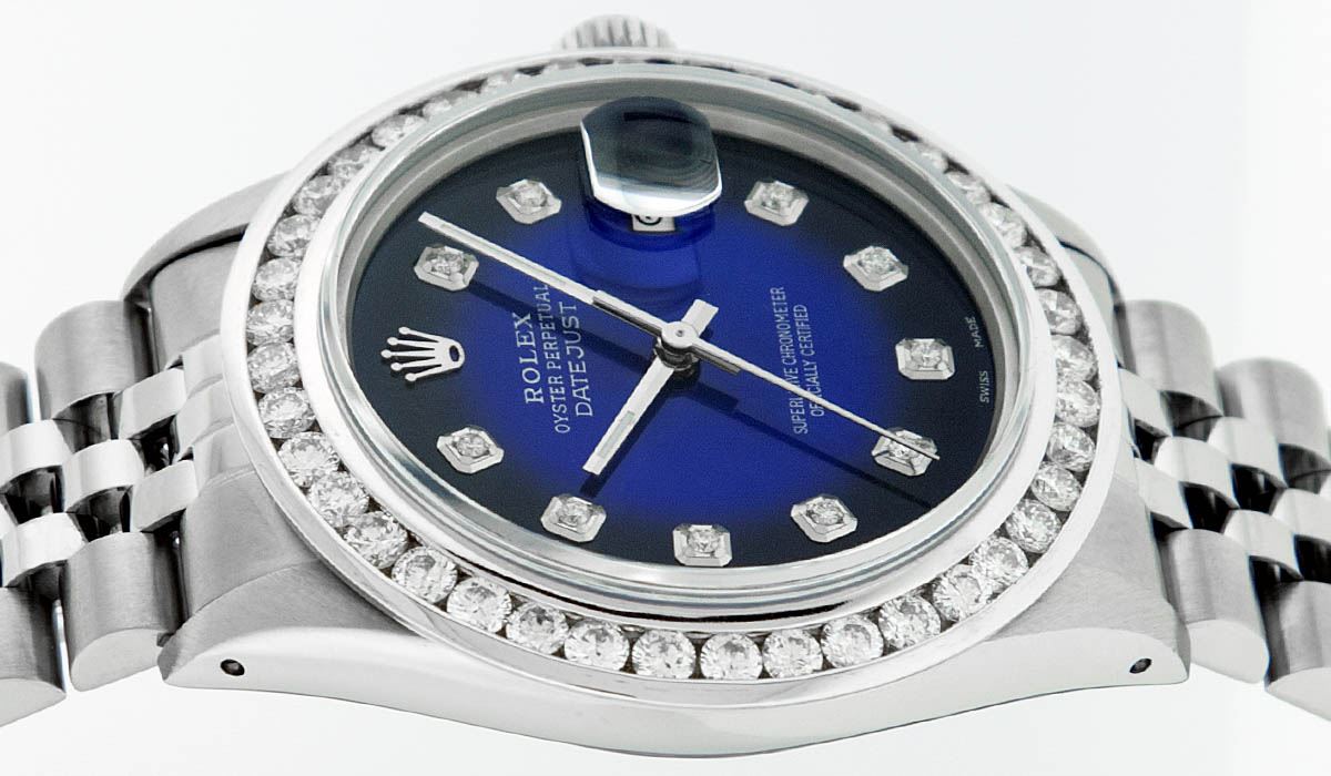 One Mens Rolex Datejust Polished Bright with Satin Finish, Serviced & Electronically Tested, Stainless Steel Case:36mm, Stainless Steel Crown, Custom Bezel: 18K White Gold 3ct Channel Set Diamond Bezel, Diamond Count: 40 Diamonds, Total Weight 3.00 Carat, Clarity: SI-VS, Color: G to H. Custom Crystal: Synthetic Sapphire Cyclops Lens. Movement: Automatic Winding Movement Caliber 3035. Custom Dial: Blue Vignette Diamond Dial, Diamond Count: 10 Diamonds In Dial, Diamond Color: G To H In Color, Clarity: SI-VS. Date Window: 3 O'Clock Position Date Display, Quickset, Model: Datejust Condition: G-6 Extra Fine. Bracelet: Stainless Steel Jubilee Band. Bright Polish & Satin Finish. 7.0 Inch Length, Adjustable. Standard Clasp, With Rolex Logo.