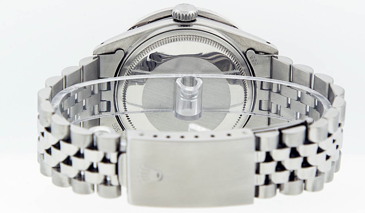 One Mens Rolex Datejust Polished Bright with Satin Finish, Serviced & Electronically Tested, Stainless Steel Case:36mm, Stainless Steel Crown, Custom Bezel: 18K White Gold 3ct Channel Set Diamond Bezel, Diamond Count: 40 Diamonds, Total Weight 3.00 Carat, Clarity: SI-VS, Color: G to H. Custom Crystal: Synthetic Sapphire Cyclops Lens. Movement: Automatic Winding Movement Caliber 3035. Custom Dial: Blue Vignette Diamond Dial, Diamond Count: 10 Diamonds In Dial, Diamond Color: G To H In Color, Clarity: SI-VS. Date Window: 3 O'Clock Position Date Display, Quickset, Model: Datejust Condition: G-6 Extra Fine. Bracelet: Stainless Steel Jubilee Band. Bright Polish & Satin Finish. 7.0 Inch Length, Adjustable. Standard Clasp, With Rolex Logo.