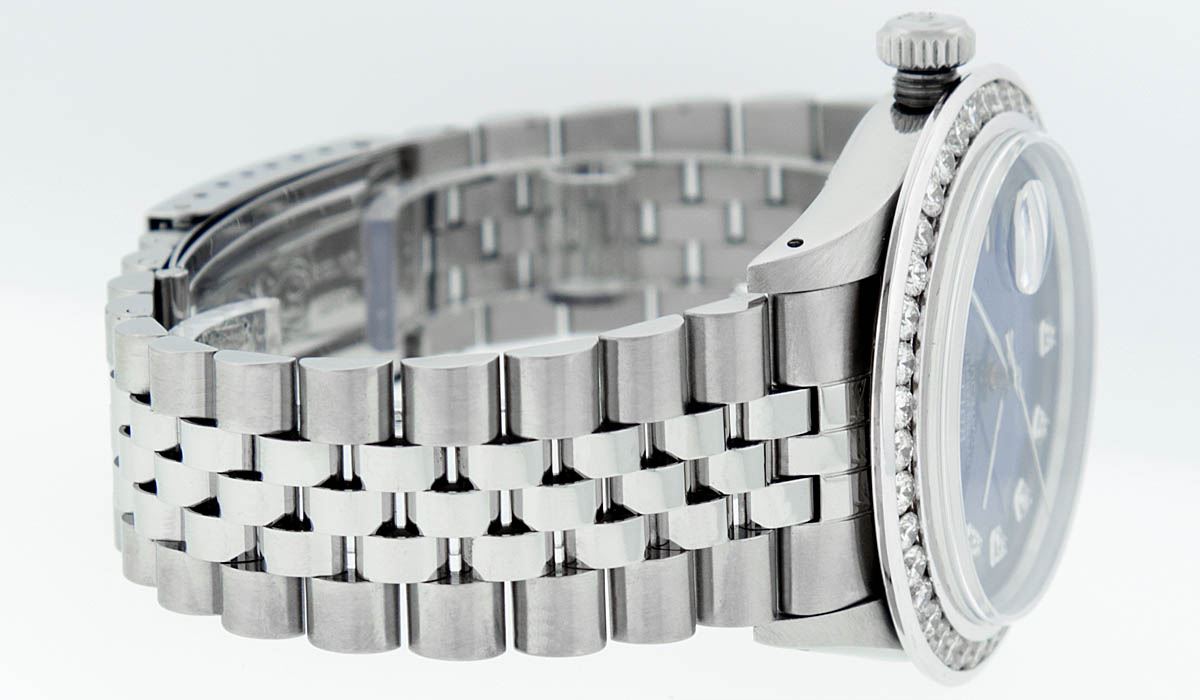 One Mens Rolex Datejust Polished Bright with Satin Finish, Serviced & Electronically Tested, Stainless Steel Case:36mm, Stainless Steel Crown, Custom Bezel: 18K White Gold 3ct Channel Set Diamond Bezel, Diamond Count: 40 Diamonds, Total Weight 3.00 Carat, Clarity: SI-VS, Color: G to H. Custom Crystal: Synthetic Sapphire Cyclops Lens. Movement: Automatic Winding Movement Caliber 3035. Custom Dial: Blue Vignette Diamond Dial, Diamond Count: 10 Diamonds In Dial, Diamond Color: G To H In Color, Clarity: SI-VS. Date Window: 3 O'Clock Position Date Display, Quickset, Model: Datejust Condition: G-6 Extra Fine. Bracelet: Stainless Steel Jubilee Band. Bright Polish & Satin Finish. 7.0 Inch Length, Adjustable. Standard Clasp, With Rolex Logo.