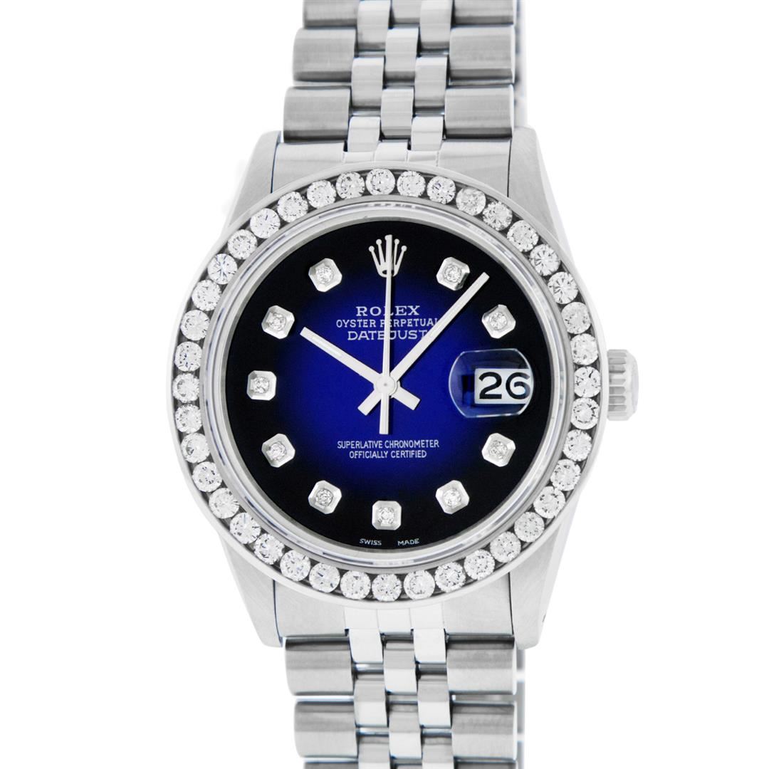 One Mens Stainless Steel Rolex Datejust Polished Bright with Satin Finish, Fully Serviced & Electronically Tested, Stainless Steel Case:36mm, Stainless Steel Crown, Custom Bezel: 18K White Gold 3.00 Ctw Diamond Bezel, Diamond Count: 40 Diamonds, Total Weight 3.0 Carat, Clarity: SI-VS, Color: G to H. Custom Crystal: New Scratch Resistant Synthetic Sapphire Cyclops Lens. Custom Hands: New Luminecent Hands. Movement: Automatic Winding Movement. Custom Dial: Blue Vignette Diamond Dial, 10 Diamonds in Dial, G To H In Color, Clarity: SI-VS. Date Window: 3 O'Clock Position Date Display, Quickset, Model: Datejust 36mm, Condition: G-6 Extra Fine. Bracelet: Rolex Stainless Steel Jubilee Band. Bright Polish & Satin Finish. 7.0 Inch Length, Adjustable. Standard Clasp, With Rolex Logo. Watch Has Been Serviced And Polished It Is Free Of All Scratches And Dents.
