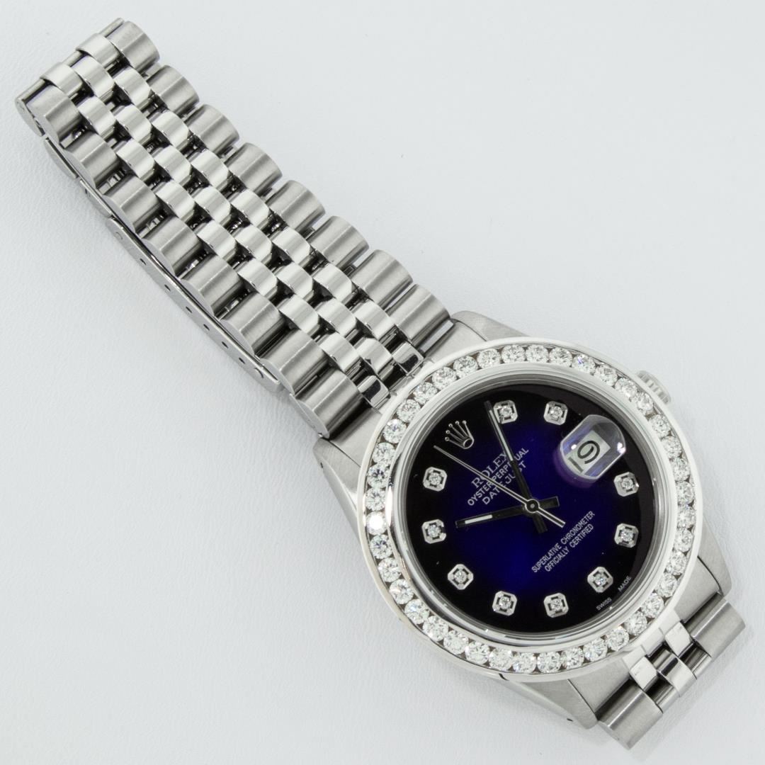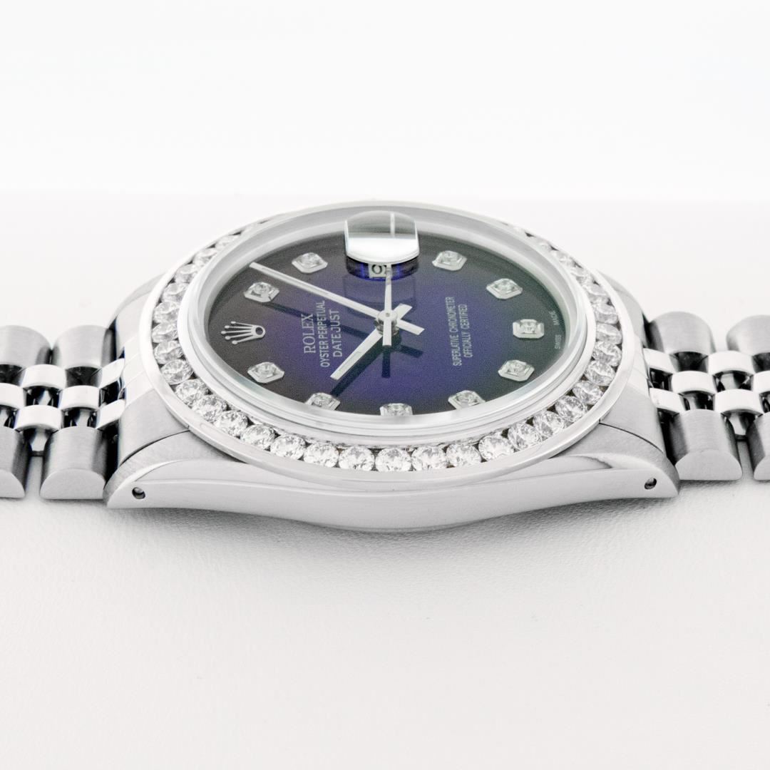 One Mens Pre Owned Stainless Steel Rolex Datejust Polished Bright with Satin Finish, Fully Serviced & Electronically Tested, Rolex Stainless Steel Case: 36mm, Rolex Stainless Steel Crown, Custom Bezel: New 18K White Gold 3.00 Ctw Diamond Bezel, Diamond Count: 40 Diamonds, Total Weight 3.0 Carat. Custom Crystal: New Sapphire With Magnified Date Window. Custom Hands: New Luminescent Hands. Rolex Movement: Automatic Winding Movement 3035. Custom Dial: Custom Blue Vignette Dial With Added Diamond Hour Markers, 10 Diamonds On Dial. Date Window: 3 O'Clock Position Date Display, Quickset, Model: Datejust 36mm, Condition: G-6 Extra Fine. Rolex Bracelet: Rolex Stainless Steel Jubilee Band. Bright Polish And Satin Finish. 7.0 Inch Length, Adjustable. Standard Clasp, With Rolex Logo. This Watch Has Been Serviced And Polished It Is Free Of All Scratches And Dents.