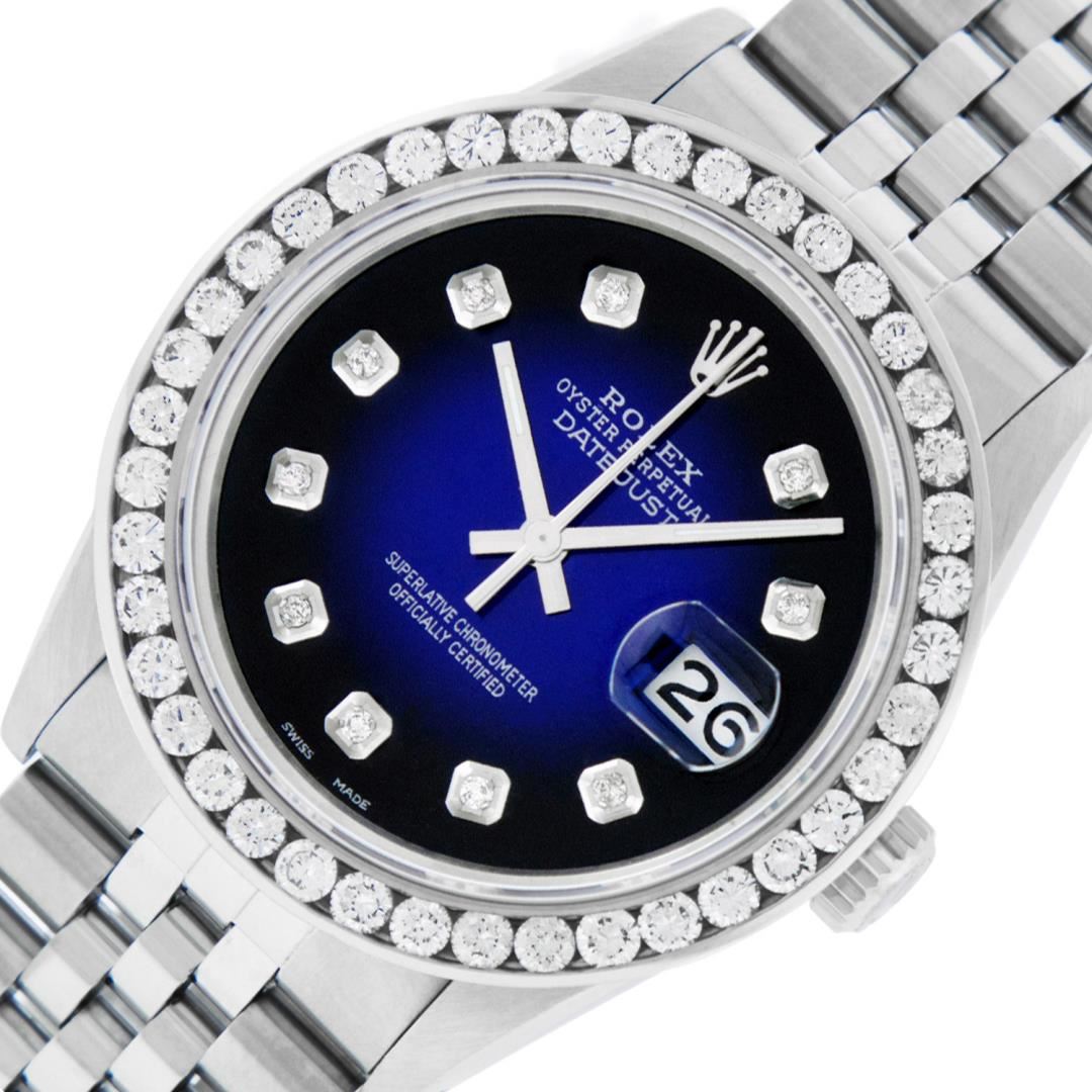One Mens Pre Owned Stainless Steel Rolex Datejust Polished Bright with Satin Finish, Fully Serviced & Electronically Tested, Rolex Stainless Steel Case: 36mm, Rolex Stainless Steel Crown, Custom Bezel: New 18K White Gold 3.00 Ctw Diamond Bezel, Diamond Count: 40 Diamonds, Total Weight 3.0 Carat. Custom Crystal: New Sapphire With Magnified Date Window. Custom Hands: New Luminescent Hands. Rolex Movement: Automatic Winding Movement 3035. Custom Dial: Custom Blue Vignette Dial With Added Diamond Hour Markers, 10 Diamonds On Dial. Date Window: 3 O'Clock Position Date Display, Quickset, Model: Datejust 36mm, Condition: G-6 Extra Fine. Rolex Bracelet: Rolex Stainless Steel Jubilee Band. Bright Polish And Satin Finish. 7.0 Inch Length, Adjustable. Standard Clasp, With Rolex Logo. This Watch Has Been Serviced And Polished It Is Free Of All Scratches And Dents.