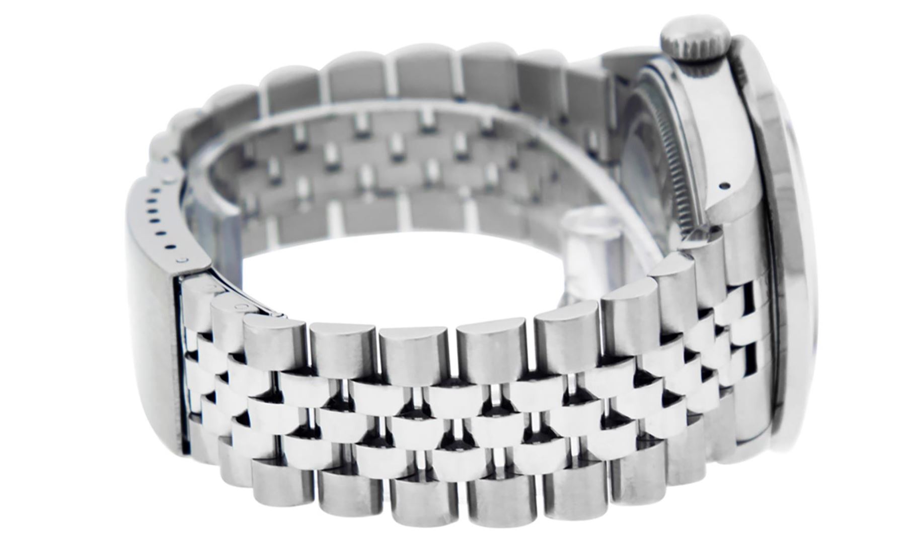 One Mens Pre Owned Stainless Steel Rolex Datejust Polished Bright with Satin Finish, Fully Serviced & Electronically Tested, Rolex Stainless Steel Case: 36mm, Rolex Stainless Steel Crown, Custom Bezel: New 18K White Gold 3.00 Ctw Diamond Bezel, Diamond Count: 40 Diamonds, Total Weight 3.0 Carat. Custom Crystal: New Sapphire With Magnified Date Window. Custom Hands: New Luminescent Hands. Rolex Movement: Automatic Winding Movement 3035. Custom Dial: Custom Blue Vignette Dial With Added Diamond Hour Markers, 10 Diamonds On Dial. Date Window: 3 O'Clock Position Date Display, Quickset, Model: Datejust 36mm, Condition: G-6 Extra Fine. Rolex Bracelet: Rolex Stainless Steel Jubilee Band. Bright Polish And Satin Finish. 7.0 Inch Length, Adjustable. Standard Clasp, With Rolex Logo. This Watch Has Been Serviced And Polished It Is Free Of All Scratches And Dents.