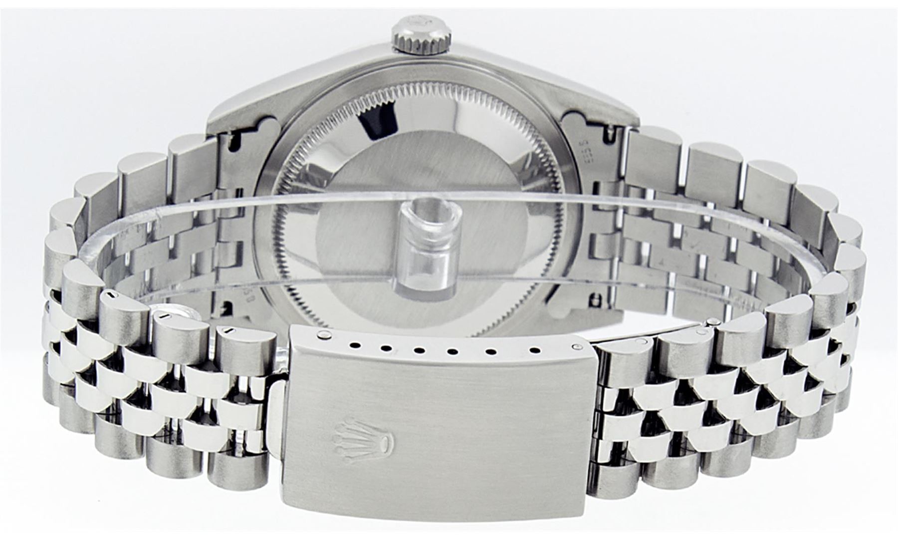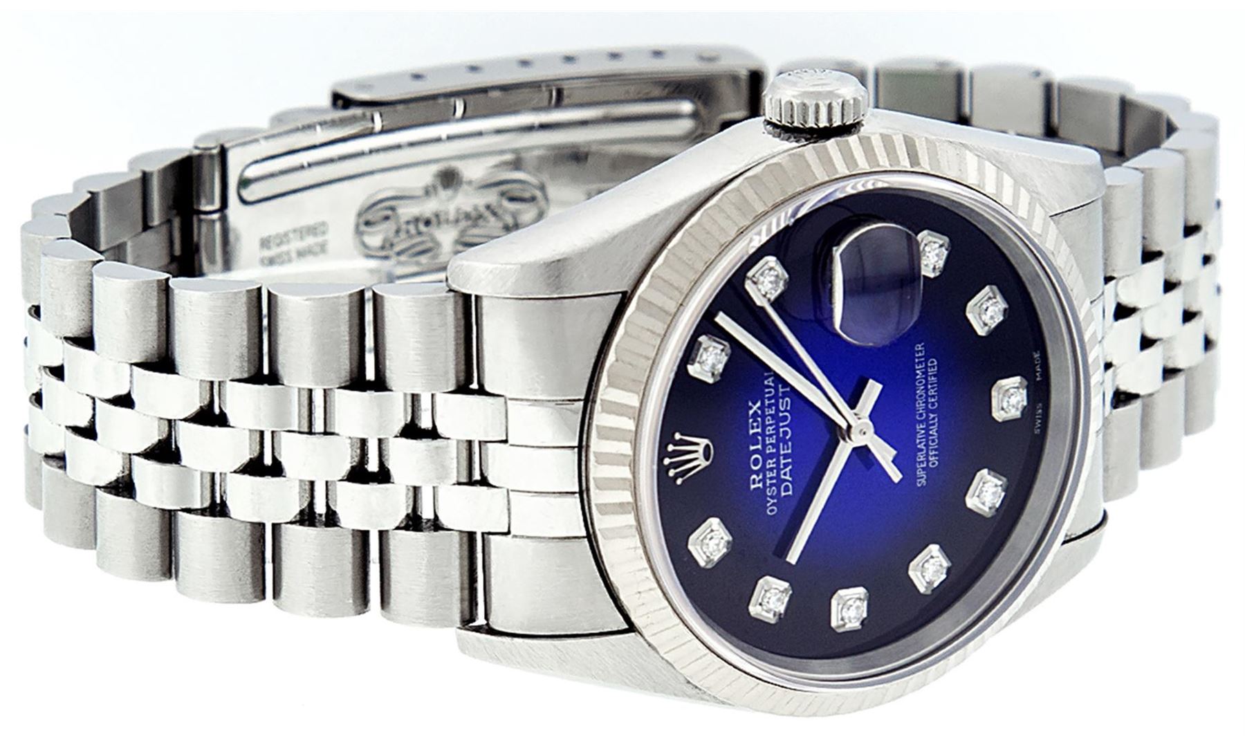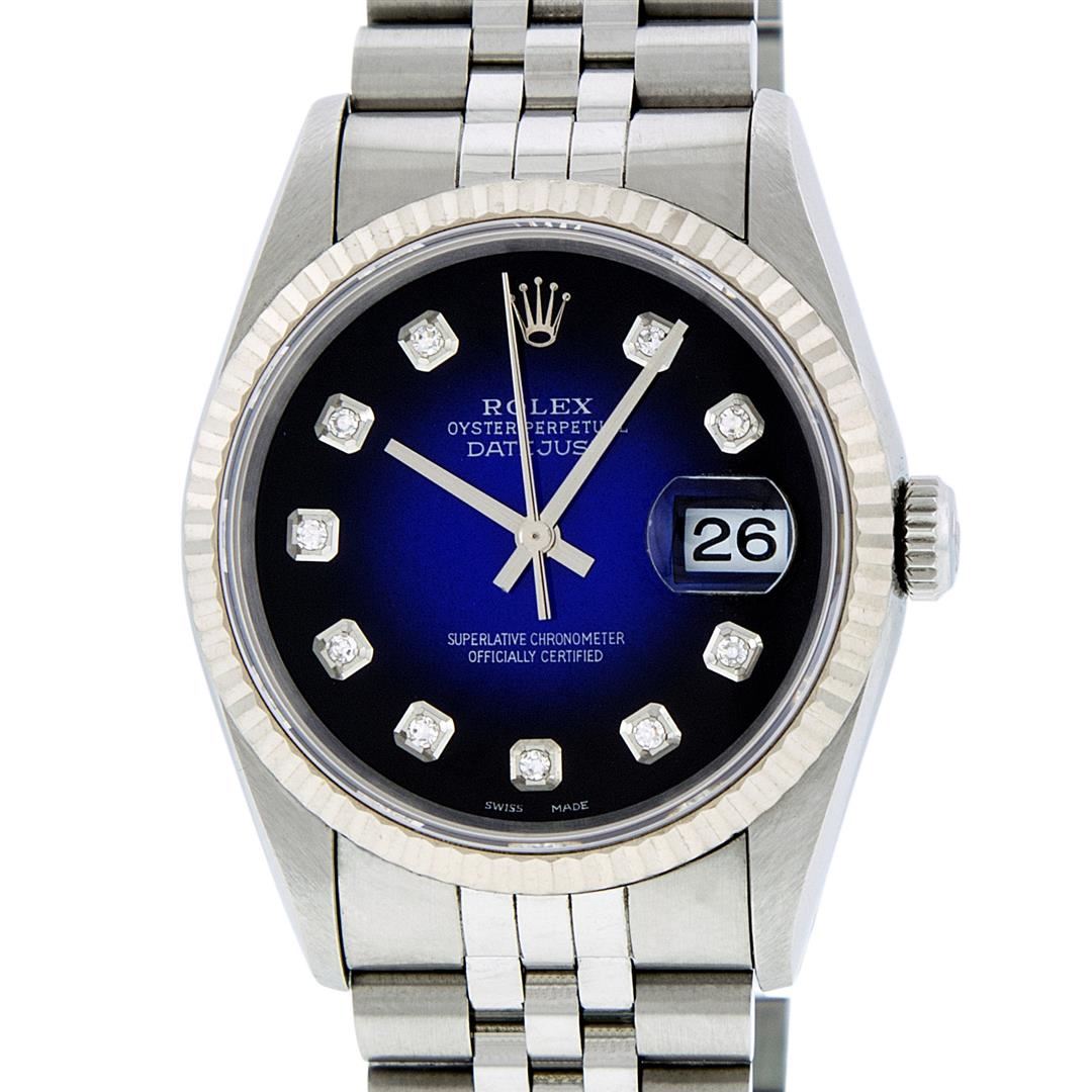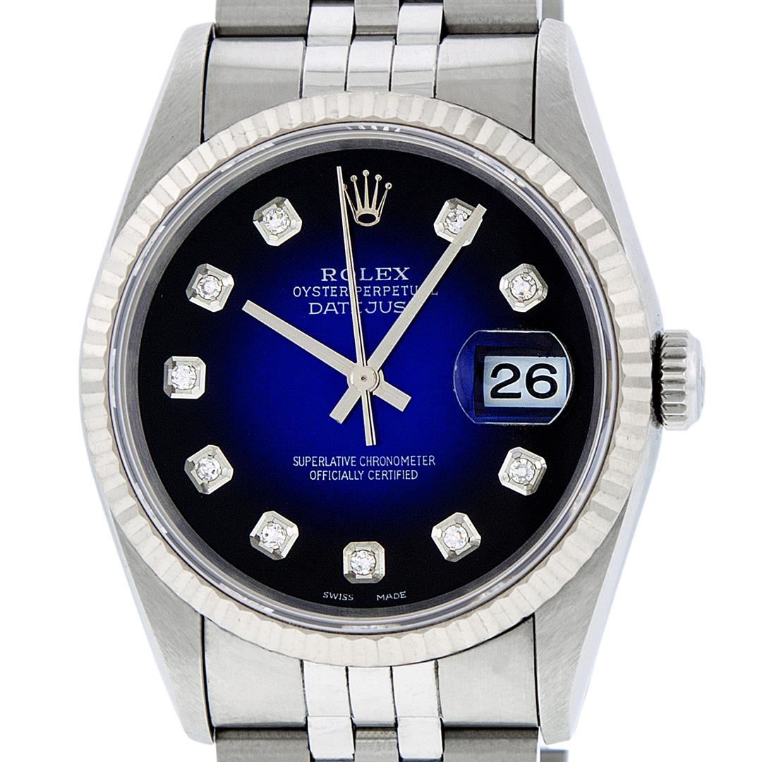 One Mens Pre Owned Stainless Steel Rolex Datejust Polished Bright with Satin Finish, This Watch Has Been Serviced & Electronically Tested, Stainless Steel Case: 36mm, Stainless Steel Crown, Original Bezel: 14K White Gold Fluted Bezel. Custom Crystal: New Sapphire With Magnified Date Window. Custom Hands: New Luminescent Hands. Rolex Movement: Automatic Winding Movement Caliber 3135. Custom Dial: Blue Vignette With Custom Added Diamond Hour Markers, Diamond Count: 10 Diamonds On Dial. Date Window: 3 O'Clock Position Date Display, Quickset, Model: Datejust, Condition: G-6 Extra Fine. Rolex Bracelet: Stainless Steel Jubilee Band. Bright Polish & Satin Finish. 7.0 Inch Length, Adjustable. Standard Clasp, With Rolex Logo. This Watch Has Been Serviced Time Tested And Is In Excellent Condition It Is Free Of All Scratches And Dents.