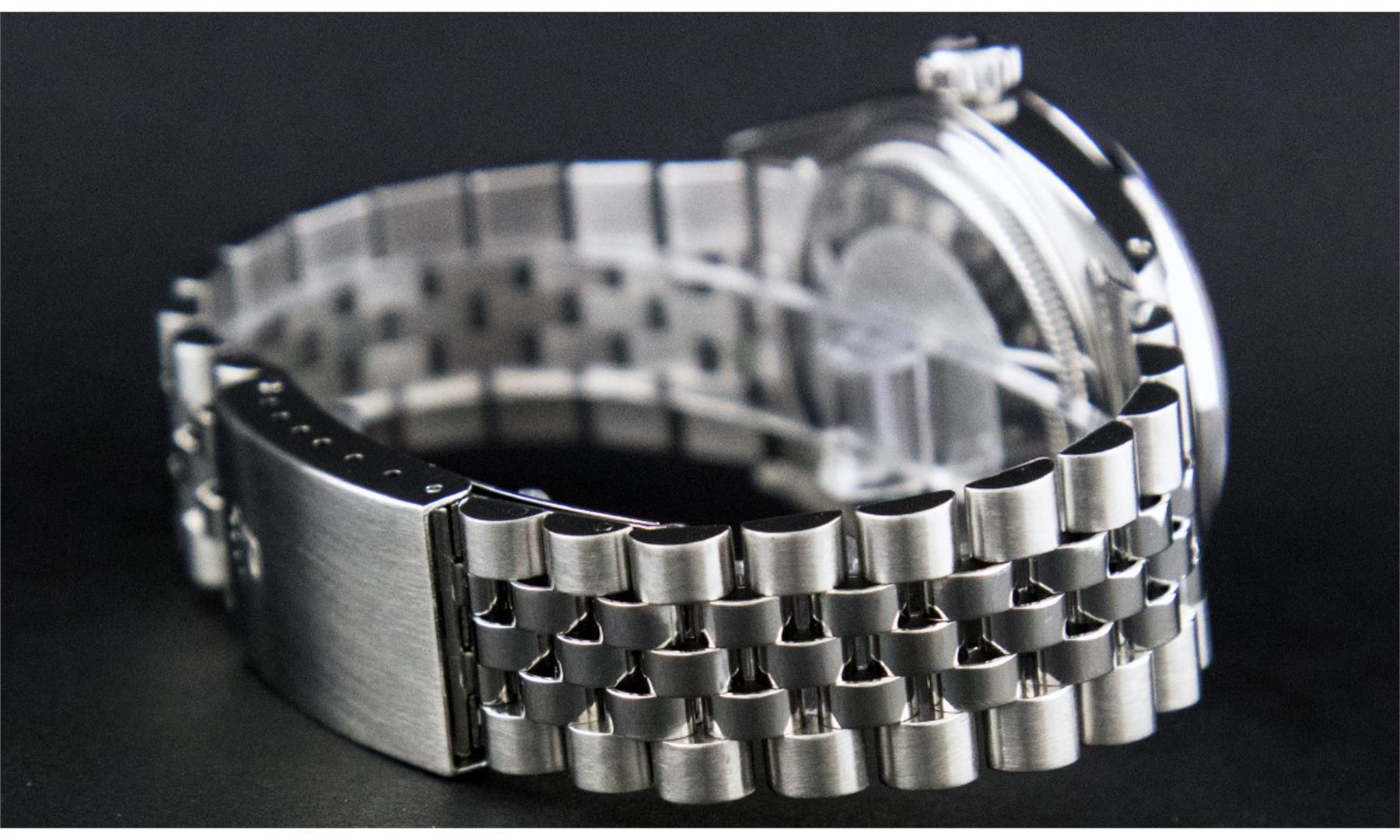 One Pre Owned Rolex Stainless Steel 36MM Datejust Polished Bright with Satin Finish, Rolex Stainless Steel Case: 36mm, Rolex Stainless Steel Crown, Custom Bezel: New 18K White Gold Sapphire Beadset Diamond Bezel. Custom Crystal: New Sapphire With Date Window. Custom Hands: New Luminescent Hands. Rolex Movement: Automatic Winding Movement 3035. Custom Dial: Custom Blue Vignette With Added Diamond Hour Markers, Diamond Count: 10 Diamonds in Dial. Date Window: 3 O'Clock Position Date Display, Quickset, Model: Quickset Datejust, Condition: G-6 Extra Fine. Rolex Bracelet: Stainless Steel Jubilee Band. Bracelet: 7.0 Inch Length, Adjustable. Fold Clasp, With Rolex Logo. This Watch Has Been Serviced Time Tested And Is In Excellent Condition It Is Free Of All Scratches And Dents.