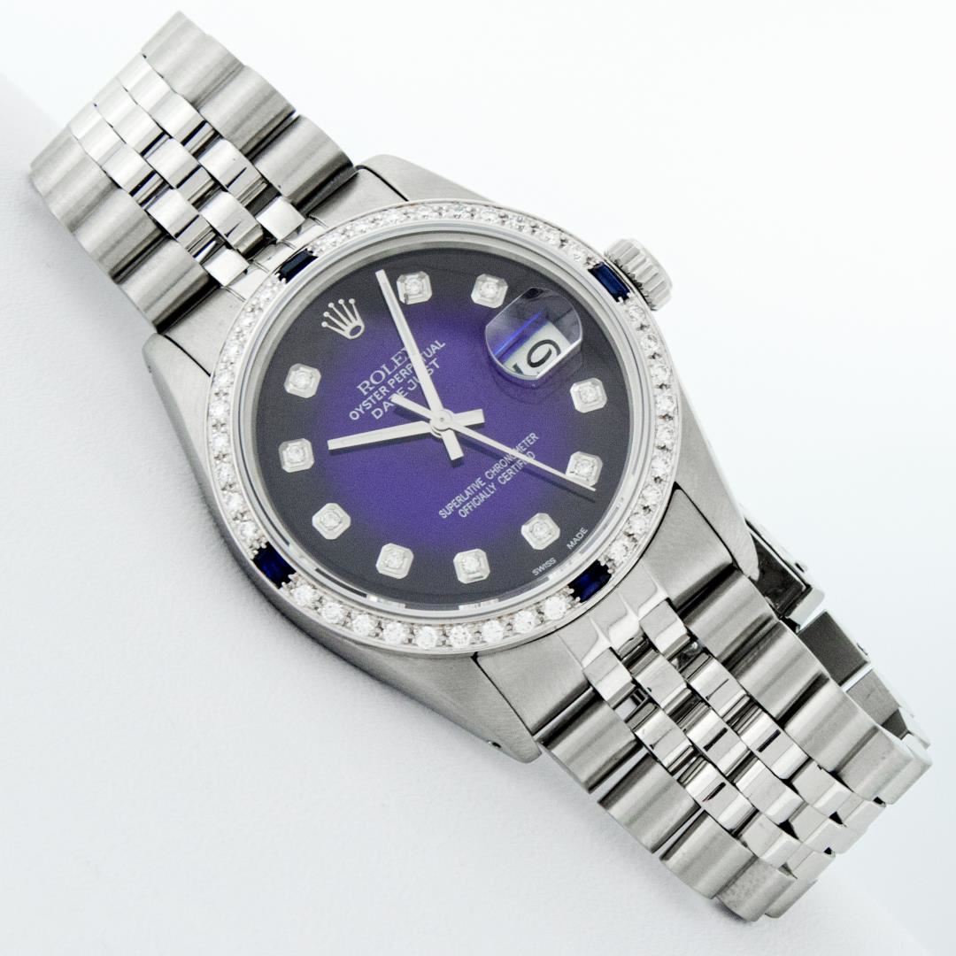 One Pre Owned Rolex Stainless Steel 36MM Datejust Polished Bright with Satin Finish, Rolex Stainless Steel Case: 36mm, Rolex Stainless Steel Crown, Custom Bezel: New 18K White Gold Sapphire Beadset Diamond Bezel. Custom Crystal: New Sapphire With Date Window. Custom Hands: New Luminescent Hands. Rolex Movement: Automatic Winding Movement 3035. Custom Dial: Custom Blue Vignette With Added Diamond Hour Markers, Diamond Count: 10 Diamonds in Dial. Date Window: 3 O'Clock Position Date Display, Quickset, Model: Quickset Datejust, Condition: G-6 Extra Fine. Rolex Bracelet: Stainless Steel Jubilee Band. Bracelet: 7.0 Inch Length, Adjustable. Fold Clasp, With Rolex Logo. This Watch Has Been Serviced Time Tested And Is In Excellent Condition It Is Free Of All Scratches And Dents.