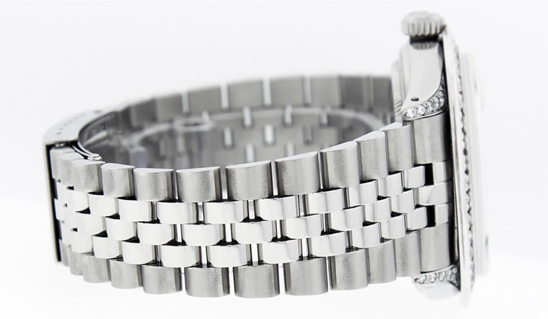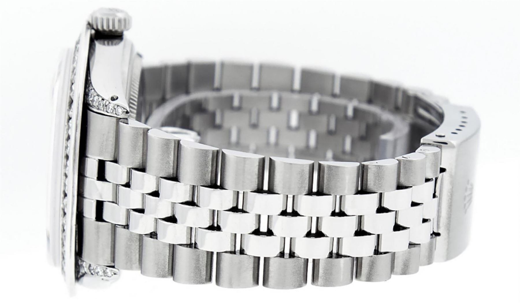 One Mens Pre Owned Stainless Steel Rolex Datejust Polished Bright with Satin Finish, Serviced & Electronically Tested, Stainless Steel Case: 36mm, Custom Diamond Lugs: 24 Diamonds On Lugs, Color: G to H, Clarity: SI-VS. Stainless Steel Crown, New Custom Bezel: 18K White Gold 3.00 Ctw Channel Set Diamond Bezel, Diamond Count: 40 Diamonds On Bezel, Total Bezel Weight 3.0 Carat, Clarity: SI-VS, Color: G to H. New Custom Crystal: New Sapphire With Date Window. Rolex Movement: Automatic Winding Movement. Custom Dial: Refinished To Blue Vignette With Custom Added Single Cut String Diamond Dial, Diamond Count: 58 Diamonds In Dial, Diamond Color: G To H In Color, Clarity: SI-VS. Date Window: 3 O'Clock Position Date Display, Quickset, Model: Quickset Datejust, Condition: G-6 Extra Fine. Rolex Bracelet: Stainless Steel Jubilee Band. Bright Polish & Satin Finish. 7.0 Inch Length, Adjustable. Standard Clasp, With Rolex Logo. This Watch Has Been Serviced Time Tested And Is In Excellent Condition It Is Free Of All Scratches And Dents.