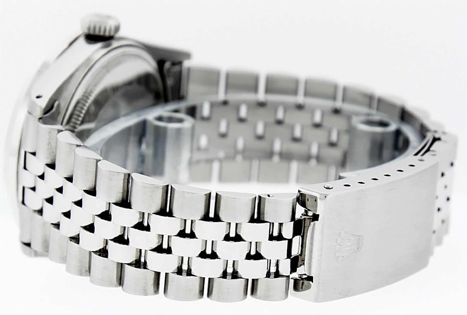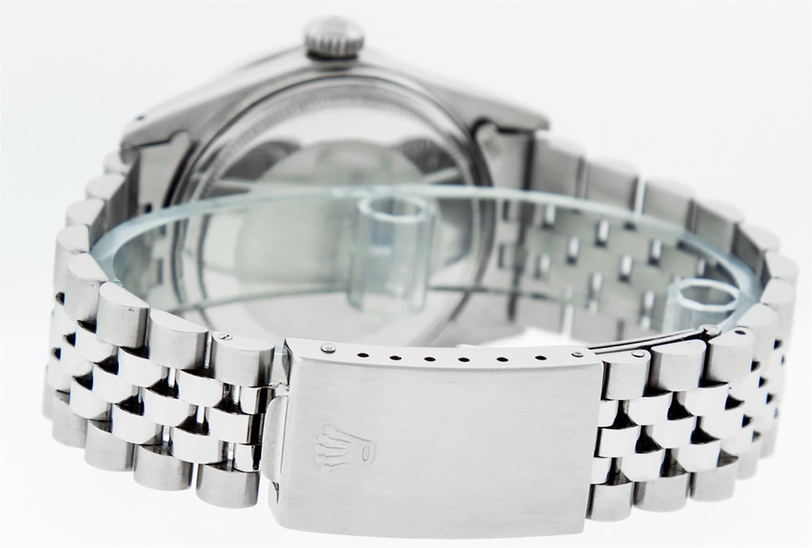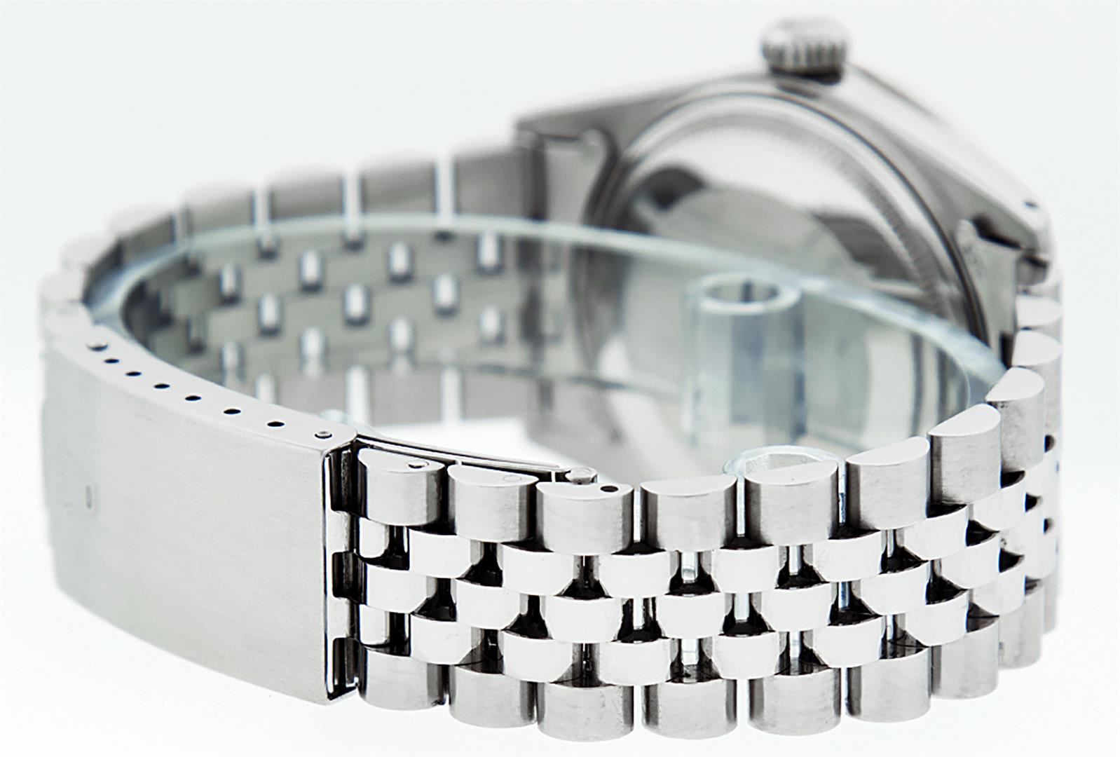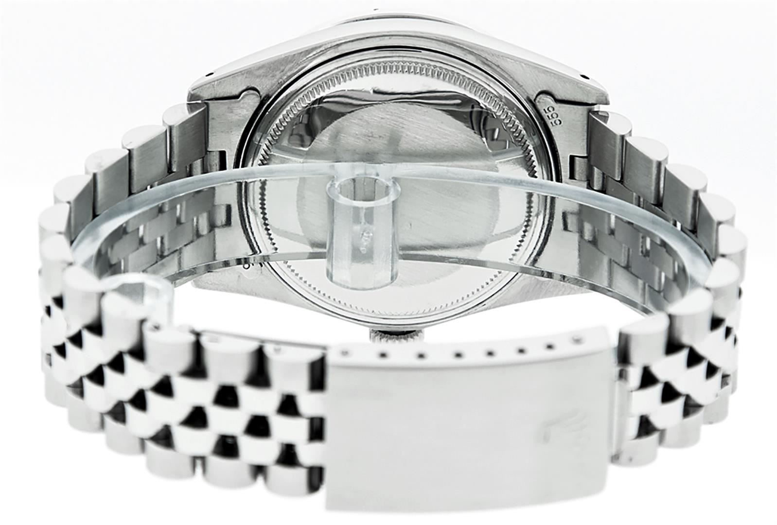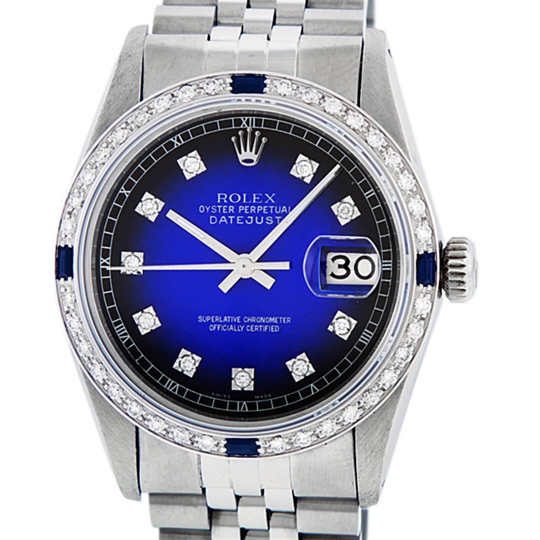 One Mens Stainless Steel Rolex Datejust Polished, Serviced & Electronically Tested, Stainless Steel Case: 36mm, Stainless Steel Crown, Custom Bezel: New 18K White Gold Sapphire Beadset Diamond Bezel, Diamond + Gem Count: 36 Diamonds + 4 Sapphires Total Weight 1.00 Carat, Clarity: SI-VS, Color: G to H. Custom Crystal: New Scratch Resistant Synthetic Sapphire Cyclops Lens. Custom Hands: New Luminescent Hands. Movement: Automatic Winding Movement. Custom Dial: Blue Vignette With Diamond Hour Markers & Roman Track, 10 Diamonds in Dial, G To H In Color, Clarity: SI-VS. Date Window: 3 O'Clock Position Date Display, Quickset, Model: Datejust. Condition: G-6 Extra Fine. Bracelet: Stainless Steel Jubilee. Bright Polish & Satin Finish. 7.0 Inch Length, Adjustable. Standard Clasp, With Rolex Logo. This Watch Has Been Serviced Time Tested And Is In Excellent Condition It Is Free Of All Scratches And Dents.
