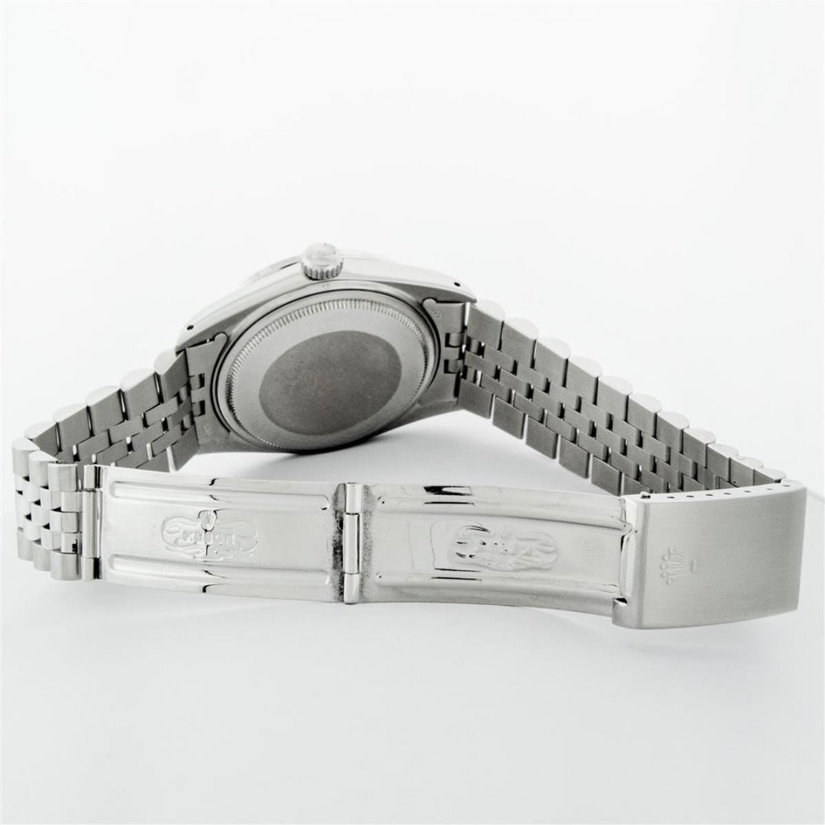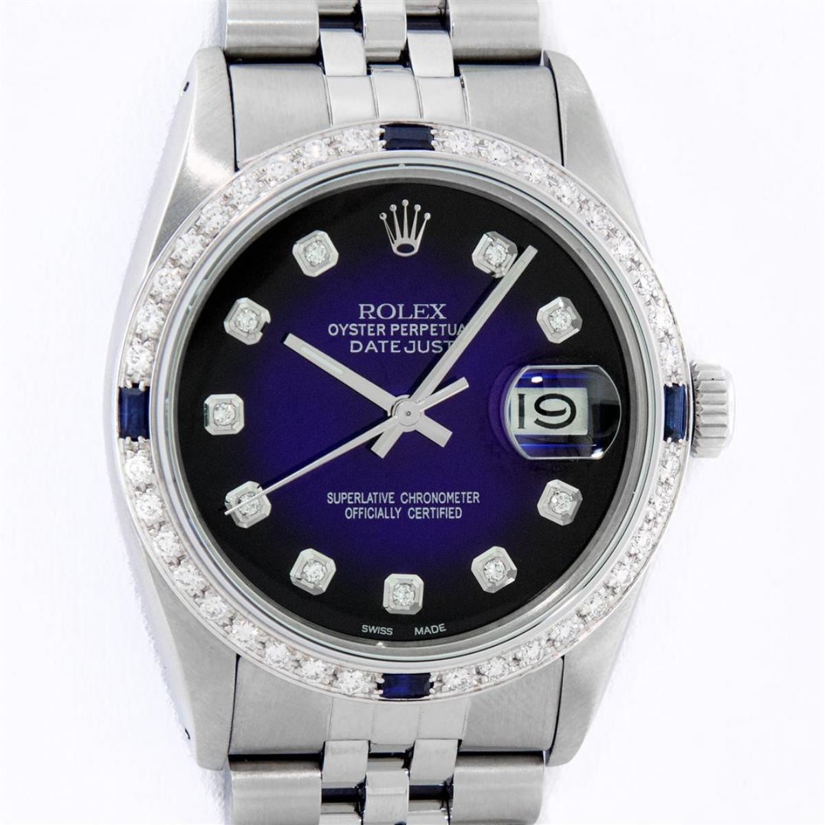 One Mens Rolex Datejust Polished Bright with Satin Finish, This Watch Has Been Serviced & Electronically Tested, Stainless Steel Case: 36mm, Stainless Steel Crown, Custom Bezel: New 18K White Gold Sapphire Beadset Diamond Bezel, Diamond + Gem Count: 36 Diamonds + 4 Sapphires Total Weight 1.00 Carat, Clarity: Si-VS, Color: G to H. Custom Crystal: New Synthetic Sapphire Cyclops Lens. Custom Hands: New Luminescent Hands. Movement: Automatic Winding Movement. Custom Dial: Blue Vignette With Diamond Hour Markers, Diamond Count: 10 Diamonds in Dial, Diamond Color: G To H In Color, Clarity: Si-VS. Date Window: 3 O'Clock Position Date Display, Quickset, Model: Datejust, Condition: G-6 Extra Fine. Bracelet: Stainless Steel Jubilee. Bracelet: 7.0 Inch Length, Adjustable. Standard Clasp, With Rolex Logo. This Watch Has Been Serviced Time Tested And Is In Excellent Condition It Is Free Of All Scratches And Dents.