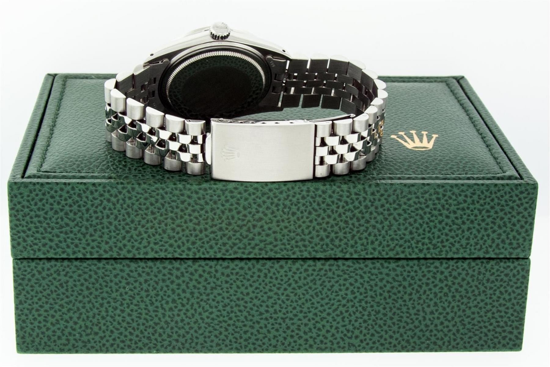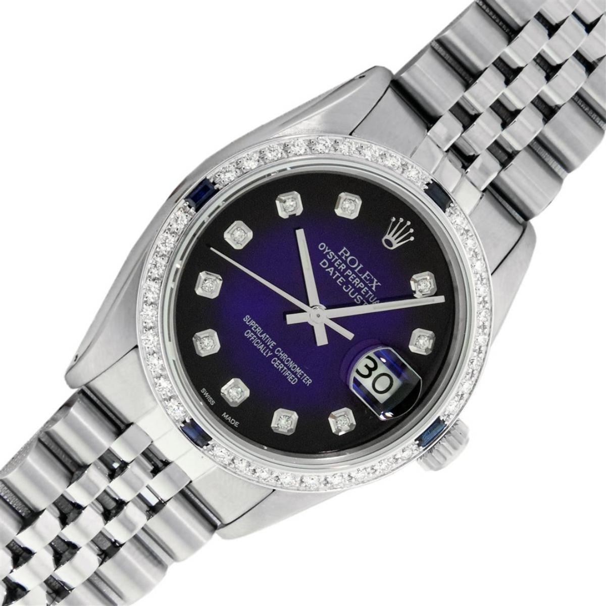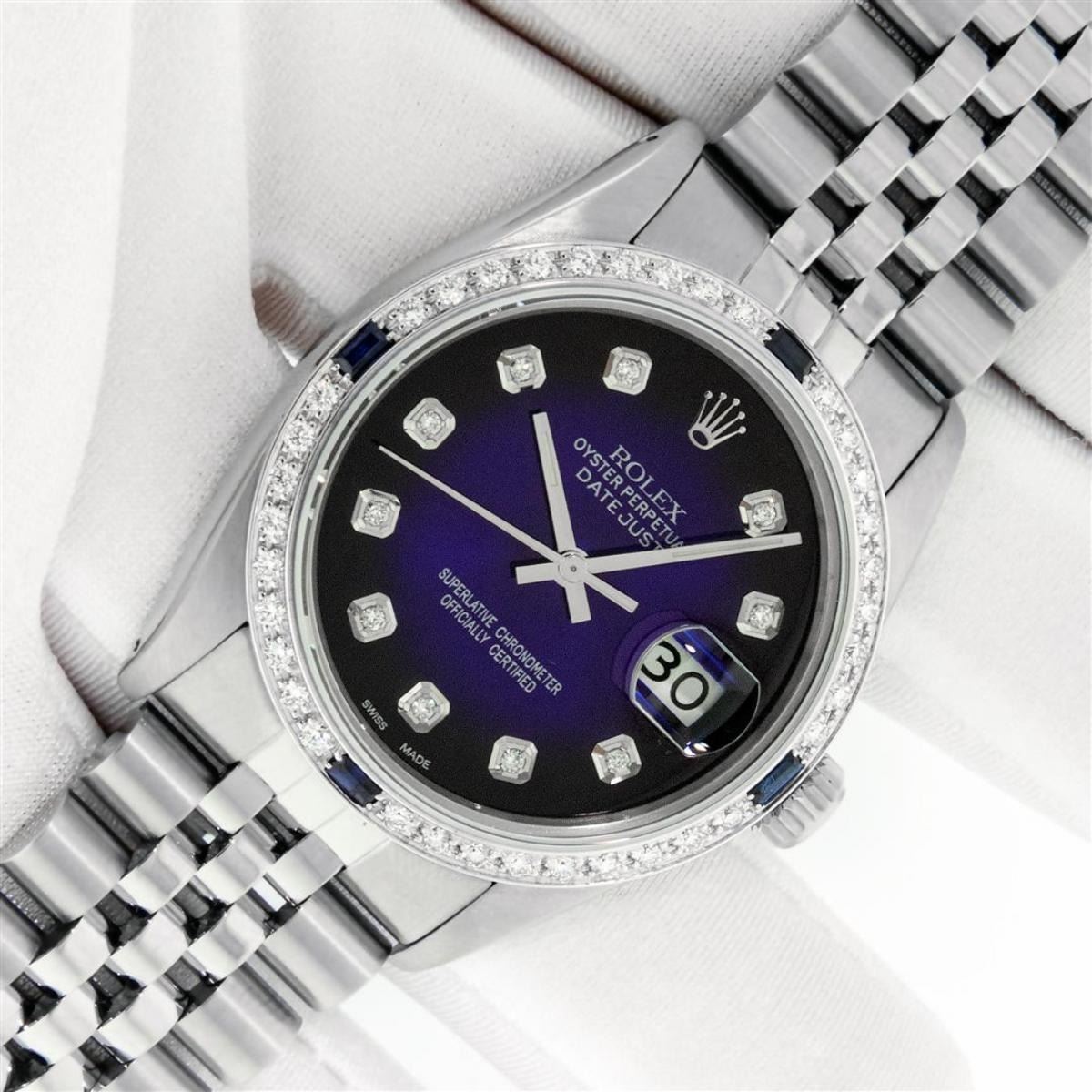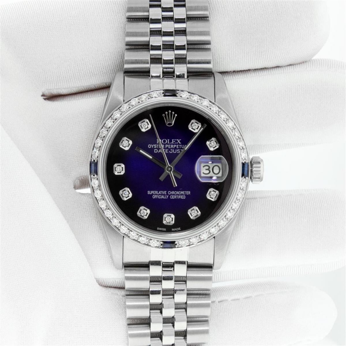 One Mens Rolex Datejust Polished Bright with Satin Finish, This Watch Has Been Serviced & Electronically Tested, Stainless Steel Case: 36mm, Stainless Steel Crown, Custom Bezel: New 18K White Gold Sapphire Beadset Diamond Bezel, Diamond + Gem Count: 36 Diamonds + 4 Sapphires Total Weight 1.00 Carat, Clarity: Si-VS, Color: G to H. Custom Crystal: New Synthetic Sapphire Cyclops Lens. Custom Hands: New Luminescent Hands. Movement: Automatic Winding Movement. Custom Dial: Blue Vignette With Diamond Hour Markers, Diamond Count: 10 Diamonds in Dial, Diamond Color: G To H In Color, Clarity: Si-VS. Date Window: 3 O'Clock Position Date Display, Quickset, Model: Datejust, Condition: G-6 Extra Fine. Bracelet: Stainless Steel Jubilee. Bracelet: 7.0 Inch Length, Adjustable. Standard Clasp, With Rolex Logo. This Watch Has Been Serviced Time Tested And Is In Excellent Condition It Is Free Of All Scratches And Dents. This Watch Comes With A Rolex Box.