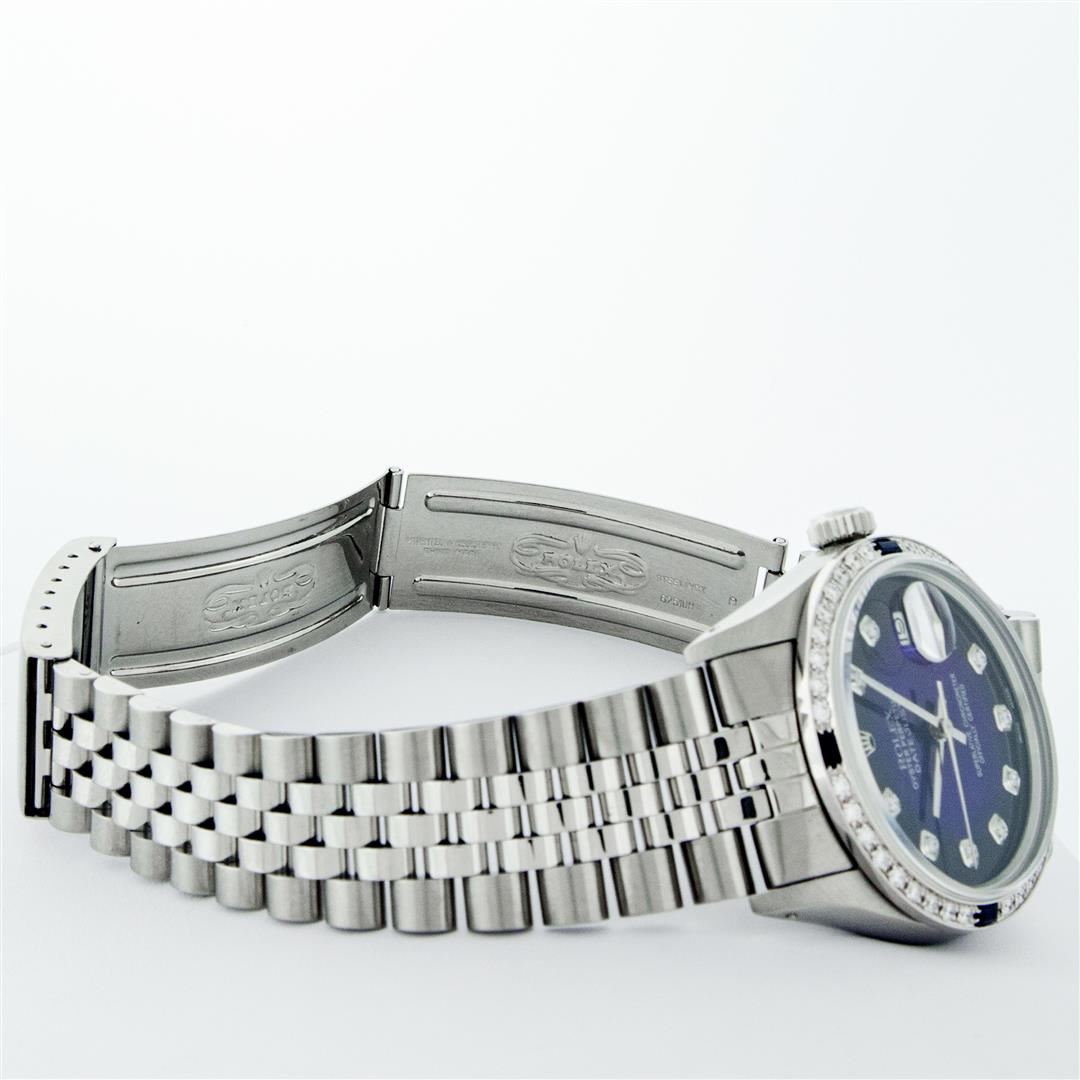 One Mens Rolex Datejust Polished Bright with Satin Finish, This Watch Has Been Serviced & Electronically Tested, Stainless Steel Case: 36mm, Stainless Steel Crown, Custom Bezel: New 18K White Gold Sapphire Beadset Diamond Bezel, Diamond + Gem Count: 36 Diamonds + 4 Sapphires Total Weight 1.00 Carat, Clarity: Si-VS, Color: G to H. Custom Crystal: New Synthetic Sapphire Cyclops Lens. Custom Hands: New Luminescent Hands. Movement: Automatic Winding Movement. Custom Dial: Blue Vignette With Diamond Hour Markers, Diamond Count: 10 Diamonds in Dial, Diamond Color: G To H In Color, Clarity: Si-VS. Date Window: 3 O'Clock Position Date Display, Quickset, Model: Datejust, Condition: G-6 Extra Fine. Bracelet: Stainless Steel Jubilee. Bracelet: 7.0 Inch Length, Adjustable. Standard Clasp, With Rolex Logo. This Watch Has Been Serviced Time Tested And Is In Excellent Condition It Is Free Of All Scratches And Dents.