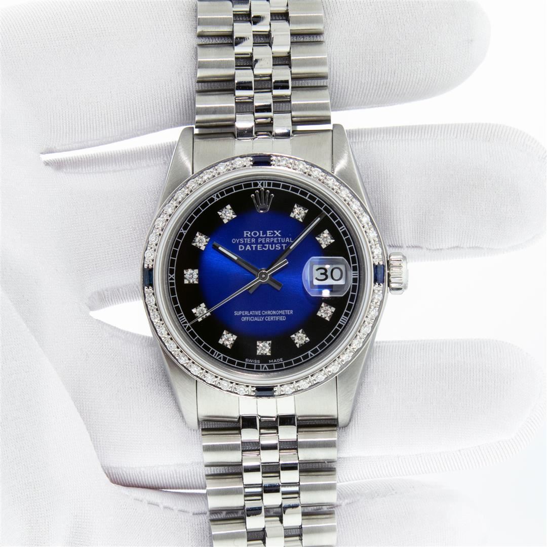 One Mens Stainless Steel Rolex Datejust Polished, Serviced & Electronically Tested, Stainless Steel Case: 36mm, Stainless Steel Crown, Custom Bezel: New 18K White Gold Sapphire Beadset Diamond Bezel, Diamond + Gem Count: 36 Diamonds + 4 Sapphires Total Weight 1.00 Carat, Clarity: SI-VS, Color: G to H. Custom Crystal: New Scratch Resistant Synthetic Sapphire Cyclops Lens. Custom Hands: New Luminescent Hands. Movement: Automatic Winding Movement. Custom Dial: Blue Vignette With Diamond Hour Markers & Roman Track, 10 Diamonds in Dial, G To H In Color, Clarity: SI-VS. Date Window: 3 O'Clock Position Date Display, Quickset, Model: Datejust. Condition: G-6 Extra Fine. Bracelet: Stainless Steel Jubilee. Bright Polish & Satin Finish. 7.0 Inch Length, Adjustable. Standard Clasp, With Rolex Logo. This Watch Has Been Serviced Time Tested And Is In Excellent Condition It Is Free Of All Scratches And Dents.