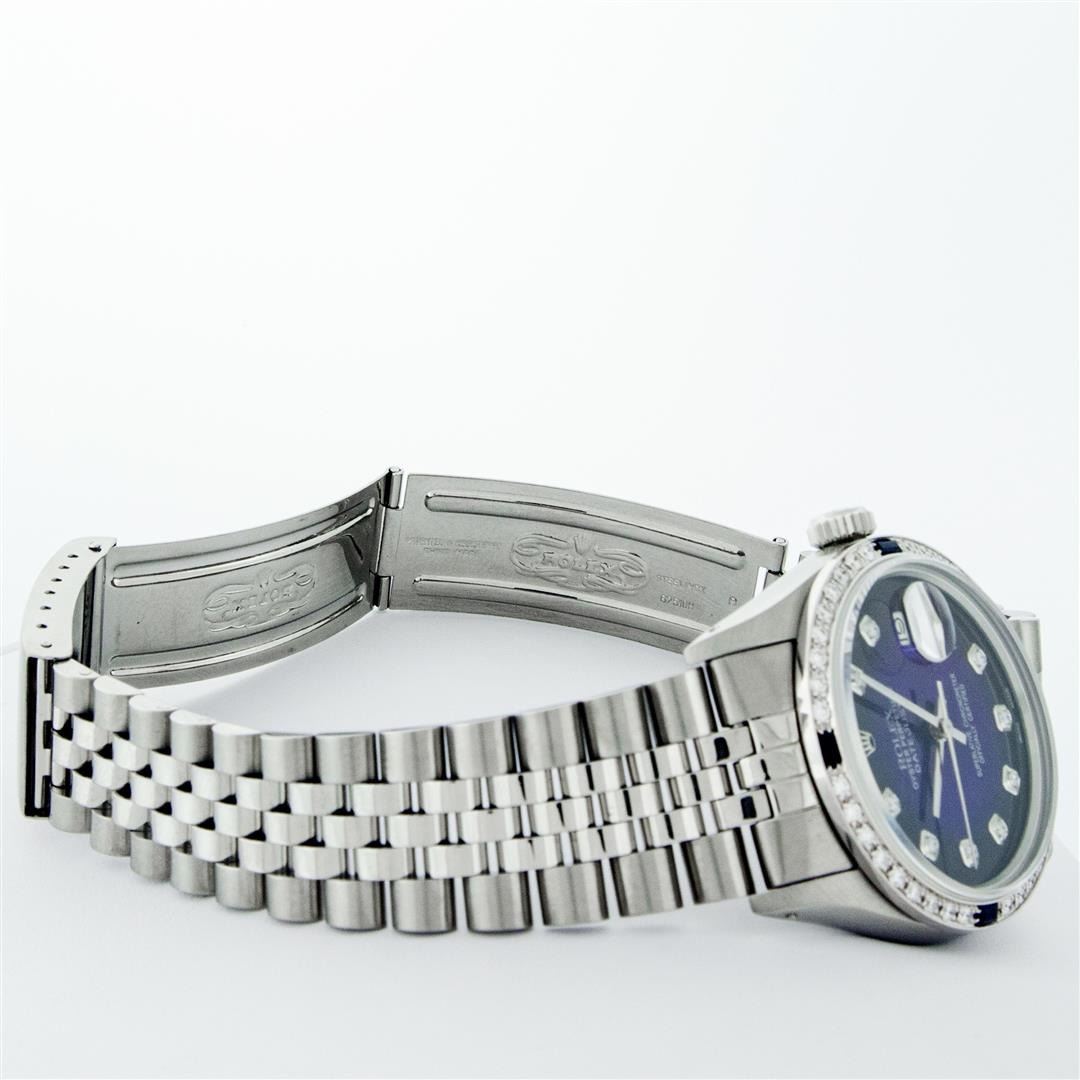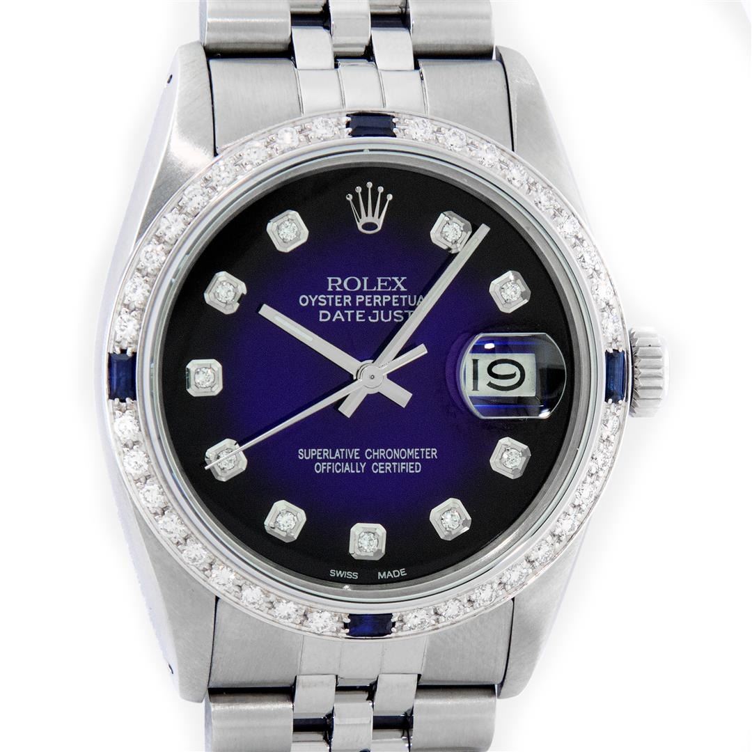 One Mens Pre Owned Rolex Datejust Polished Bright with Satin Finish, This Watch Has Been Serviced & Electronically Tested, Rolex Stainless Steel Case: 36mm, Rolex Stainless Steel Crown, Custom Bezel: New 18K White Gold Sapphire Bead set Diamond Bezel, Dia