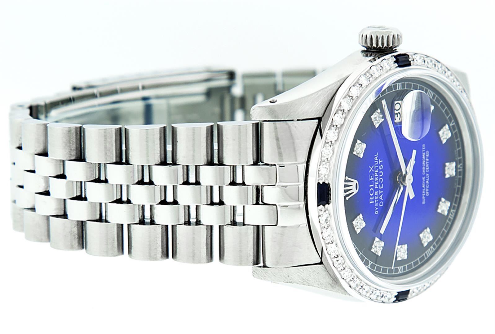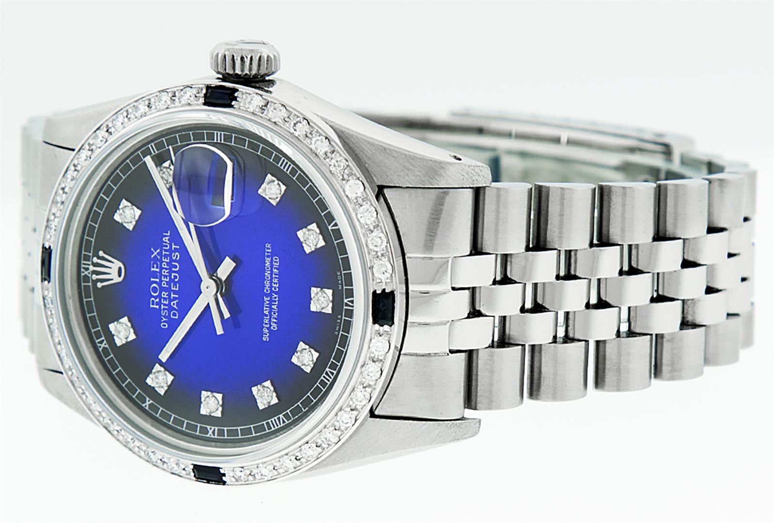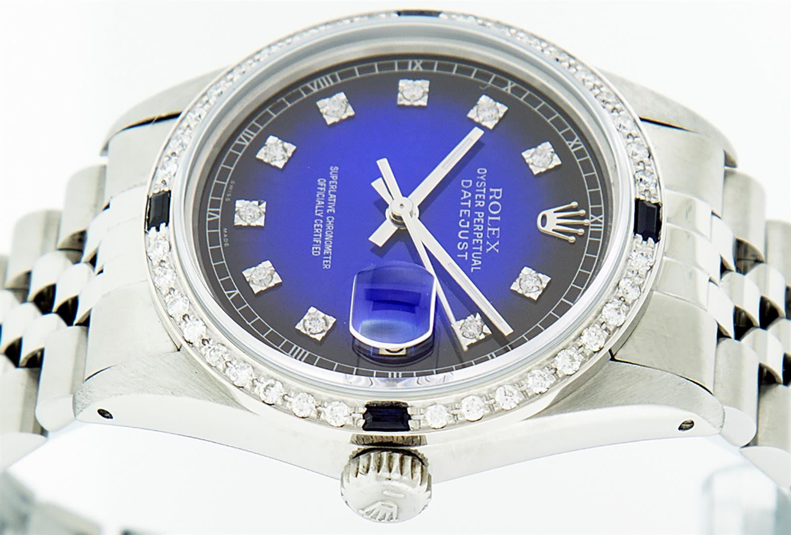 One Mens Pre Owned Stainless Steel Rolex Datejust Polished, Serviced & Electronically Tested, Stainless Steel Case: 36mm, Rolex Stainless Steel Crown, Custom Bezel: New 18K White Gold Sapphire Bead set Diamond Bezel, Diamond + Gem Count: 36 Diamonds + 4 Sapphires, Clarity: SI-VS, Color: G to H. Custom Crystal: New Sapphire Magnified Date. Custom Hands: New Luminescent Hands. Rolex Movement: Automatic Winding Movement. Custom Dial: Refinished To Blue Vignette With Custom Added Diamond Hour Markers, 10 Diamonds in Dial, G To H In Color, Clarity: SI-VS. Date Window: 3 O'clock Position Date Display, Quickset, Model: Datejust. Condition: G-6 Extra Fine. Rolex Bracelet: Stainless Steel Jubilee. Bright Polish & Satin Finish. 7.0 Inch Length, Adjustable. Standard Clasp, With Rolex Logo. This Watch Has Been Serviced Time Tested And Is In Excellent Condition It Is Free Of All Scratches And Dents.