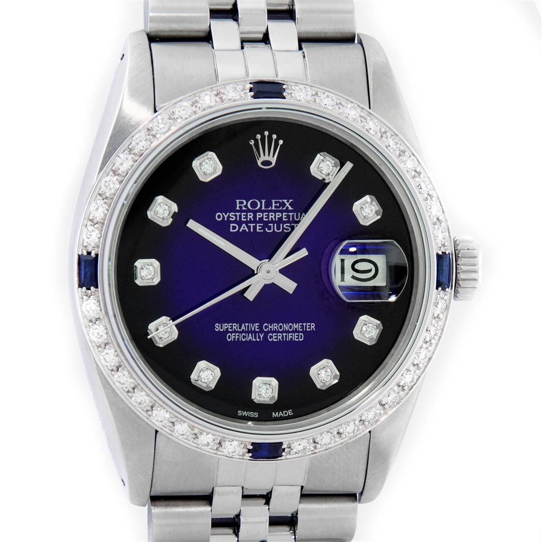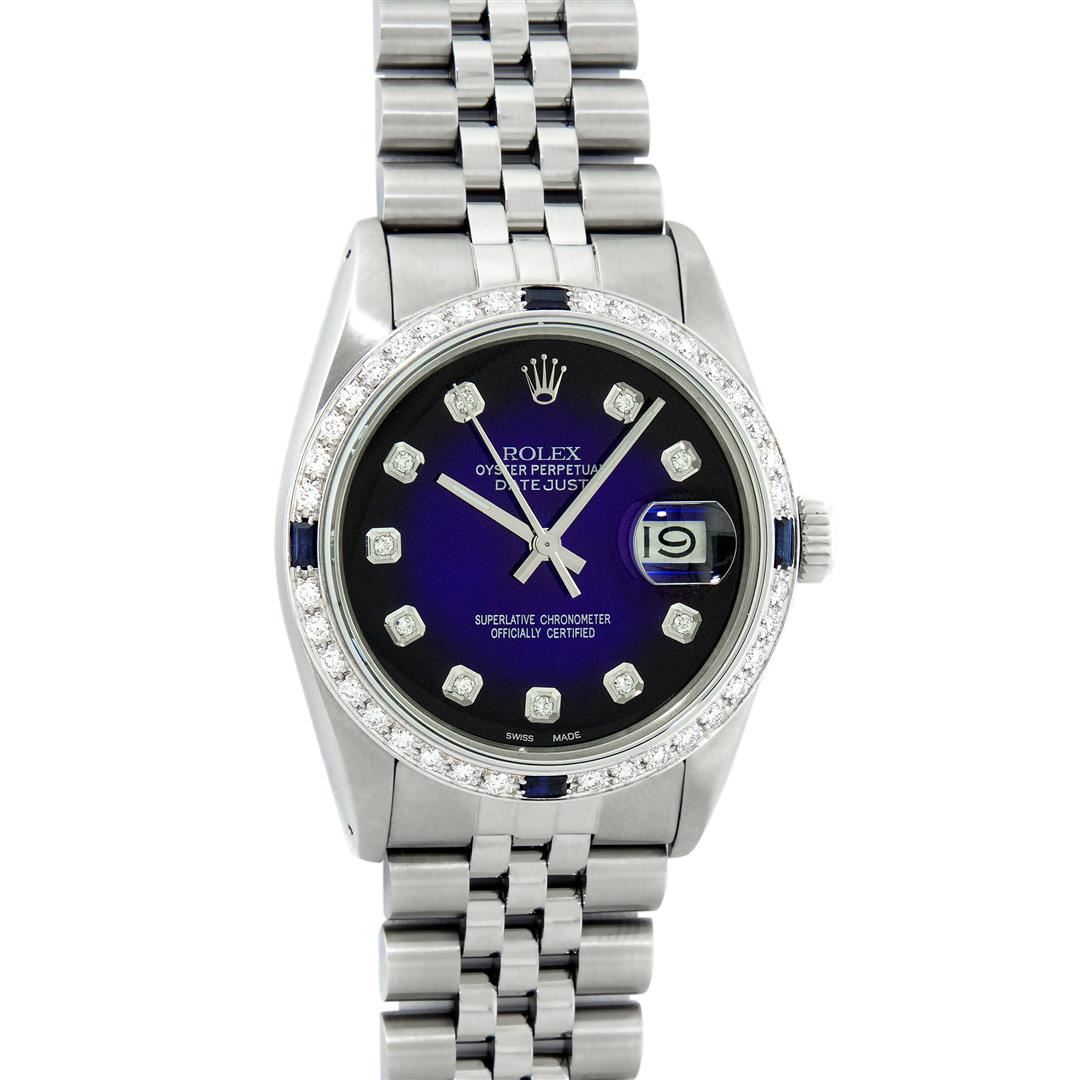 One Mens Pre Owned Rolex Datejust Polished Bright with Satin Finish, This Watch Has Been Serviced & Electronically Tested, Rolex Stainless Steel Case: 36mm, Rolex Stainless Steel Crown, Custom Bezel: New 18K White Gold Sapphire Bead set Diamond Bezel, Diamond + Gem Count: 36 Diamonds + 4 Sapphires,, Clarity: SI-VS, Color: G to H. Custom Crystal: New Sapphire With Date Window. Custom Hands: New Luminescent Hands. Rolex Movement: Automatic Winding Movement. Custom Dial: Refinished To Blue Vignette With Custom Added Diamond Hour Markers, Diamond Count: 10 Diamonds in Dial, Diamond Color: G To H In Color, Clarity: SI-VS. Date Window: 3 O'clock Position Date Display, Quickset, Model: Datejust, Condition: G-6 Extra Fine. Rolex Bracelet: Stainless Steel Jubilee. Bracelet: 7.0 Inch Length, Adjustable. Standard Clasp, With Rolex Logo. This Watch Has Been Serviced Time Tested And Is In Excellent Condition It Is Free Of All Scratches And Dents.