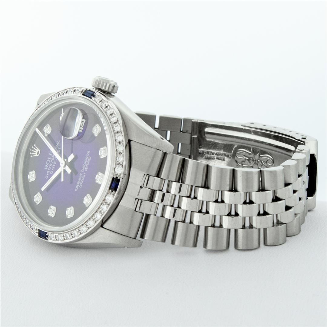 One Mens Pre Owned Rolex Datejust Polished Bright with Satin Finish, This Watch Has Been Serviced & Electronically Tested, Rolex Stainless Steel Case: 36mm, Rolex Stainless Steel Crown, Custom Bezel: New 18K White Gold Sapphire Bead set Diamond Bezel, Diamond + Gem Count: 36 Diamonds + 4 Sapphires,, Clarity: SI-VS, Color: G to H. Custom Crystal: New Sapphire With Date Window. Custom Hands: New Luminescent Hands. Rolex Movement: Automatic Winding Movement. Custom Dial: Refinished To Blue Vignette With Custom Added Diamond Hour Markers, Diamond Count: 10 Diamonds in Dial, Diamond Color: G To H In Color, Clarity: SI-VS. Date Window: 3 O'clock Position Date Display, Quickset, Model: Datejust, Condition: G-6 Extra Fine. Rolex Bracelet: Stainless Steel Jubilee. Bracelet: 7.0 Inch Length, Adjustable. Standard Clasp, With Rolex Logo. This Watch Has Been Serviced Time Tested And Is In Excellent Condition It Is Free Of All Scratches And Dents.