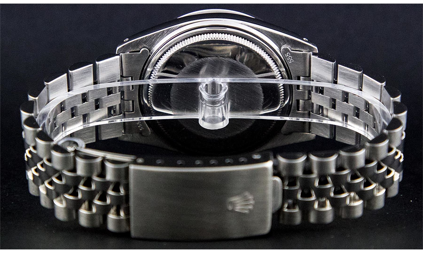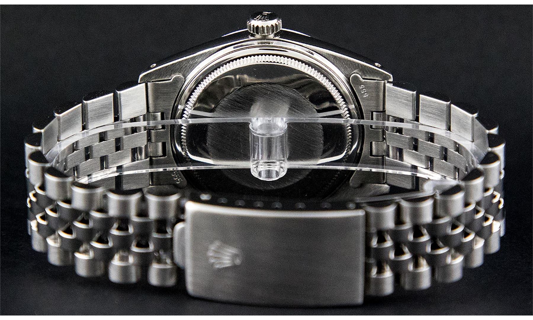 One Mens Pre Owned Rolex Datejust Polished Bright with Satin Finish, This Watch Has Been Serviced & Electronically Tested, Rolex Stainless Steel Case: 36mm, Rolex Stainless Steel Crown, Custom Bezel: New 18K White Gold Sapphire Beadset Diamond Bezel, Diamond + Gem Count: 36 Diamonds + 4 Sapphires,, Clarity: SI-VS, Color: G to H. Custom Crystal: New Sapphire With Date Window. Custom Hands: New Luminescent Hands. Rolex Movement: Automatic Winding Movement. Custom Dial: Refinished To Blue Vignette With Custom Added Diamond Hour Markers, Diamond Count: 10 Diamonds in Dial, Diamond Color: G To H In Color, Clarity: SI-VS. Date Window: 3 O'Clock Position Date Display, Quickset, Model: Datejust, Condition: G-6 Extra Fine. Rolex Bracelet: Stainless Steel Jubilee. Bracelet: 7.0 Inch Length, Adjustable. Standard Clasp, With Rolex Logo. This Watch Has Been Serviced Time Tested And Is In Excellent Condition It Is Free Of All Scratches And Dents.