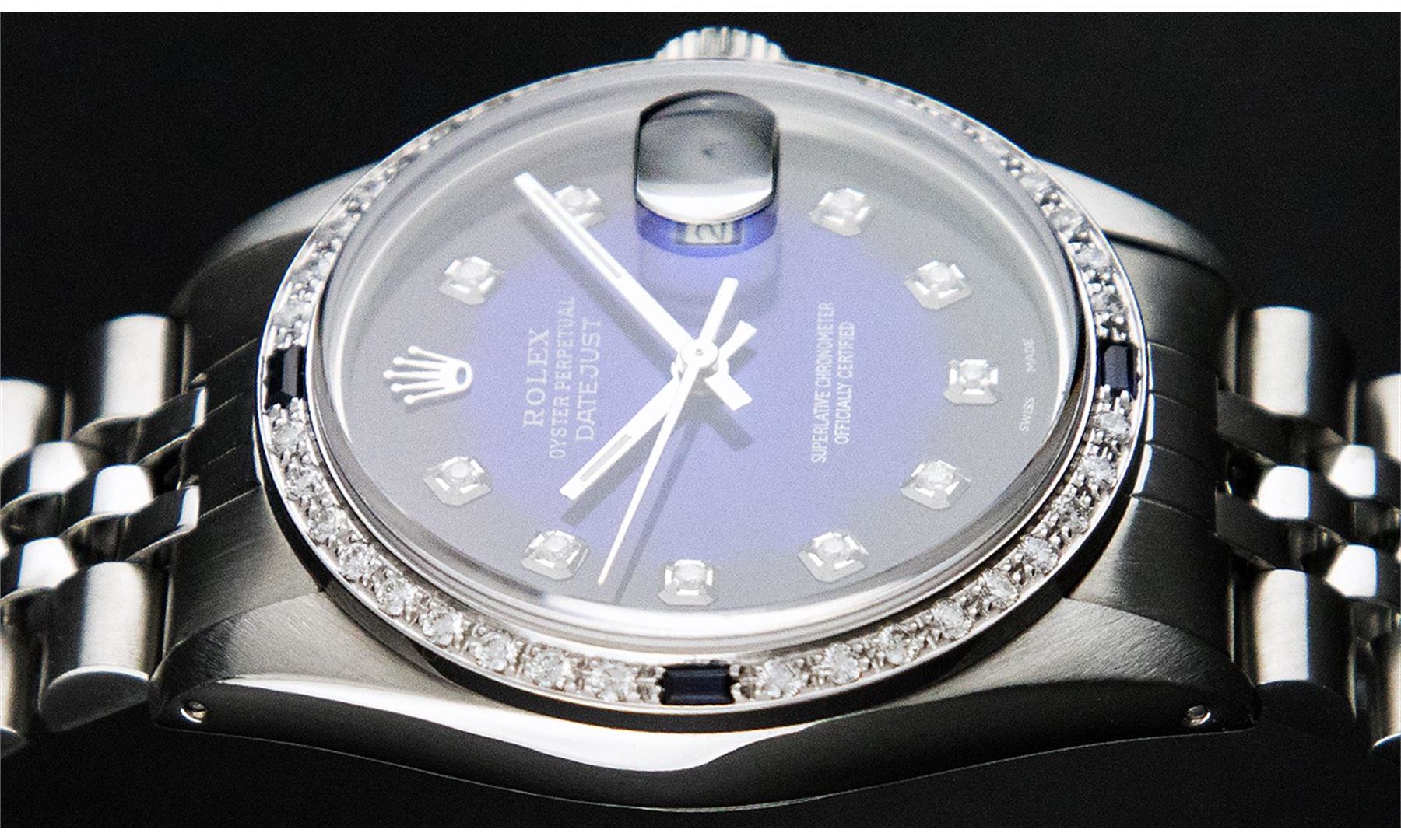 One Mens Pre Owned Rolex Datejust Polished Bright with Satin Finish, This Watch Has Been Serviced & Electronically Tested, Rolex Stainless Steel Case: 36mm, Rolex Stainless Steel Crown, Custom Bezel: New 18K White Gold Sapphire Beadset Diamond Bezel, Diamond + Gem Count: 36 Diamonds + 4 Sapphires,, Clarity: SI-VS, Color: G to H. Custom Crystal: New Sapphire With Date Window. Custom Hands: New Luminescent Hands. Rolex Movement: Automatic Winding Movement. Custom Dial: Refinished To Blue Vignette With Custom Added Diamond Hour Markers, Diamond Count: 10 Diamonds in Dial, Diamond Color: G To H In Color, Clarity: SI-VS. Date Window: 3 O'Clock Position Date Display, Quickset, Model: Datejust, Condition: G-6 Extra Fine. Rolex Bracelet: Stainless Steel Jubilee. Bracelet: 7.0 Inch Length, Adjustable. Standard Clasp, With Rolex Logo. This Watch Has Been Serviced Time Tested And Is In Excellent Condition It Is Free Of All Scratches And Dents.