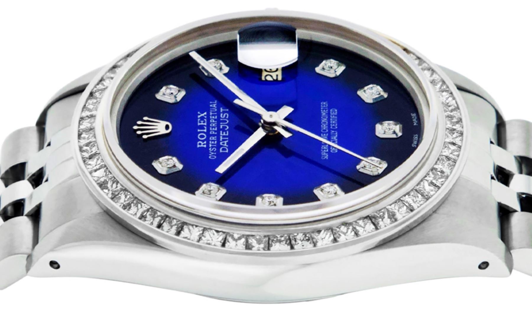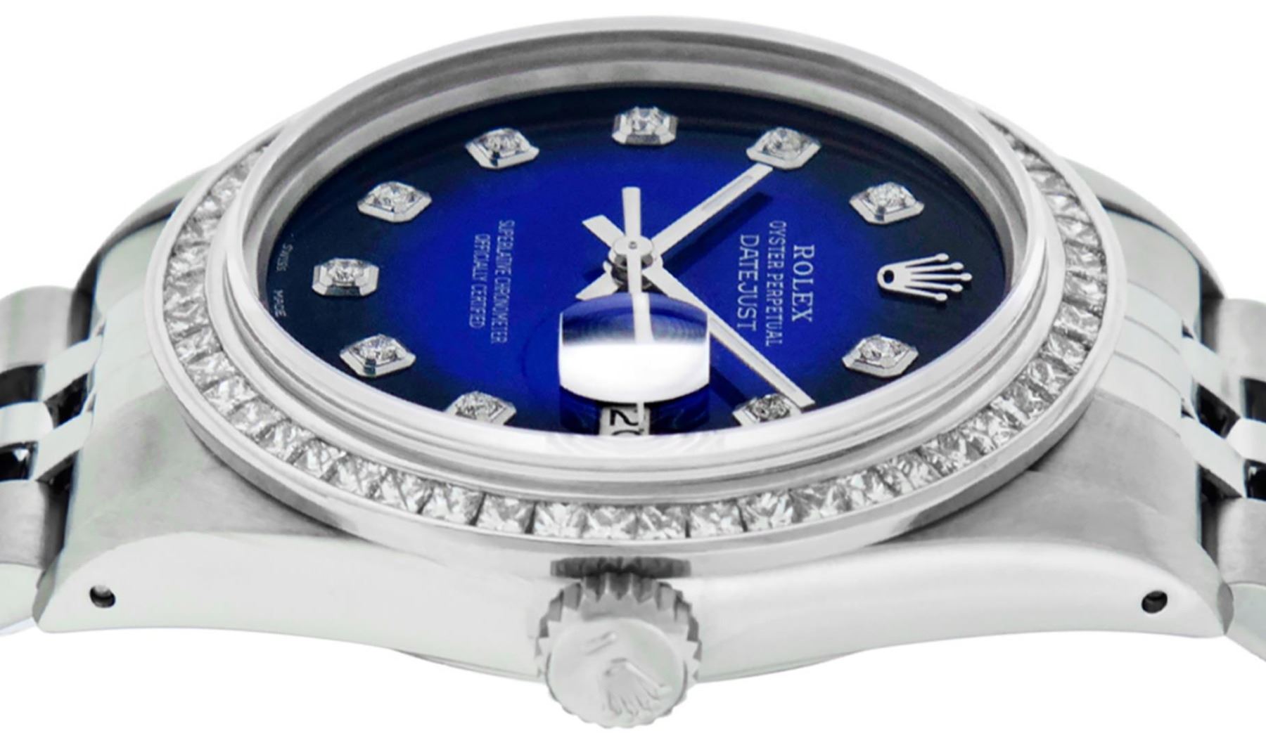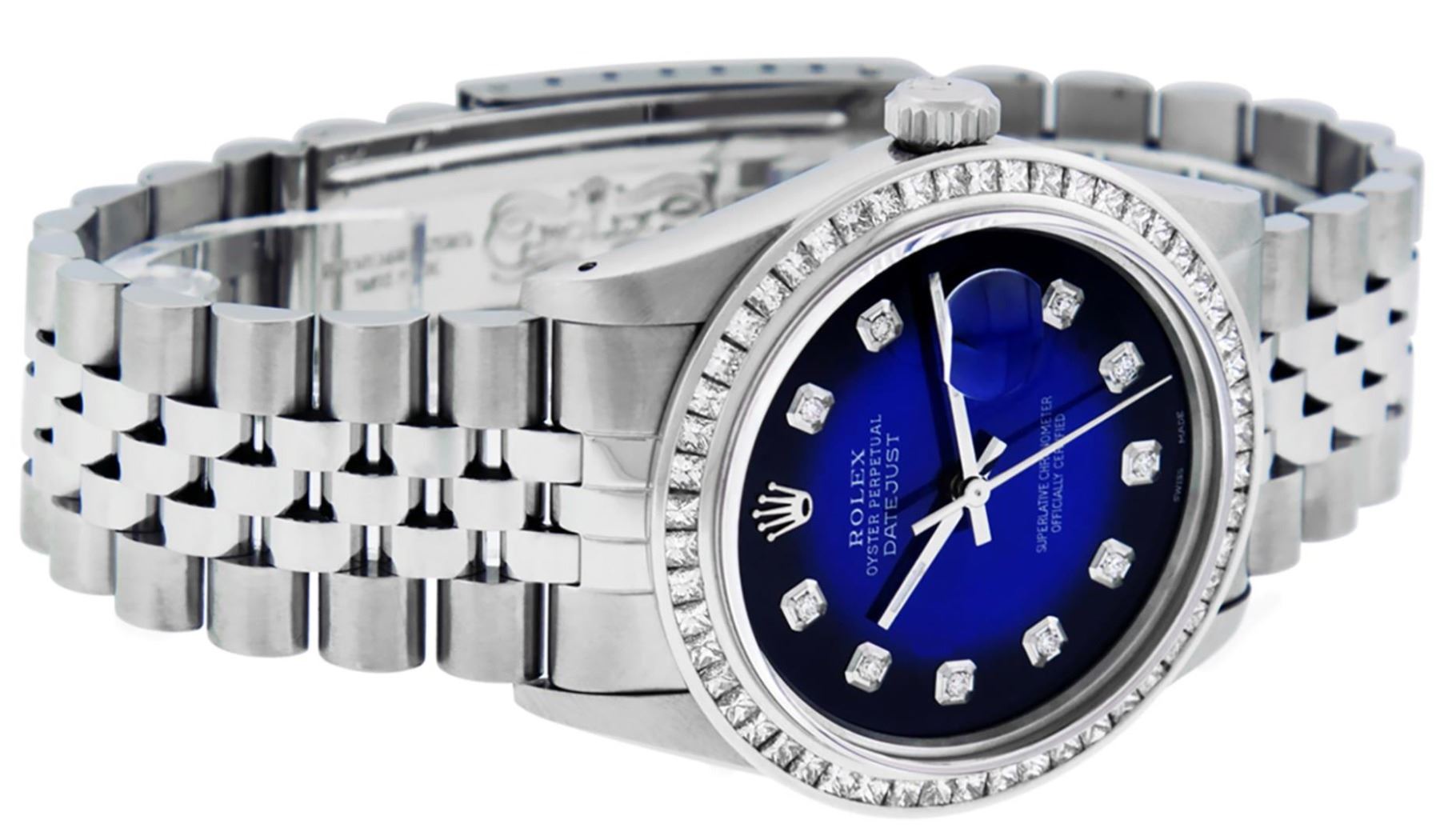 One Mens Pre Owned Stainless Steel Rolex Datejust Polished Bright with Satin Finish, Fully Serviced & Electronically Tested, Stainless Steel Case:36mm, Stainless Steel Crown, Custom Bezel: 14K White Gold 2.75 Carat Princess Cut Diamond Bezel, Diamond Count: 53 Diamonds, Total Weight 2.75 Carat. Custom Crystal: New Sapphire With Magnified Date Window. Custom Hands: New Luminecent Hands. Rolex Movement: Automatic Winding Movement 3035. Custom Dial: Custom Blue Vignette With Added Diamond Hour Markers, Diamond Count: 10 Diamonds in Dial. Date Window: 3 O'Clock Position Date Display, Quickset, Model: Datejust 36mm, Condition: G-6 Extra Fine. Rolex Bracelet: Rolex Stainless Steel Jubilee Band. Bright Polish And Satin Finish. 7.0 Inch Length, Adjustable. Standard Clasp, With Rolex Logo. This Watch Has Been Serviced And Polished It Is Free Of All Scratches And Dents.