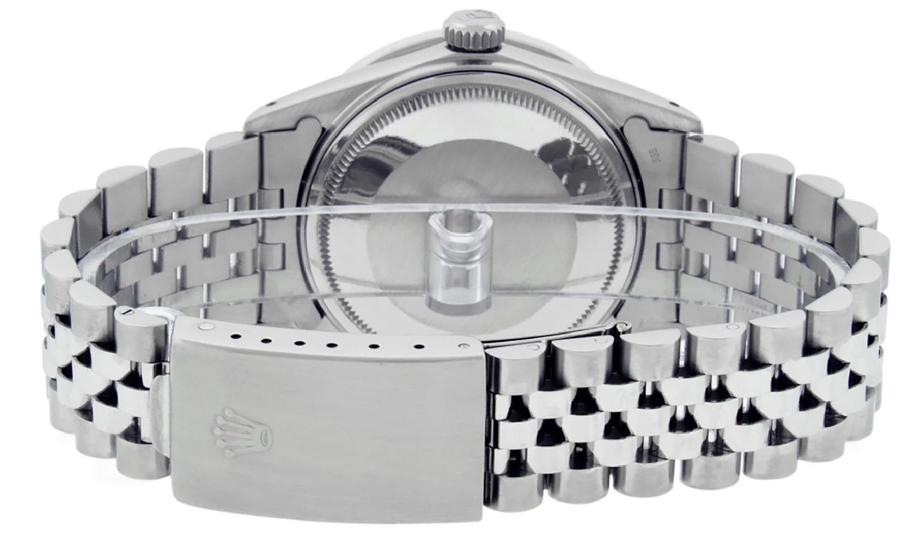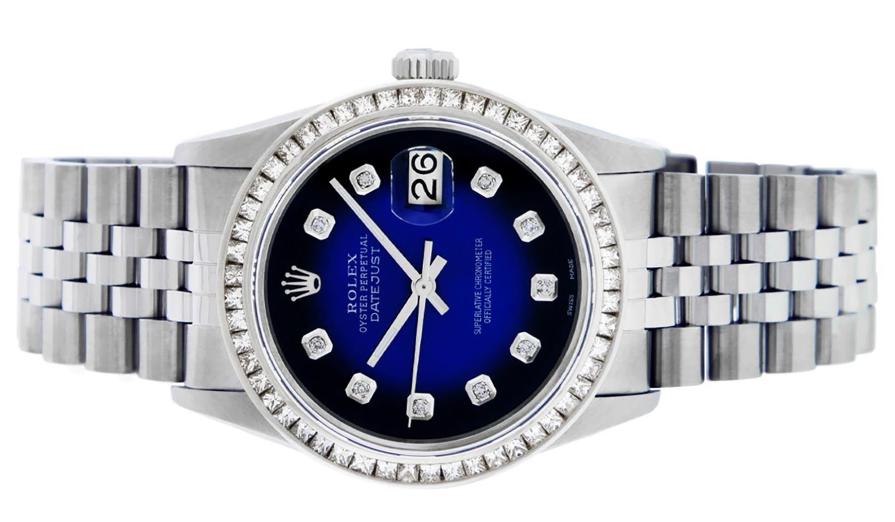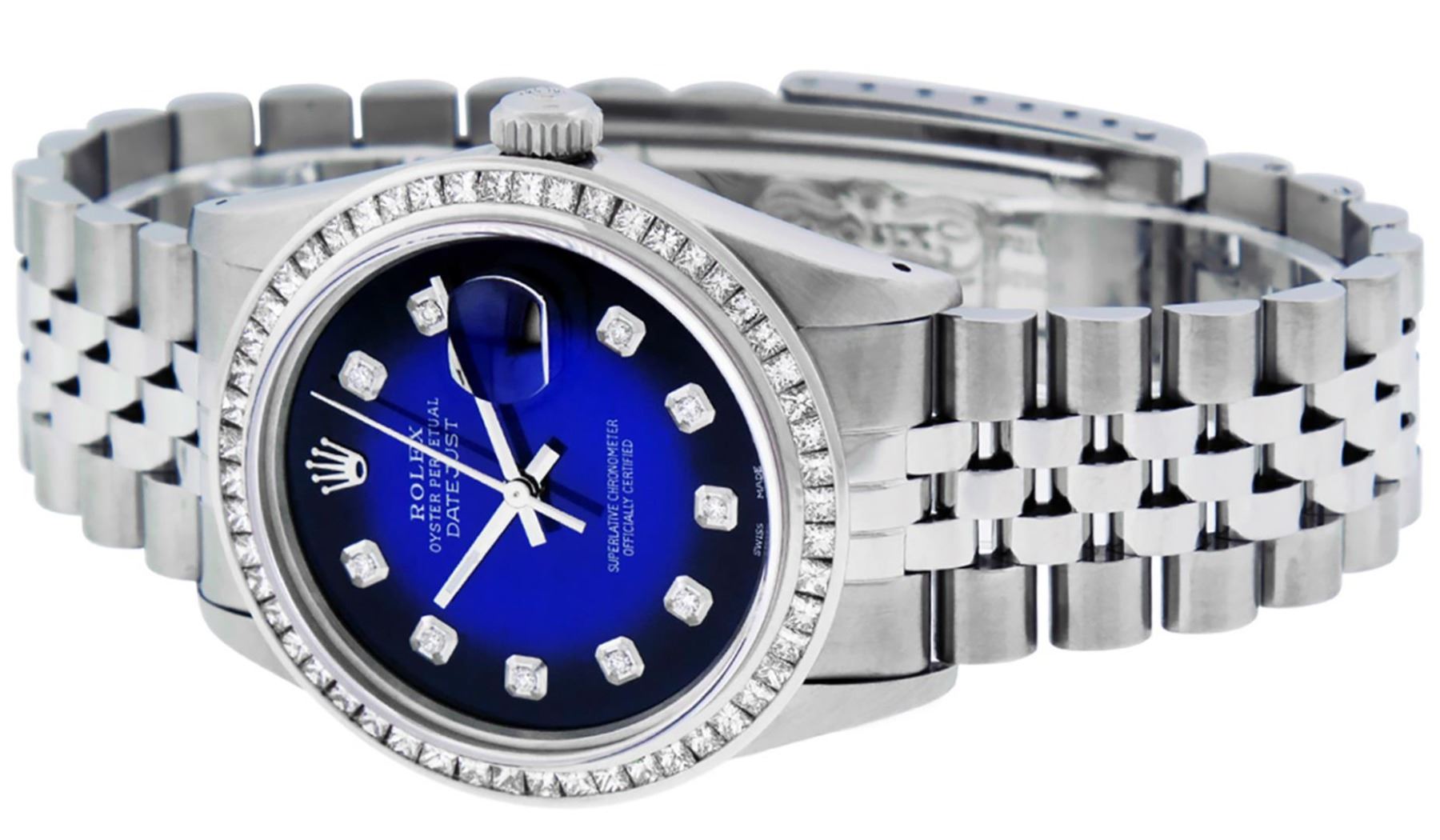 One Mens Pre Owned Stainless Steel Rolex Datejust Polished Bright with Satin Finish, Fully Serviced & Electronically Tested, Stainless Steel Case:36mm, Stainless Steel Crown, Custom Bezel: 14K White Gold 2.75 Carat Princess Cut Diamond Bezel, Diamond Count: 53 Diamonds, Total Weight 2.75 Carat. Custom Crystal: New Sapphire With Magnified Date Window. Custom Hands: New Luminecent Hands. Rolex Movement: Automatic Winding Movement 3035. Custom Dial: Custom Blue Vignette With Added Diamond Hour Markers, Diamond Count: 10 Diamonds in Dial. Date Window: 3 O'Clock Position Date Display, Quickset, Model: Datejust 36mm, Condition: G-6 Extra Fine. Rolex Bracelet: Rolex Stainless Steel Jubilee Band. Bright Polish And Satin Finish. 7.0 Inch Length, Adjustable. Standard Clasp, With Rolex Logo. This Watch Has Been Serviced And Polished It Is Free Of All Scratches And Dents.