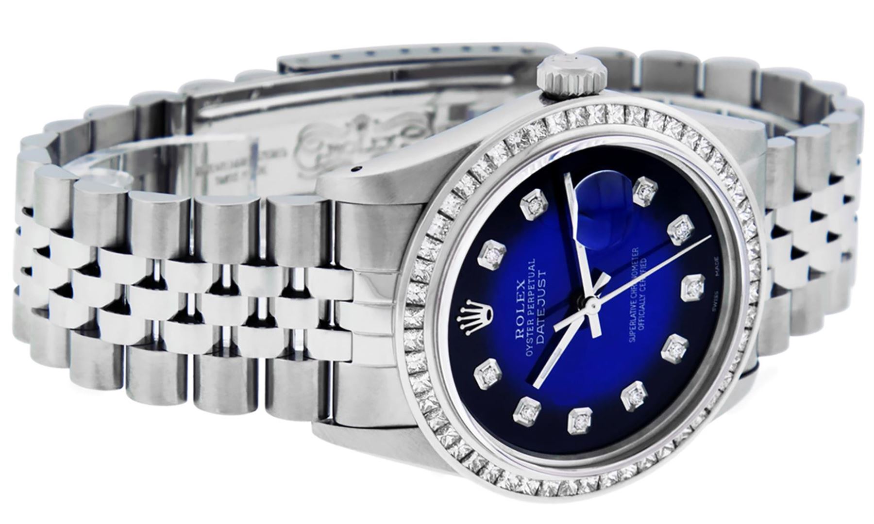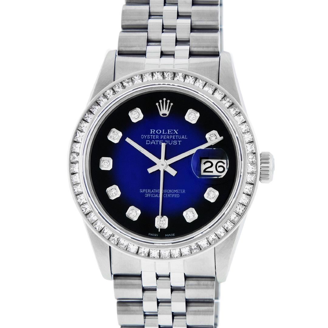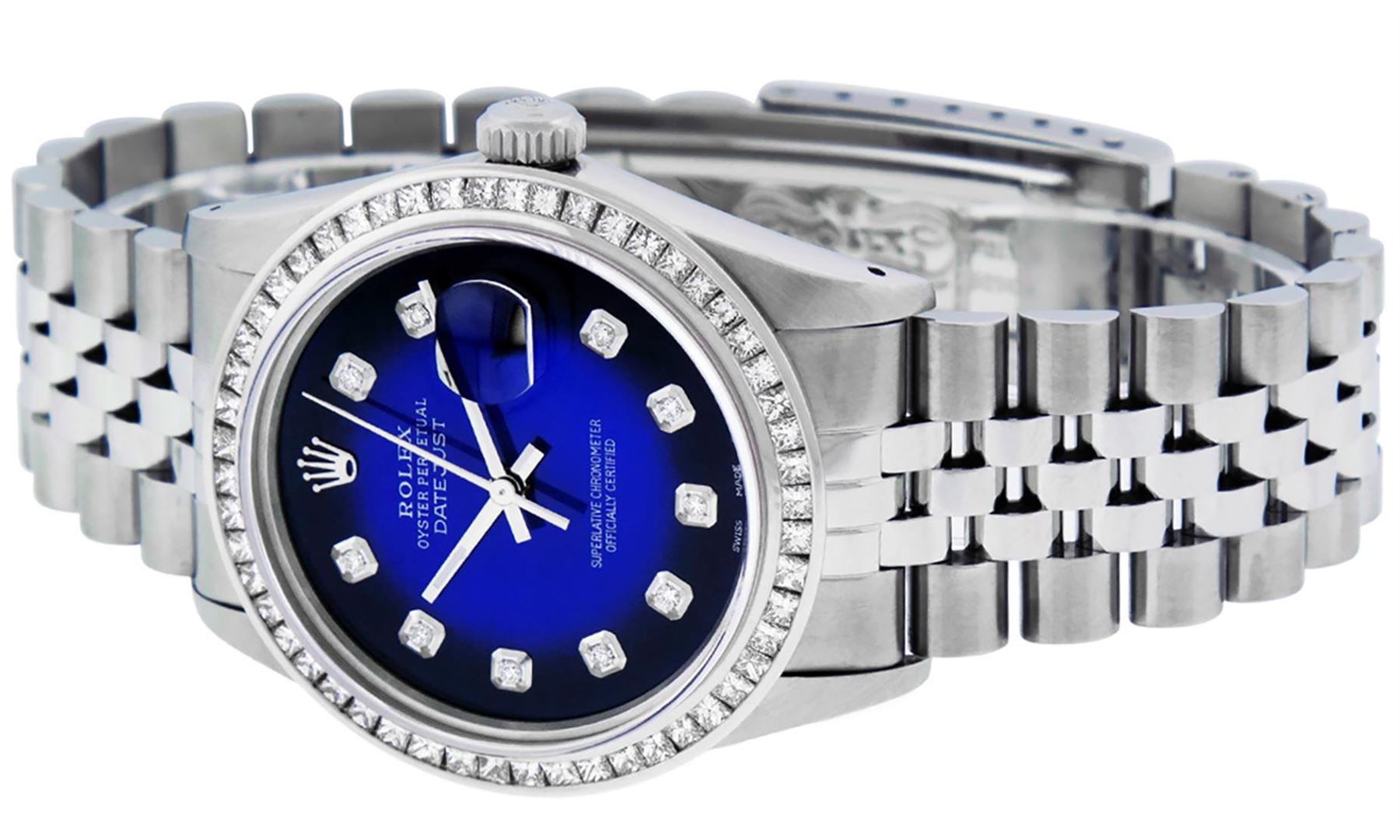One Mens Stainless Steel Rolex Datejust Polished Bright with Satin Finish, Fully Serviced & Electronically Tested, Stainless Steel Case:36mm, Stainless Steel Crown, Custom Bezel: 14K White Gold 2.75 Carat Princess Cut Diamond Bezel, Diamond Count: 53 Diamonds, Total Weight 2.75 Carat, Clarity: SI-VS, Color: G to H. Custom Crystal: New Scratch Resistant Synthetic Sapphire Cyclops Lens. Custom Hands: New Luminecent Hands. Movement: Automatic Winding Movement. Custom Dial: Blue Vignette Diamond Dial, 10 Diamonds in Dial, G To H In Color, Clarity: SI-VS. Date Window: 3 O'Clock Position Date Display, Quickset, Model: Datejust 36mm, Condition: G-6 Extra Fine. Bracelet: Rolex Stainless Steel Jubilee Band. Bright Polish & Satin Finish. 7.0 Inch Length, Adjustable. Standard Clasp, With Rolex Logo. Watch Has Been Serviced And Polished It Is Free Of All Scratches And Dents.