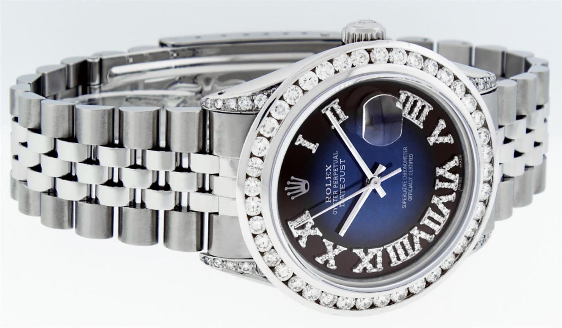One Mens Stainless Steel Rolex Datejust Polished Bright with Satin Finish, Serviced & Electronically Tested, Stainless Steel Case: 36mm, Diamond Lugs: 24 Diamonds On Lugs, Color: G to H, Clarity: SI-VS. Stainless Steel Crown, New Custom Bezel: 18K White Gold 3.00 Ctw Diamond Bezel, Diamond Count: 40 Diamonds, Total Weight 3.0 Carat, Clarity: SI-VS, Color: G to H. Custom Crystal: New Scratch Resistant Synthetic Sapphire Cyclops Lens. Movement: Automatic Winding Movement. Custom Dial: Blue Vignette Roman Diamond Dial, Diamond Color: G To H In Color, Clarity: SI-VS. Date Window: 3 O'Clock Position Date Display, Quickset, Model: Quickset Datejust, Condition: G-6 Extra Fine. Bracelet: Stainless Steel Jubilee Band. Bright Polish & Satin Finish. 7.0 Inch Length, Adjustable. Standard Clasp, With Rolex Logo. This Watch Has Been Serviced Time Tested And Is In Excellent Condition It Is Free Of All Scratches And Dents.