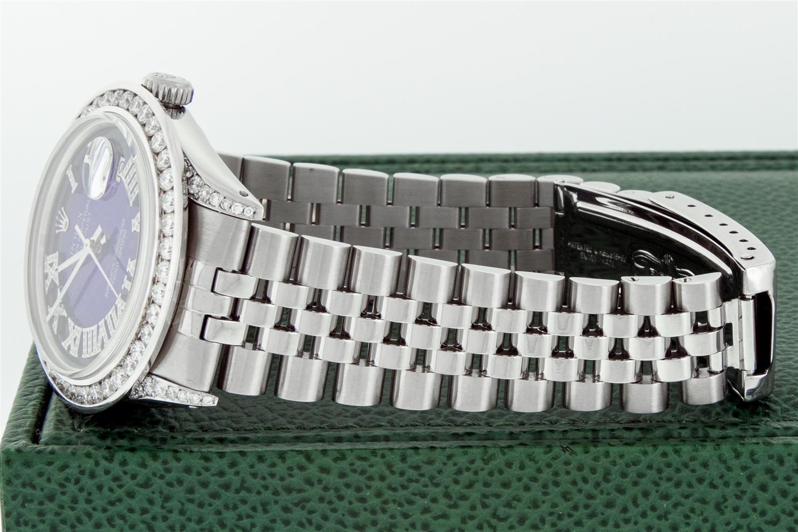 One Mens Stainless Steel Rolex Datejust Polished Bright with Satin Finish, Serviced & Electronically Tested, Stainless Steel Case: 36mm, Diamond Lugs: 24 Diamonds On Lugs, Color: G to H, Clarity: SI-VS. Stainless Steel Crown, New Custom Bezel: 18K White Gold 3.00 Ctw Diamond Bezel, Diamond Count: 40 Diamonds, Total Weight 3.0 Carat, Clarity: SI-VS, Color: G to H. Custom Crystal: New Scratch Resistant Synthetic Sapphire Cyclops Lens. Movement: Automatic Winding Movement. Custom Dial: Blue Vignette Roman Diamond Dial, Diamond Color: G To H In Color, Clarity: SI-VS. Date Window: 3 O'Clock Position Date Display, Quickset, Model: Quickset Datejust, Condition: G-6 Extra Fine. Bracelet: Stainless Steel Jubilee Band. Bright Polish & Satin Finish. 7.0 Inch Length, Adjustable. Standard Clasp, With Rolex Logo. This Watch Has Been Serviced Time Tested And Is In Excellent Condition It Is Free Of All Scratches And Dents. This Watch Comes With A Rolex Box.