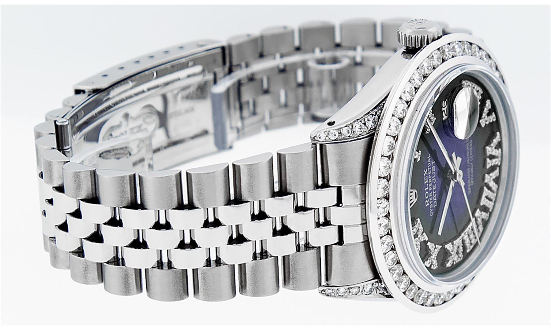 One Mens Stainless Steel Rolex Datejust Polished Bright with Satin Finish, Serviced & Electronically Tested, Stainless Steel Case: 36mm, Diamond Lugs: 24 Diamonds On Lugs, Color: G to H, Clarity: SI-VS. Stainless Steel Crown, New Custom Bezel: 18K White Gold 3.00 Ctw Diamond Bezel, Diamond Count: 40 Diamonds, Total Weight 3.0 Carat, Clarity: SI-VS, Color: G to H. Custom Crystal: New Scratch Resistant Synthetic Sapphire Cyclops Lens. Movement: Automatic Winding Movement. Custom Dial: Blue Vignette Roman Diamond Dial, Diamond Color: G To H In Color, Clarity: SI-VS. Date Window: 3 O'Clock Position Date Display, Quickset, Model: Quickset Datejust, Condition: G-6 Extra Fine. Bracelet: Stainless Steel Jubilee Band. Bright Polish & Satin Finish. 7.0 Inch Length, Adjustable. Standard Clasp, With Rolex Logo. This Watch Has Been Serviced Time Tested And Is In Excellent Condition It Is Free Of All Scratches And Dents.