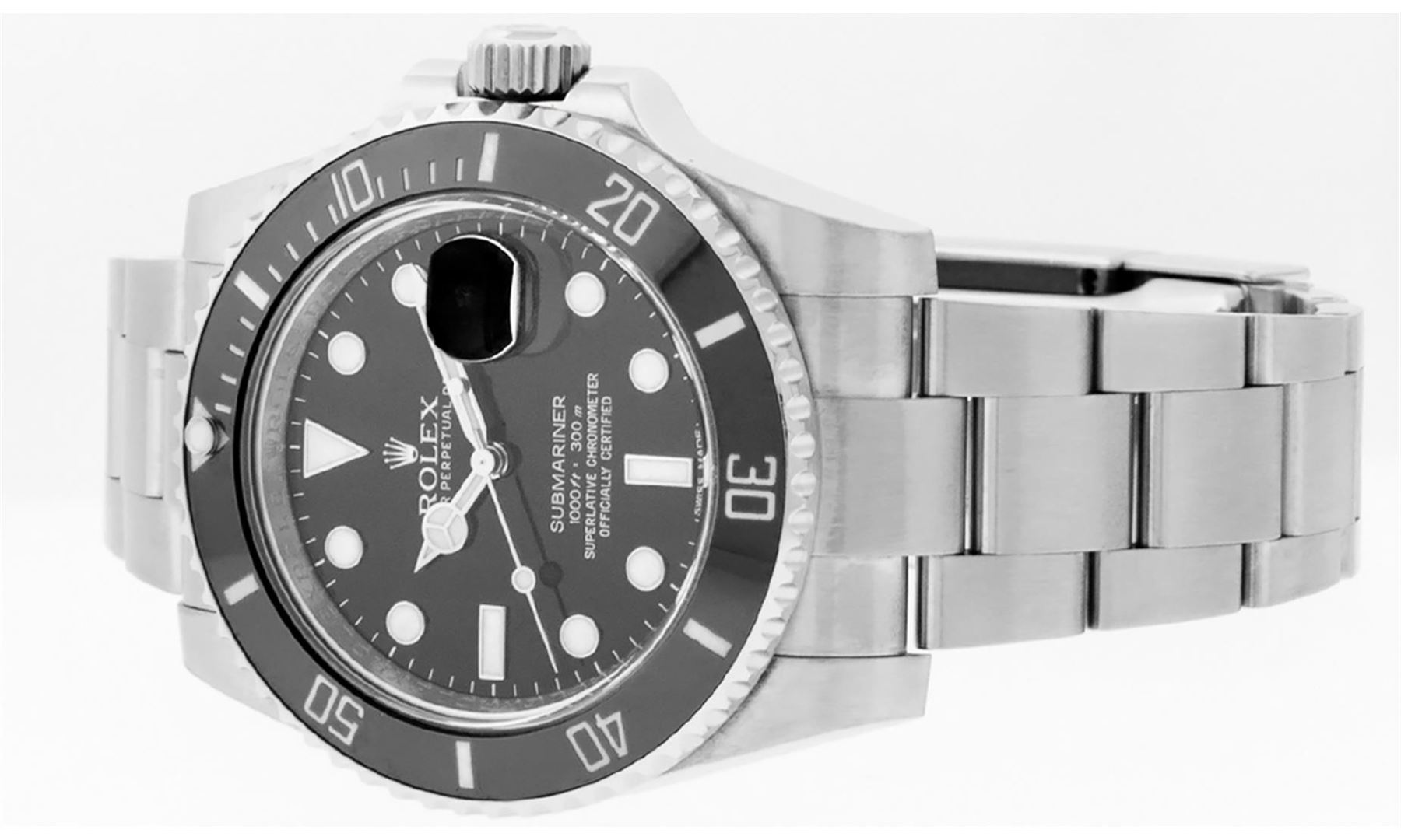 One Mens Pre Owned Ceramic Rolex Submariner With Date Polished, Serviced & Electronically Tested, Rolex Stainless Steel Case: 40mm, Rolex Stainless Steel Crown, Rolex Bezel: Stainless Steel Rotatable Bezel With Black Ceramic Insert. Rolex Crystal: Sapphire Cyclops Lens. Rolex Movement: Automatic Winding Movement Caliber 3135. Rolex Dial: Rolex Black Submariner Dial with Luminous Index Hour Markers. Date Window: 3 O'Clock Position Date Display, Model: Ceramic Submariner, Quickset, Condition: G-6 Extra Fine. Rolex Bracelet: Stainless Steel Oyster Band. Bright Polish & Satin Finish. 7.0 Inch Length, Adjustable. Standard Clasp, With Rolex Logo.
