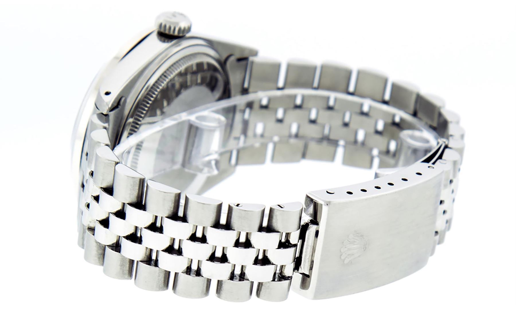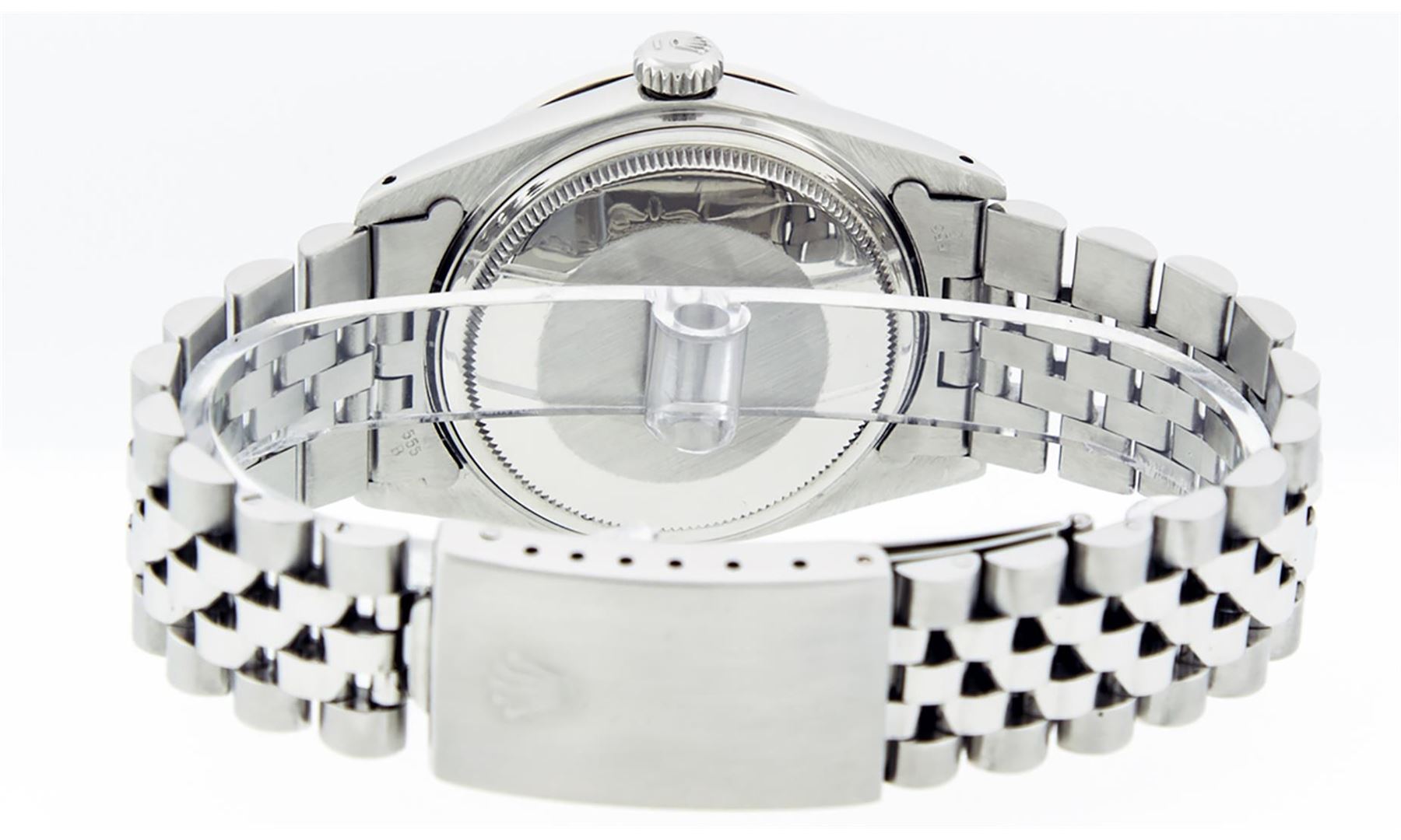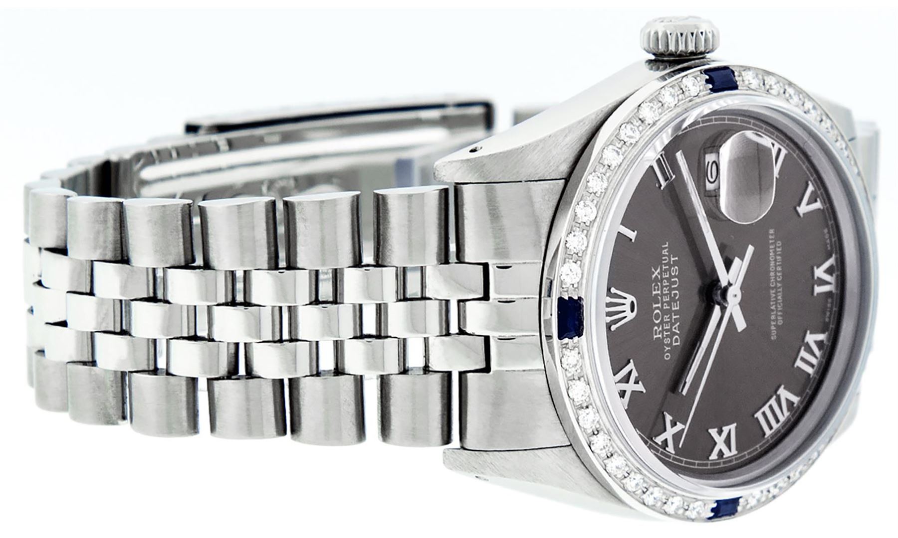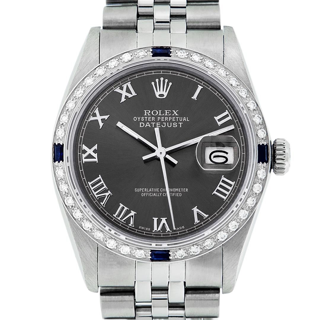 One Mens Pre Owned Stainless Steel Rolex Datejust Polished Bright with Satin Finish, This Watch Has Been Serviced & Electronically Tested, Rolex Stainless Steel Case: 36mm, Rolex Stainless Steel Crown, Custom Bezel: New 18K White Gold Sapphire Bead set Di