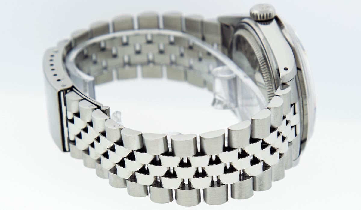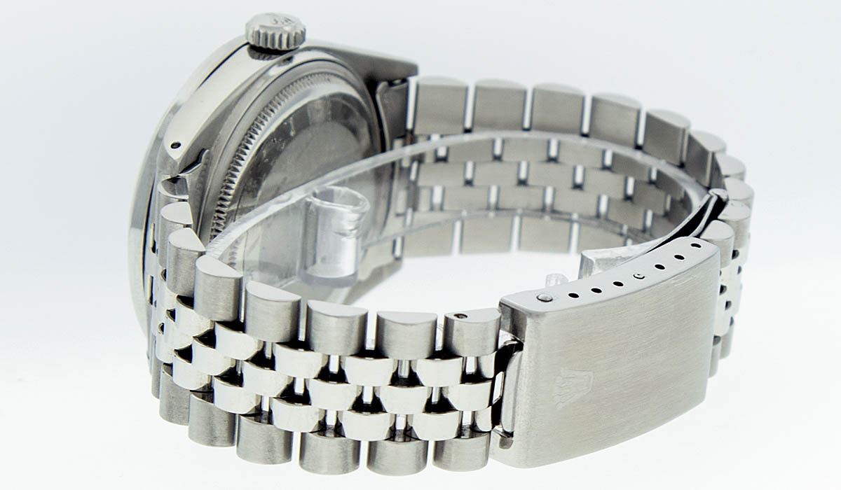 One Mens Rolex Datejust Polished Bright with Satin Finish, Serviced & Electronically Tested, Stainless Steel Case:36mm, Stainless Steel Crown, Custom Bezel: Stainless Steel Beadset Diamond Bezel, Diamond Count: 54 Diamonds Total Weight 1.00 Carat, Clarity: SI-VS, Color: G to H. Custom Crystal: Synthetic Sapphire Cyclops Lens. Movement: Automatic Winding Movement Caliber 3035. Custom Dial: Dark Rhodium String Diamond Dial, Diamond Count: 58 Diamonds In Dial, Color: G to H, Clarity: VS2-SI1. Date Window: 3 O'Clock Position Date Display, Quickset, Model: Datejust. Condition: G-6 Extra Fine. Bracelet:Stainless Steel Jubilee. Bright Polish & Satin Finish. 7.0 Inch Length, Adjustable. Standard Clasp, With Rolex Logo. This watch has been serviced time tested and is in excellent condition it is free of all scratches and dents.