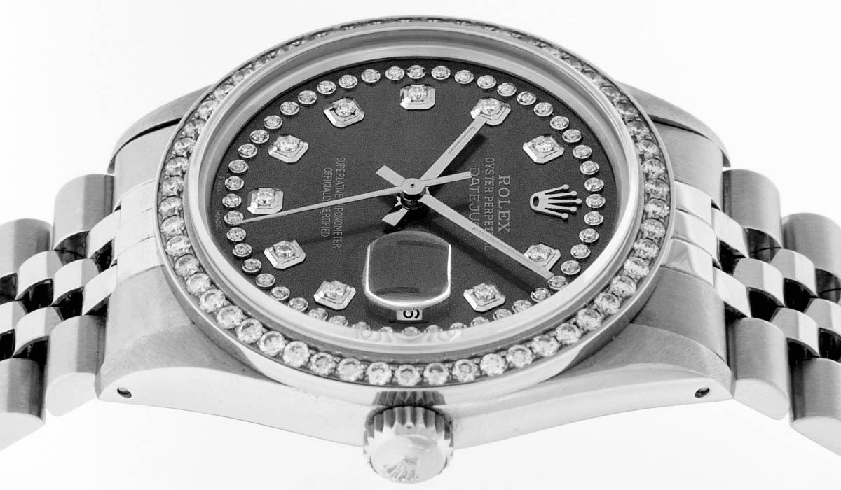 One Mens Rolex Datejust Polished Bright with Satin Finish, Serviced & Electronically Tested, Stainless Steel Case:36mm, Stainless Steel Crown, Custom Bezel: Stainless Steel Beadset Diamond Bezel, Diamond Count: 54 Diamonds Total Weight 1.00 Carat, Clarity: SI-VS, Color: G to H. Custom Crystal: Synthetic Sapphire Cyclops Lens. Movement: Automatic Winding Movement Caliber 3035. Custom Dial: Dark Rhodium String Diamond Dial, Diamond Count: 58 Diamonds In Dial, Color: G to H, Clarity: VS2-SI1. Date Window: 3 O'Clock Position Date Display, Quickset, Model: Datejust. Condition: G-6 Extra Fine. Bracelet:Stainless Steel Jubilee. Bright Polish & Satin Finish. 7.0 Inch Length, Adjustable. Standard Clasp, With Rolex Logo. This watch has been serviced time tested and is in excellent condition it is free of all scratches and dents.
