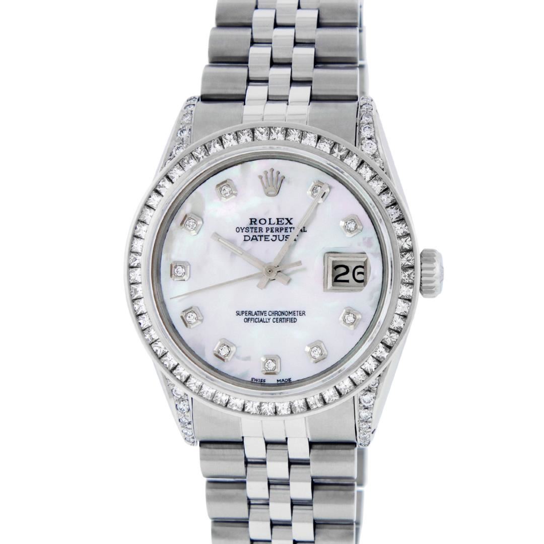 One Mens Pre Owned Rolex Datejust Polished Bright with Satin Finish, Serviced And Electronically Tested, Stainless Steel Case: 36mm, Custom Diamond Lugs: 28 Diamonds In Lugs. Stainless Steel Crown, Custom Bezel: New 14K White Gold 2.75 Carat Princess Cut Diamond Bezel, Diamond Count: 53 Diamonds, Total Weight 2.75 Carat. Custom Crystal: New Sapphire With Date Window. Custom Hands: New Luminescent Hands. Rolex Movement: Automatic Winding Movement 3035. Custom Dial: Custom White Dial With Added Diamond Hour Markers, Diamond Count: 10 Diamonds In Dial. Date Window: 3 O'Clock Position Date Display, Quickset, Model: Datejust Condition: G-6 Extra Fine. Rolex Bracelet: Stainless Steel Jubilee Band. Bright Polish And Satin Finish. 7.0 Inch Length, Adjustable. Standard Clasp, With Rolex Logo. This Watch Has Been Serviced And Polished And Its Free Of All Dents And Scratches.