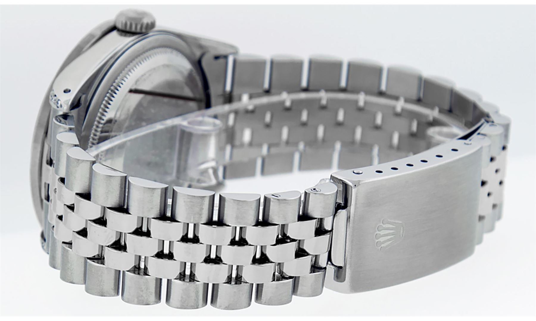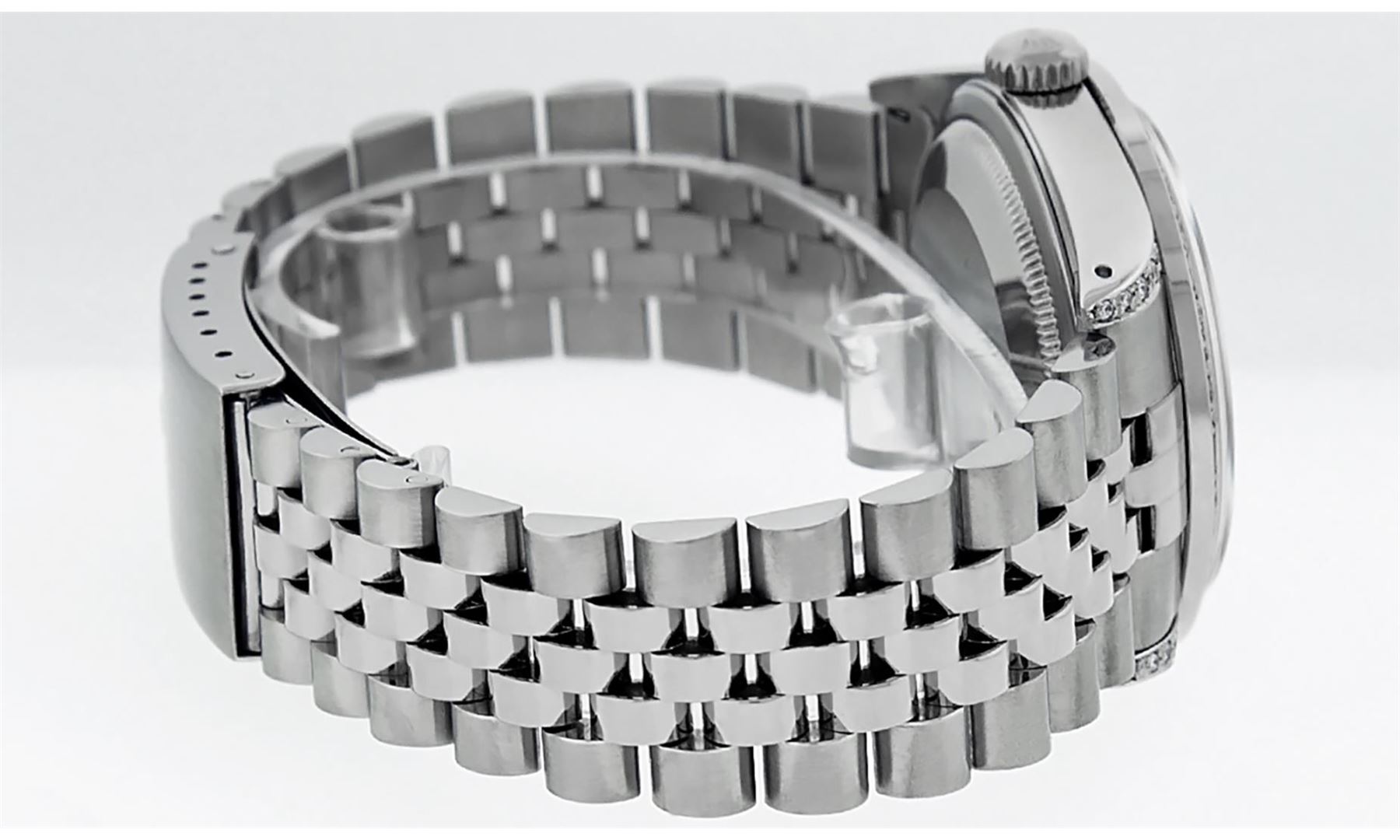 One Mens Pre Owned Rolex Datejust Polished Bright with Satin Finish, Serviced And Electronically Tested, Rolex Stainless Steel Case: 36mm, Custom Diamonds On Lugs: 28 Diamonds On Lugs. Custom Bezel: New 18K White Gold Pyramid Diamond Bezel, Diamond Count: 24 Diamonds On Bezel. Custom Crystal: New Sapphire With Magnified Date Window. Custom Hands: New Solid Hands. Rolex Movement: Automatic Winding Movement 3035. Custom Dial: Custom White Dial With Added Diamond Hour Markers, Diamond Count: 10 Diamonds On Dial. Date Window: 3 O'Clock Position Date Display, Quickset, Model: Datejust Condition: G-6 Extra Fine. Rolex Bracelet: Stainless Steel Jubilee Band. Bright Polish And Satin Finish. 7.0 Inch Length, Adjustable. Standard Clasp, With Rolex Logo. This Watch Has Been Serviced And Polished And Its Free Of All Dents And Scratches.