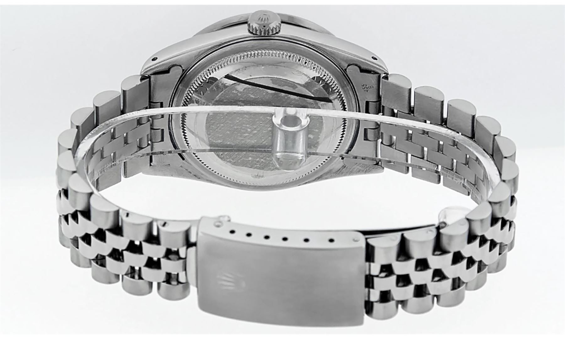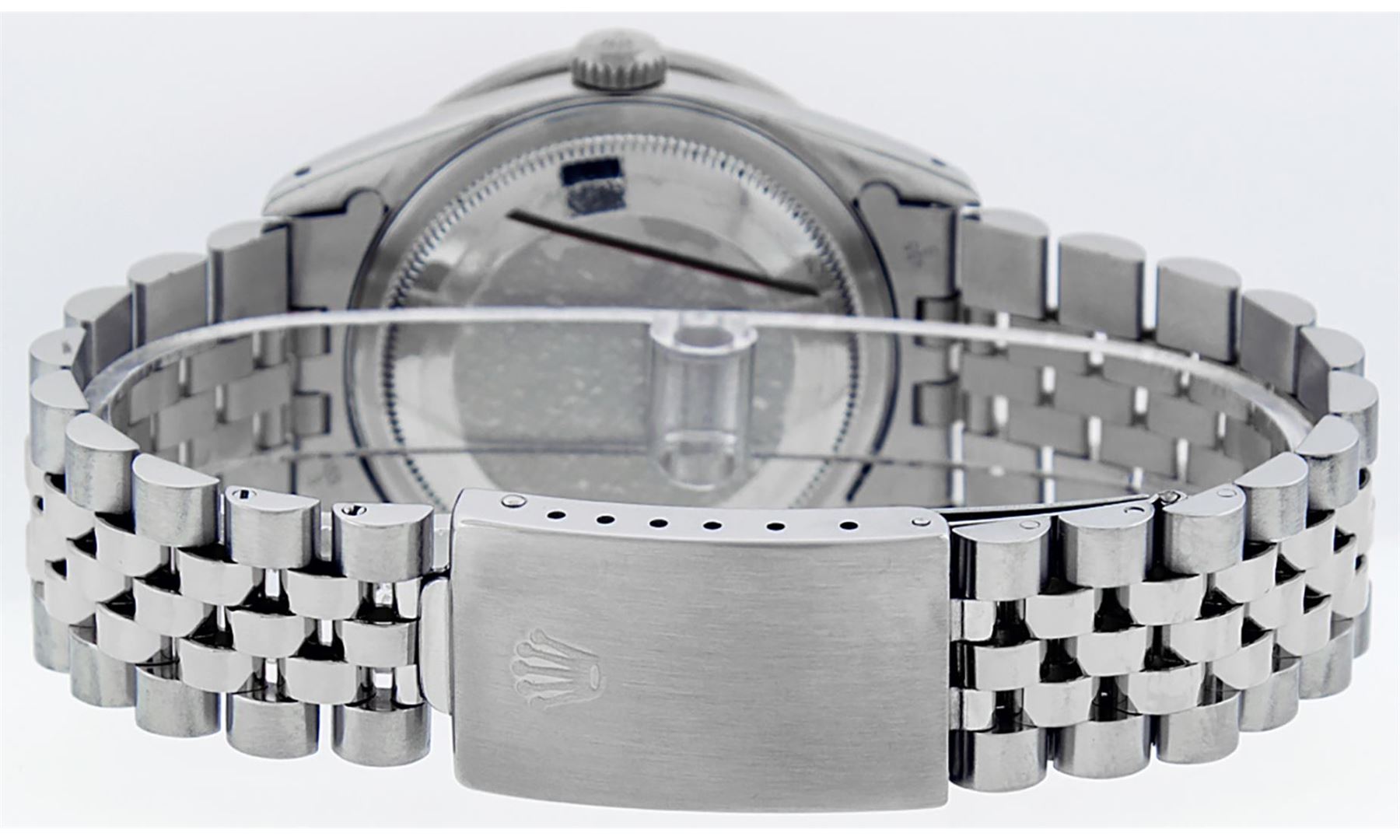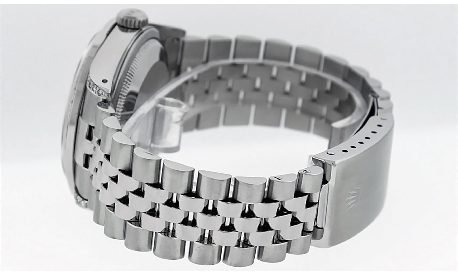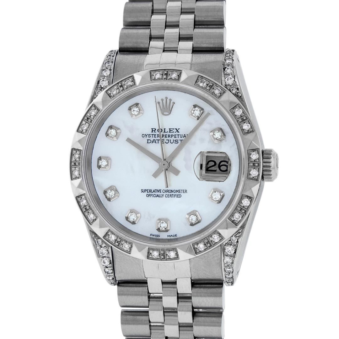 One Mens Pre Owned Rolex Datejust Polished Bright with Satin Finish, Serviced And Electronically Tested, Rolex Stainless Steel Case: 36mm, Custom Diamonds On Lugs: 28 Diamonds On Lugs. Custom Bezel: New 18K White Gold Pyramid Diamond Bezel, Diamond Count: 24 Diamonds On Bezel. Custom Crystal: New Sapphire With Magnified Date Window. Custom Hands: New Solid Hands. Rolex Movement: Automatic Winding Movement 3035. Custom Dial: Custom White Dial With Added Diamond Hour Markers, Diamond Count: 10 Diamonds On Dial. Date Window: 3 O'Clock Position Date Display, Quickset, Model: Datejust Condition: G-6 Extra Fine. Rolex Bracelet: Stainless Steel Jubilee Band. Bright Polish And Satin Finish. 7.0 Inch Length, Adjustable. Standard Clasp, With Rolex Logo. This Watch Has Been Serviced And Polished And Its Free Of All Dents And Scratches.