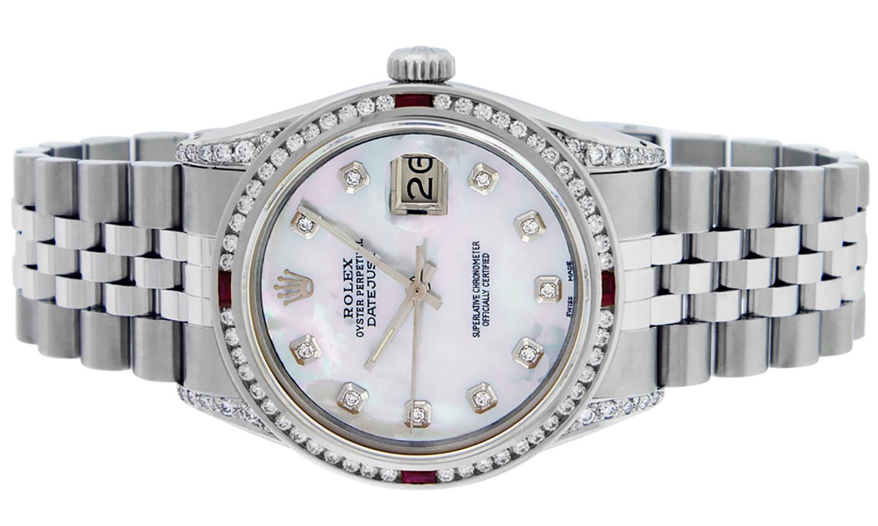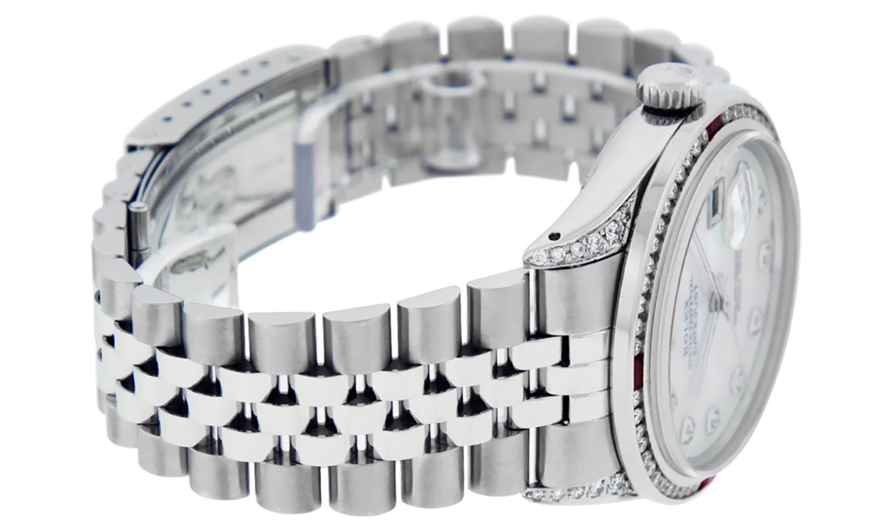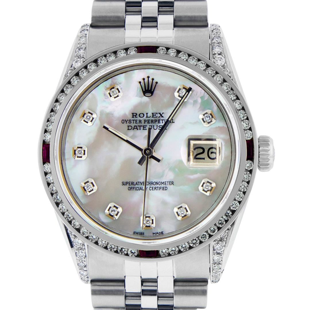 One Mens Rolex Datejust Polished Bright with Satin Finish, Serviced And Electronically Tested, Stainless Steel Case: 36mm, Custom Diamond Lugs: 28 Diamonds In Lugs. Stainless Steel Crown, Custom Bezel: New 18K White Gold Ruby Channel Set Diamond Bezel, Diamond + Gem Count: 52 Diamonds + 4 Rubies. Custom Crystal: New Sapphire With Magnified Date Window. Custom Hands: New Luminescent Hands. Rolex Movement: Automatic Winding Movement 3035. Custom Dial: Custom White Dial With Added Diamond Hour Markers, Diamond Count: 10 Diamonds In Dial. Date Window: 3 O'Clock Position Date Display, Quickset, Model: Datejust Condition: G-6 Extra Fine. Rolex Bracelet: Stainless Steel Jubilee Band. Bright Polish And Satin Finish. 7.0 Inch Length, Adjustable. Standard Clasp, With Rolex Logo. This Watch Has Been Serviced And Polished And Its Free Of All Dents And Scratches.
