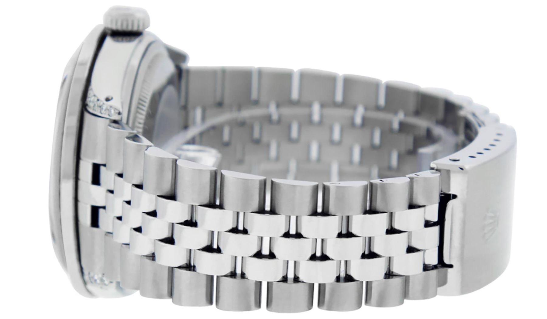 One Mens Rolex Datejust Polished Bright with Satin Finish, Serviced And Electronically Tested, Stainless Steel Case: 36mm, Custom Diamond Lugs: 28 Diamonds In Lugs. Stainless Steel Crown, Custom Bezel: New 18K White Gold Ruby Channel Set Diamond Bezel, Diamond + Gem Count: 52 Diamonds + 4 Rubies. Custom Crystal: New Sapphire With Magnified Date Window. Custom Hands: New Luminescent Hands. Rolex Movement: Automatic Winding Movement 3035. Custom Dial: Custom White Dial With Added Diamond Hour Markers, Diamond Count: 10 Diamonds In Dial. Date Window: 3 O'Clock Position Date Display, Quickset, Model: Datejust Condition: G-6 Extra Fine. Rolex Bracelet: Stainless Steel Jubilee Band. Bright Polish And Satin Finish. 7.0 Inch Length, Adjustable. Standard Clasp, With Rolex Logo. This Watch Has Been Serviced And Polished And Its Free Of All Dents And Scratches.