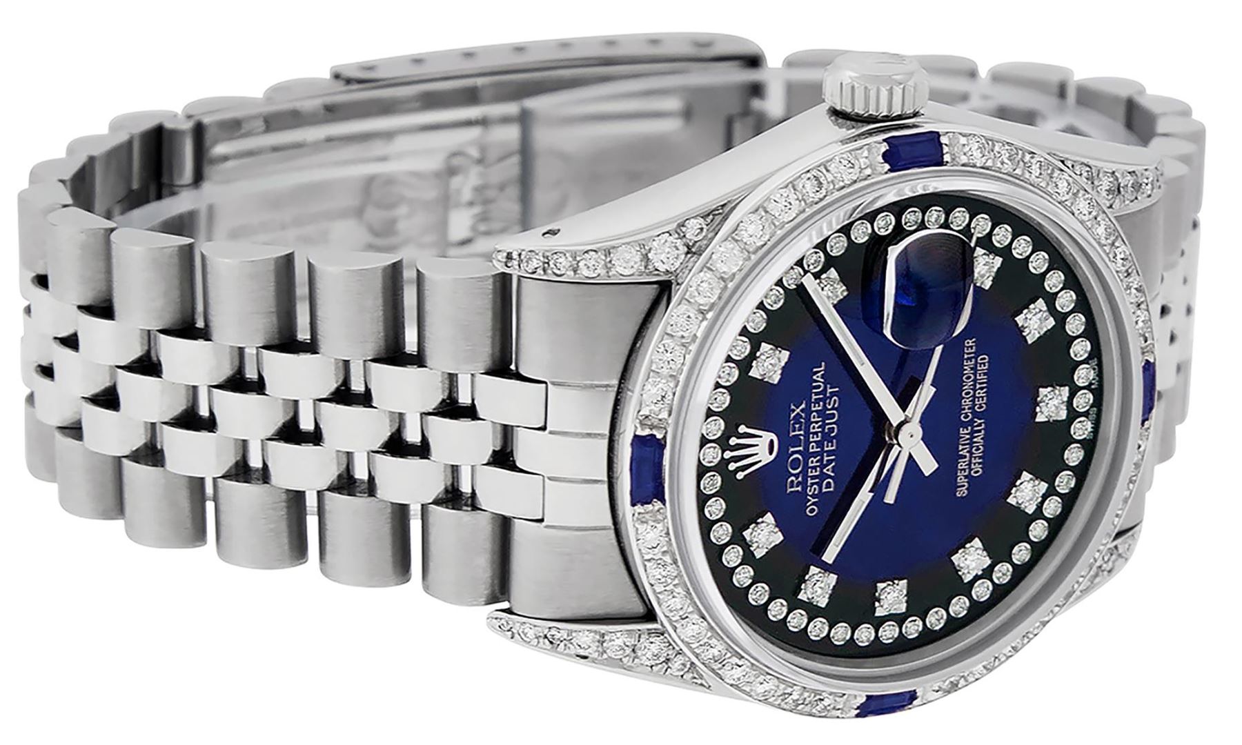 One Mens Pre Owned Stainless Steel Rolex Datejust Polished Bright with Satin Finish, Rolex Stainless Steel Case: 36mm, Custom Diamond Lugs: 28 Diamonds On Lugs. Rolex Stainless Steel Crown, Custom Bezel: 18K White Gold Diamond + Sapphire Beadset, Diamond Count: 36 Diamonds + 4 Sapphires. Custom Crystal: New Sapphire With Magnified Date Window. Custom Hands: New Luminescent Hands. Rolex Movement: Automatic Winding Movement 3035. Custom Dial: Custom Blue Vignette Dial With Custom Added Diamonds, Stone Count: 58 Diamonds In Dial. Date Window: 3 O'Clock Position Date Display, Quickset, Model: Datejust Condition: G-6 Extra Fine. Rolex Bracelet: Stainless Steel Jubilee Band. Bright Polish & Satin Finish. 7.0 Inch Length, Adjustable. Standard Clasp, With Rolex Logo. This Watch Has Been Serviced And Polished And Its Free Of All Dents And Scratches.