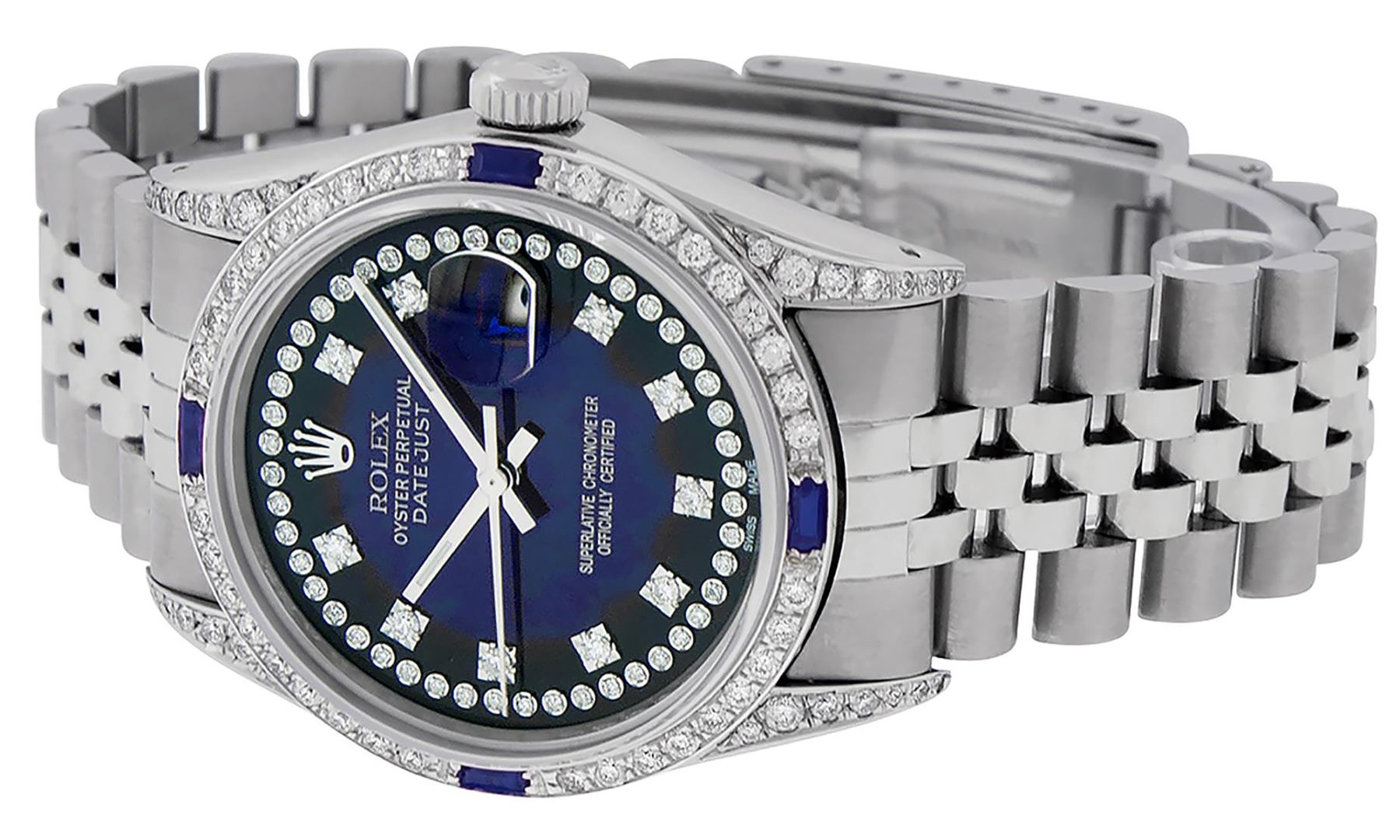 One Mens Pre Owned Stainless Steel Rolex Datejust Polished Bright with Satin Finish, Rolex Stainless Steel Case: 36mm, Custom Diamond Lugs: 28 Diamonds On Lugs. Rolex Stainless Steel Crown, Custom Bezel: 18K White Gold Diamond + Sapphire Beadset, Diamond Count: 36 Diamonds + 4 Sapphires. Custom Crystal: New Sapphire With Magnified Date Window. Custom Hands: New Luminescent Hands. Rolex Movement: Automatic Winding Movement 3035. Custom Dial: Custom Blue Vignette Dial With Custom Added Diamonds, Stone Count: 58 Diamonds In Dial. Date Window: 3 O'Clock Position Date Display, Quickset, Model: Datejust Condition: G-6 Extra Fine. Rolex Bracelet: Stainless Steel Jubilee Band. Bright Polish & Satin Finish. 7.0 Inch Length, Adjustable. Standard Clasp, With Rolex Logo. This Watch Has Been Serviced And Polished And Its Free Of All Dents And Scratches.