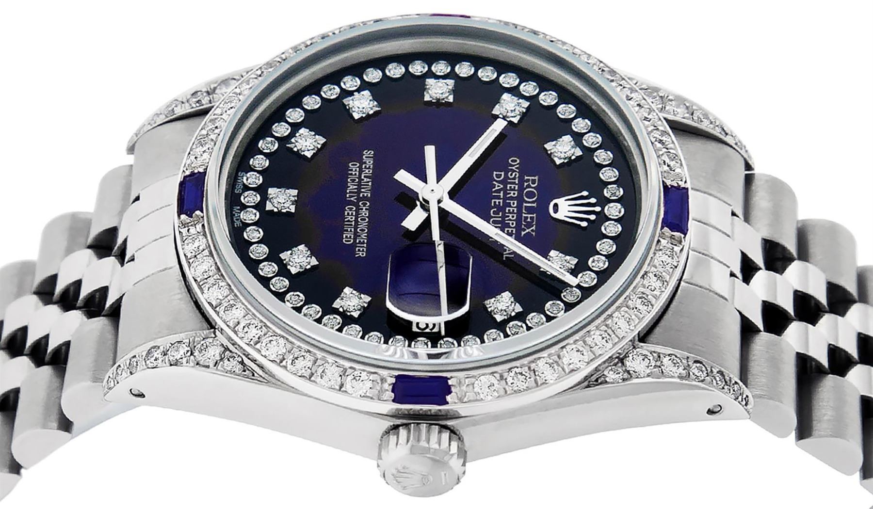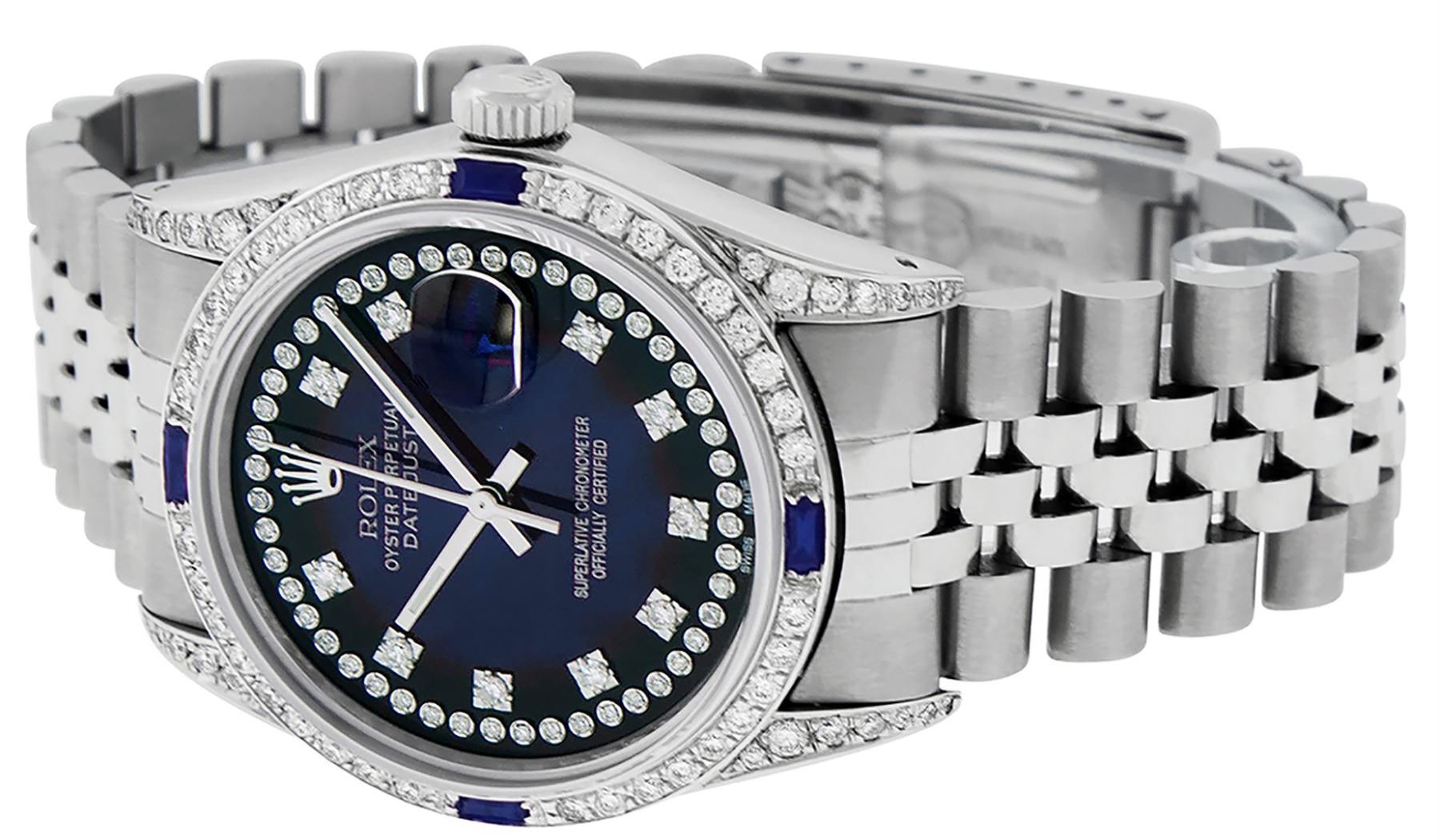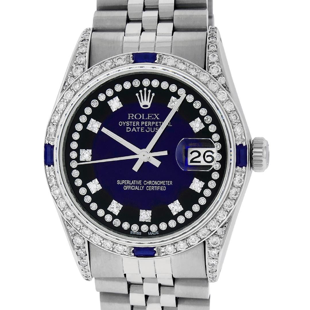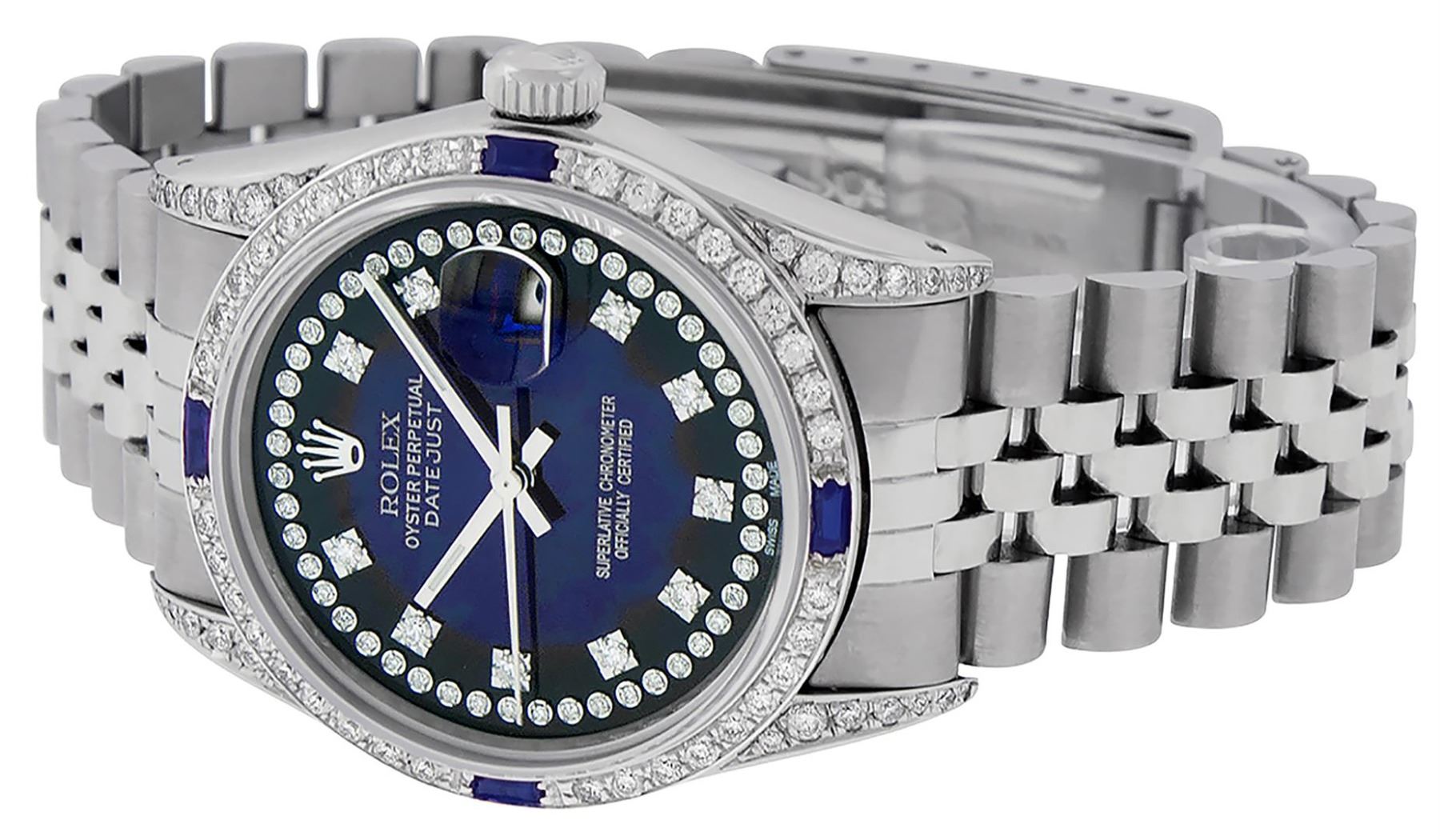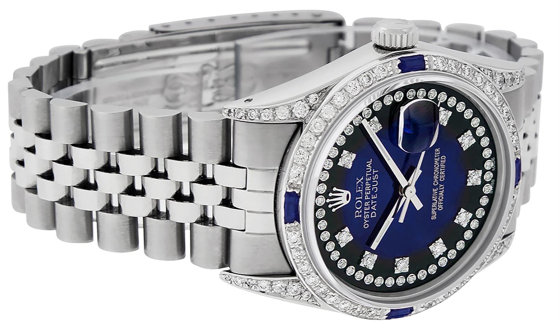 One Mens Rolex Datejust Polished Bright with Satin Finish, Serviced & Electronically Tested, Stainless Steel Case: 36mm, Custom Diamond Lugs: 28 Diamonds In Lugs, Color: G to H, Clarity: SI-VS. Stainless Steel Crown, Custom Bezel: 18K White Gold Diamond + Sapphire Beadset, Diamond Count: 36 Diamonds + 4 Sapphires, Total Weight 1.00 Carat, Clarity: SI-VS, Color: G to H. Custom Crystal: New Scratch Resistant Synthetic Sapphire Cyclops Lens. Custom Hands: New Luminescent Hands. Movement: Automatic Winding Movement. Custom Dial: Blue Vignette String Diamond Dial, Stone Count: 58 Diamonds In Dial, Diamond Color: G To H In Color, Clarity: VS. Date Window: 3 O'Clock Position Date Display, Quickset, Model: Datejust Condition: G-6 Extra Fine. Bracelet: Stainless Steel Jubilee Band. Bright Polish & Satin Finish. 7.0 Inch Length, Adjustable. Standard Clasp, With Rolex Logo. This Watch Has Been Serviced And Polished And Its Free Of All Dents And Scratches.