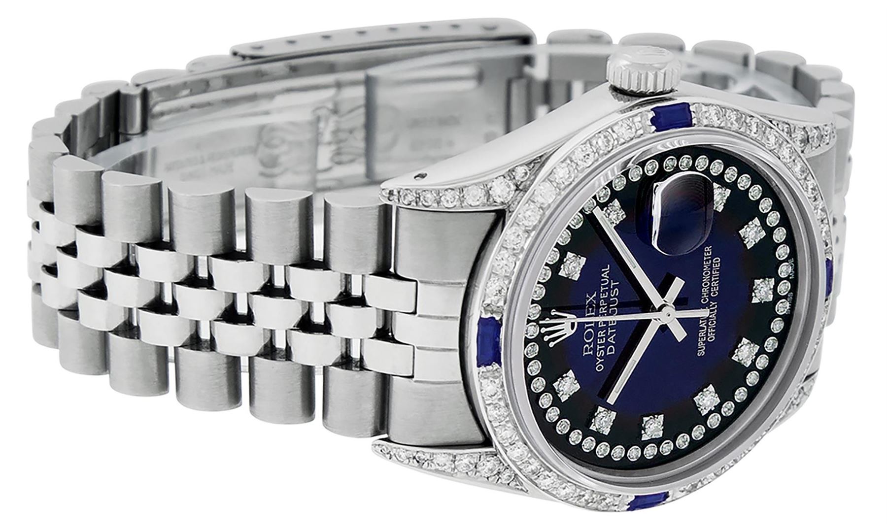 One Mens Pre Owned Rolex Datejust Polished Bright with Satin Finish, Serviced & Electronically Tested, Rolex Stainless Steel Case: 36mm, Custom Diamond Lugs: 28 Diamonds In Lugs, Color: G to H, Clarity: SI-VS. Rolex Stainless Steel Crown, Custom Bezel: 18K White Gold Diamond + Sapphire Beadset, Diamond Count: 36 Diamonds + 4 Sapphires, Total Weight 1.00 Carat, Clarity: SI-VS, Color: G to H. Custom Crystal: New Sapphire Magnified Date Window. Custom Hands: New Luminescent Hands. Rolex Movement: Automatic Winding Movement. Custom Dial: Refinished Blue Vignette String Diamond Dial, Stone Count: 58 Diamonds In Dial, Diamond Color: G To H In Color, Clarity: VS. Date Window: 3 O'Clock Position Date Display, Quickset, Model: Datejust Condition: G-6 Extra Fine. Rolex Bracelet: Stainless Steel Jubilee Band. Bright Polish & Satin Finish. 7.0 Inch Length, Adjustable. Standard Clasp, With Rolex Logo. This Watch Has Been Serviced And Polished And Its Free Of All Dents And Scratches.