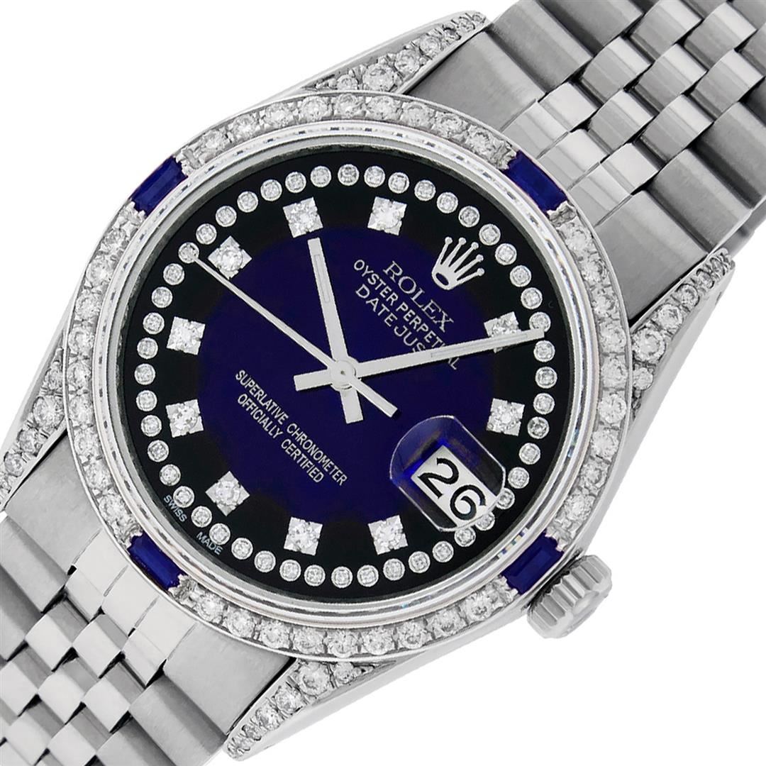 One Mens Pre Owned Rolex Datejust Polished Bright with Satin Finish, Serviced & Electronically Tested, Rolex Stainless Steel Case: 36mm, Custom Diamond Lugs: 28 Diamonds In Lugs, Color: G to H, Clarity: SI-VS. Rolex Stainless Steel Crown, Custom Bezel: 18K White Gold Diamond + Sapphire Beadset, Diamond Count: 36 Diamonds + 4 Sapphires, Total Weight 1.00 Carat, Clarity: SI-VS, Color: G to H. Custom Crystal: New Sapphire Magnified Date Window. Custom Hands: New Luminescent Hands. Rolex Movement: Automatic Winding Movement. Custom Dial: Refinished Blue Vignette String Diamond Dial, Stone Count: 58 Diamonds In Dial, Diamond Color: G To H In Color, Clarity: VS. Date Window: 3 O'Clock Position Date Display, Quickset, Model: Datejust Condition: G-6 Extra Fine. Rolex Bracelet: Stainless Steel Jubilee Band. Bright Polish & Satin Finish. 7.0 Inch Length, Adjustable. Standard Clasp, With Rolex Logo. This Watch Has Been Serviced And Polished And Its Free Of All Dents And Scratches.