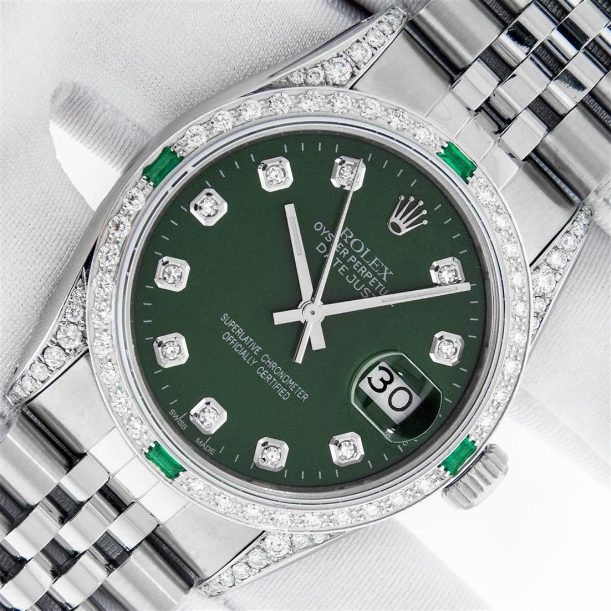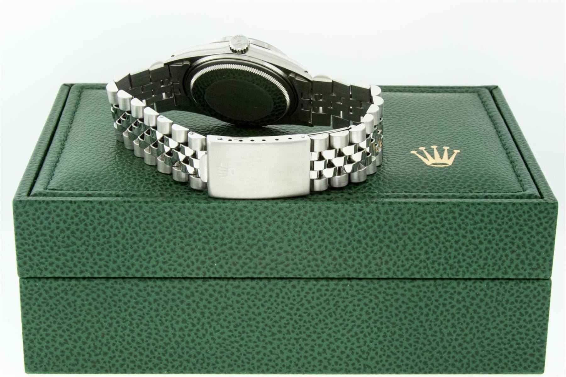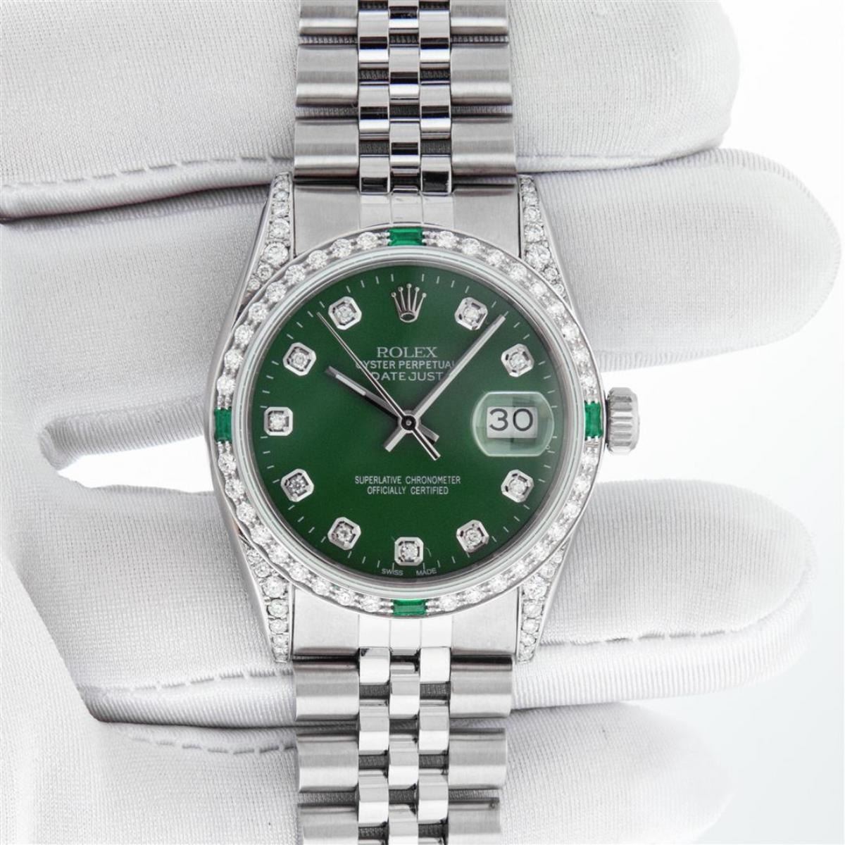 One Mens Rolex Datejust Polished Bright with Satin Finish, Serviced & Electronically Tested, Stainless Steel Case: 36mm, Custom Diamond Lugs: 28 Diamonds In Lugs, Color: G to H, Clarity: SI-VS. Stainless Steel Crown, Custom Bezel: 18K White Gold Diamond +