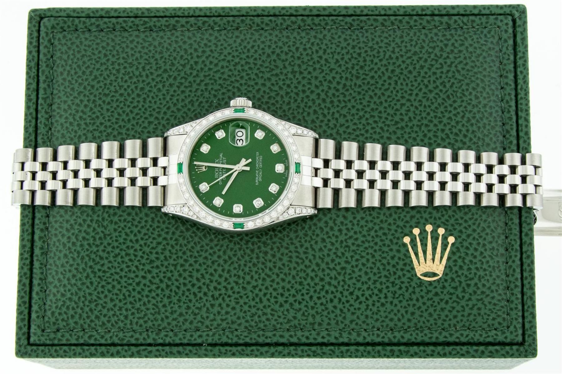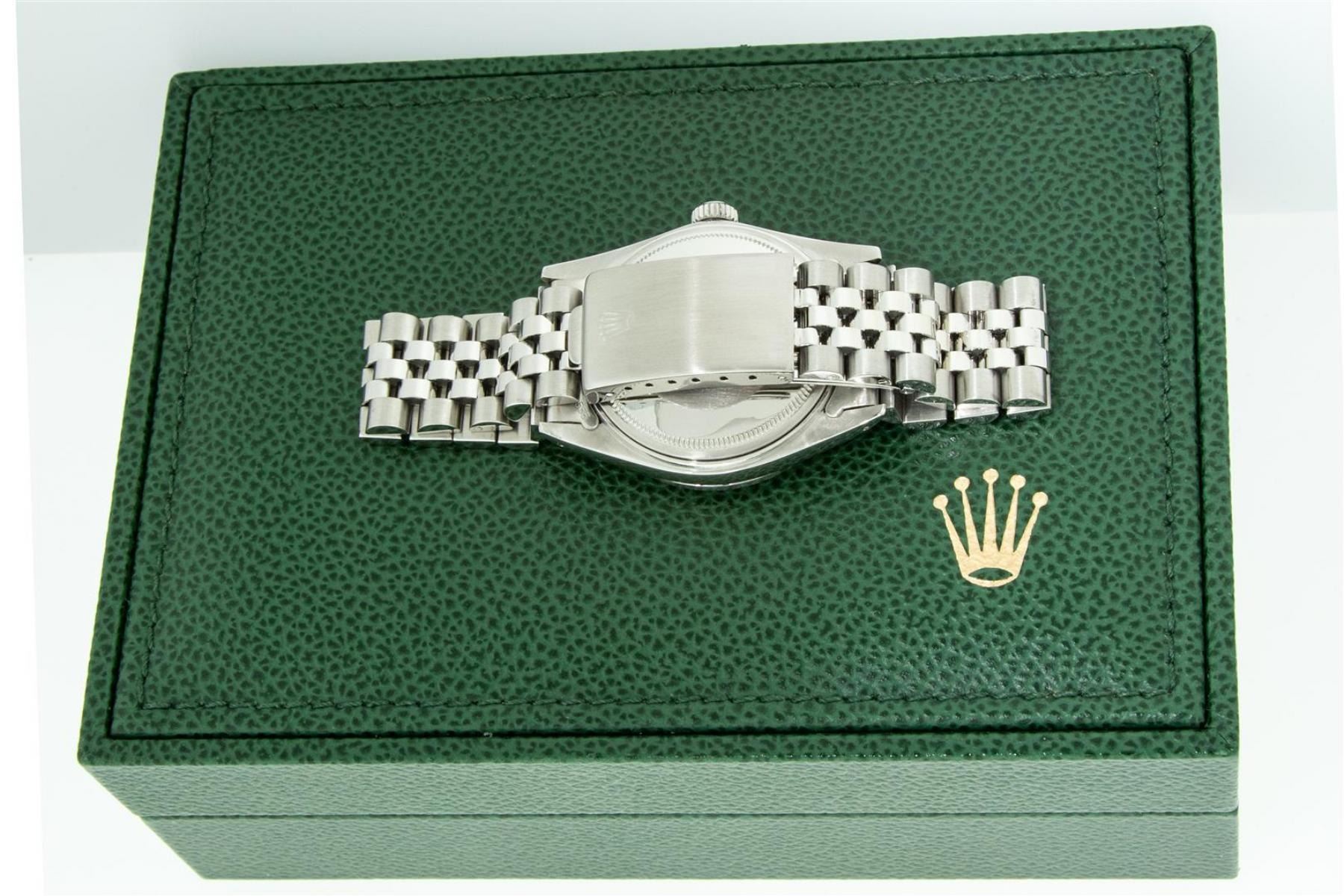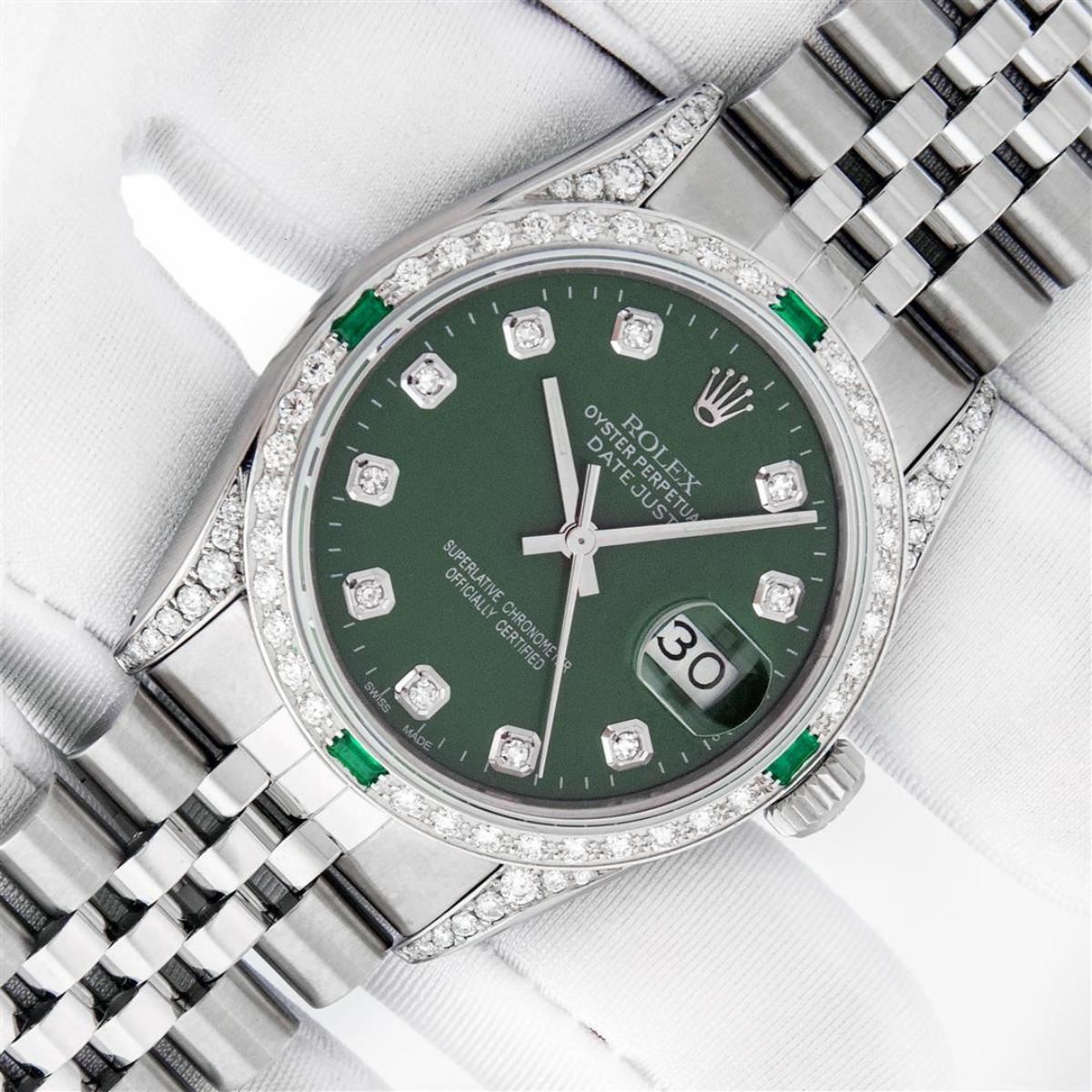 One Mens Rolex Datejust Polished Bright with Satin Finish, Serviced & Electronically Tested, Stainless Steel Case: 36mm, Custom Diamond Lugs: 28 Diamonds In Lugs, Color: G to H, Clarity: SI-VS. Stainless Steel Crown, Custom Bezel: 18K White Gold Diamond +