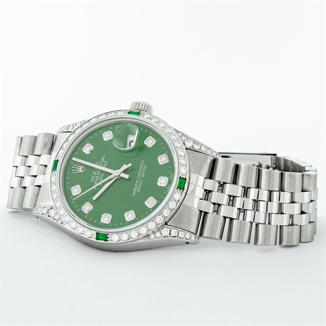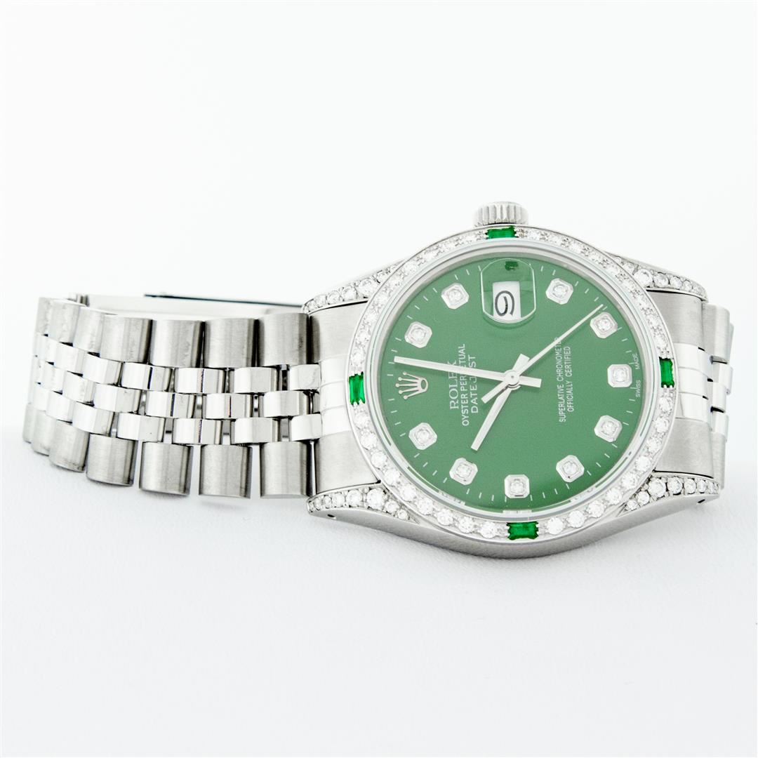 One Mens Rolex Datejust Polished Bright with Satin Finish, Serviced & Electronically Tested, Stainless Steel Case: 36mm, Custom Diamond Lugs: 28 Diamonds In Lugs, Color: G to H, Clarity: SI-VS. Stainless Steel Crown, Custom Bezel: 18K White Gold Diamond + Emerald Beadset, Diamond Count: 36 Diamonds + 4 Emeralds, Total Weight 1.00 Carat, Clarity: SI-VS, Color: G to H. Custom Crystal: New Scratch Resistant Synthetic Sapphire Cyclops Lens. Custom Hands: New Luminescent Hands. Movement: Automatic Winding Movement. Custom Dial: Green Diamond Dial With Dash Track, Stone Count: 10 Diamonds, Diamond Color: G To H In Color, Clarity: SI-VS. Date Window: 3 O'Clock Position Date Display, Quickset, Model: Datejust Condition: G-6 Extra Fine. Bracelet: Stainless Steel Jubilee Band. Bright Polish & Satin Finish. 7.0 Inch Length, Adjustable. Standard Clasp, With Rolex Logo. This Watch Has Been Serviced And Polished And Its Free Of All Dents And Scratches.