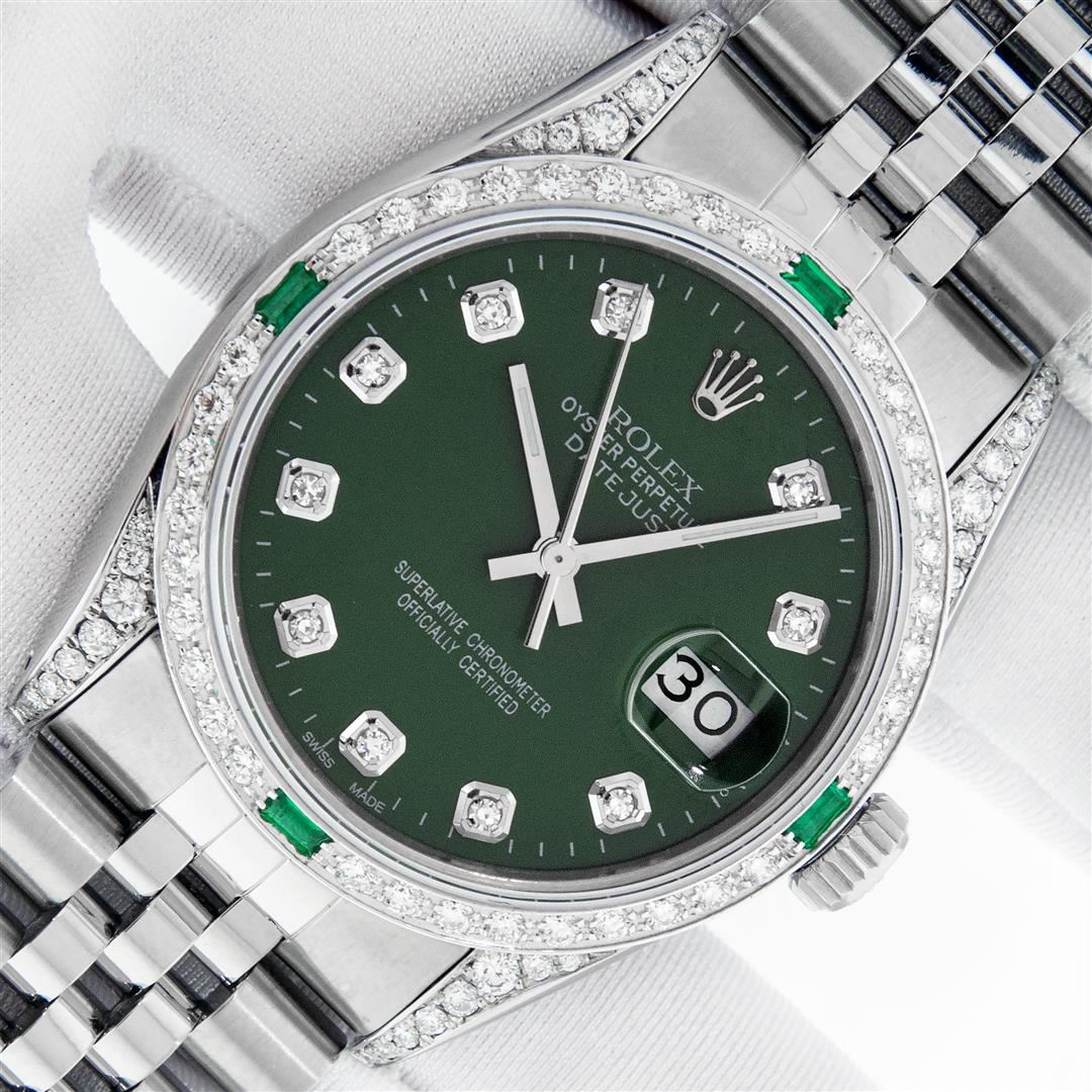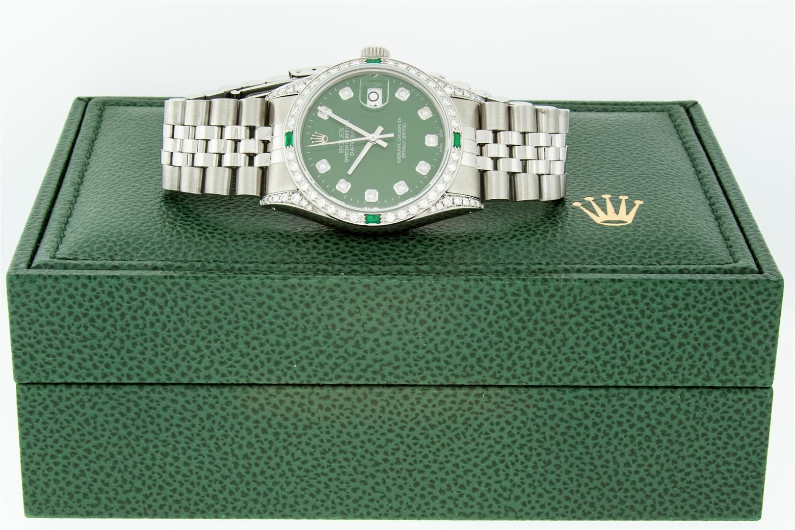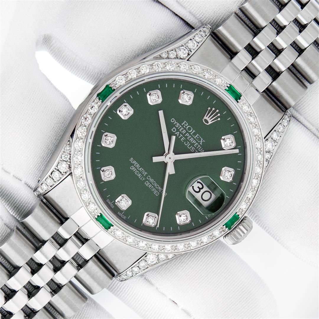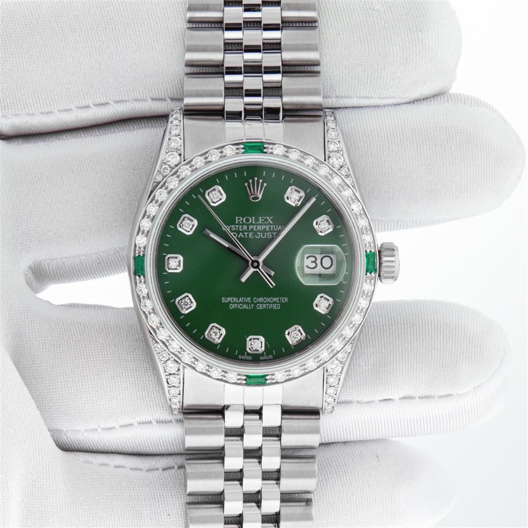 One Mens Rolex Datejust Polished Bright with Satin Finish, Serviced & Electronically Tested, Stainless Steel Case: 36mm, Custom Diamond Lugs: 28 Diamonds In Lugs, Color: G to H, Clarity: SI-VS. Stainless Steel Crown, Custom Bezel: 18K White Gold Diamond + Emerald Beadset, Diamond Count: 36 Diamonds + 4 Emeralds, Total Weight 1.00 Carat, Clarity: SI-VS, Color: G to H. Custom Crystal: New Scratch Resistant Synthetic Sapphire Cyclops Lens. Custom Hands: New Luminescent Hands. Movement: Automatic Winding Movement. Custom Dial: Green Diamond Dial With Dash Track, Stone Count: 10 Diamonds, Diamond Color: G To H In Color, Clarity: SI-VS. Date Window: 3 O'Clock Position Date Display, Quickset, Model: Datejust Condition: G-6 Extra Fine. Bracelet: Stainless Steel Jubilee Band. Bright Polish & Satin Finish. 7.0 Inch Length, Adjustable. Standard Clasp, With Rolex Logo. This Watch Has Been Serviced And Polished And Its Free Of All Dents And Scratches. This Watch Comes With A Rolex Box.